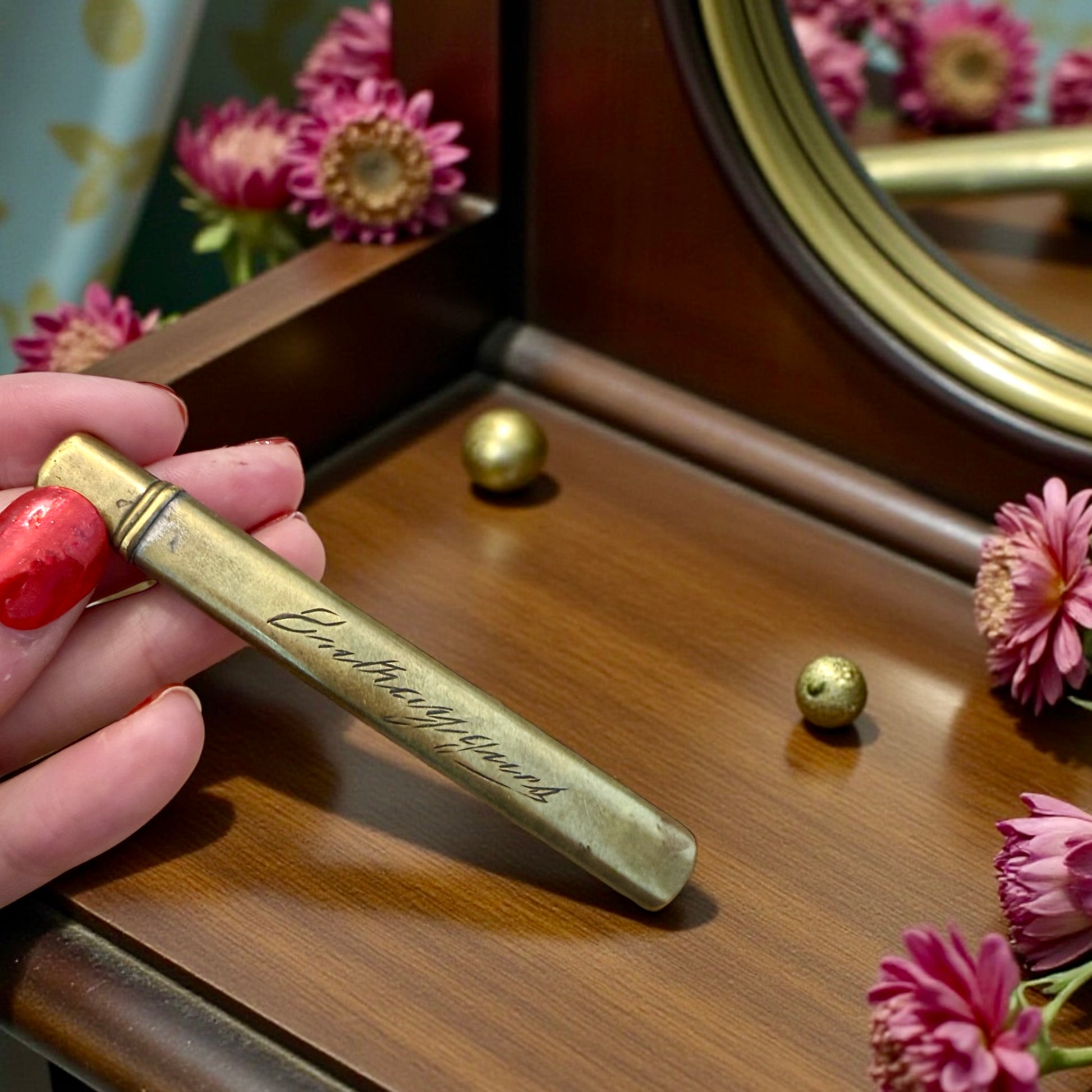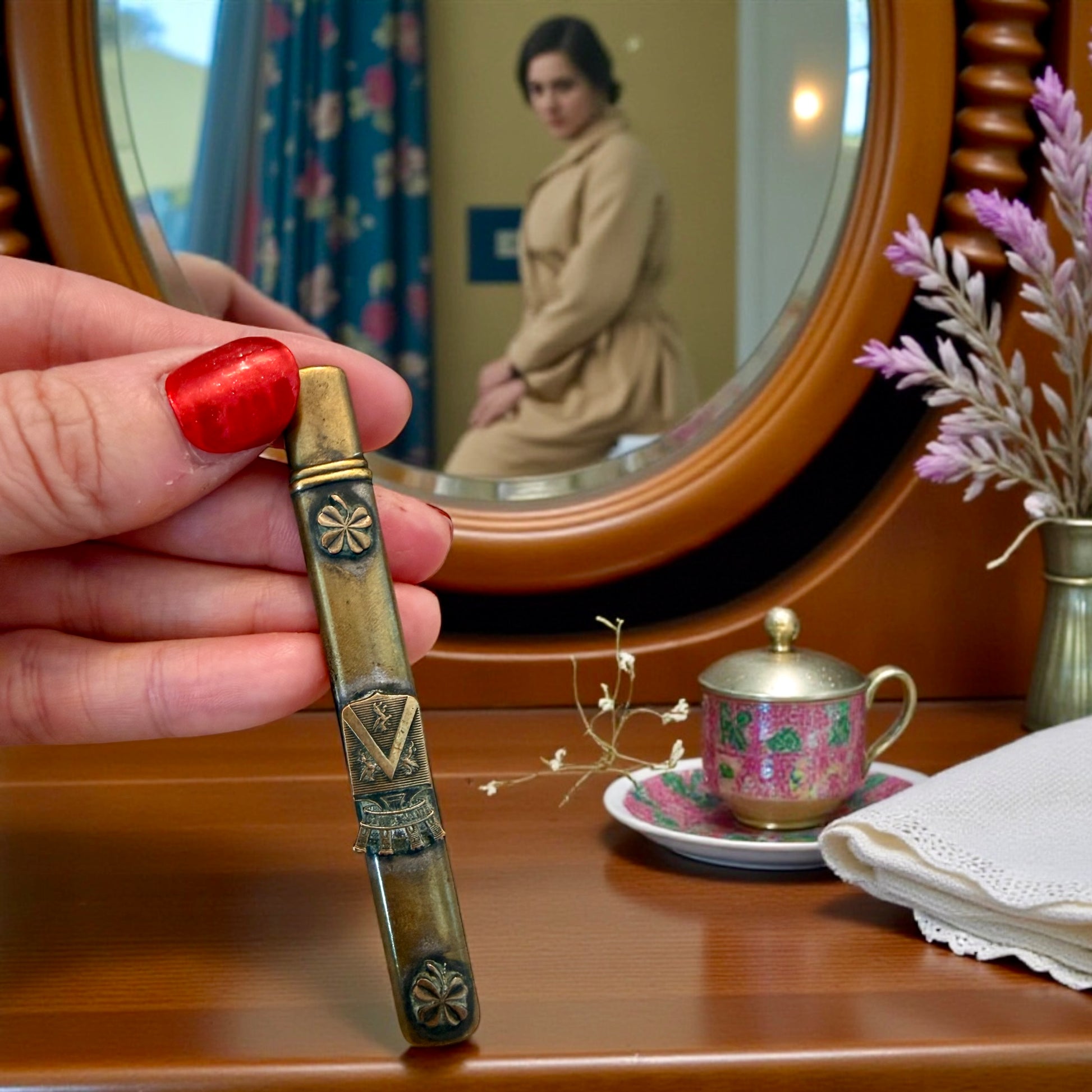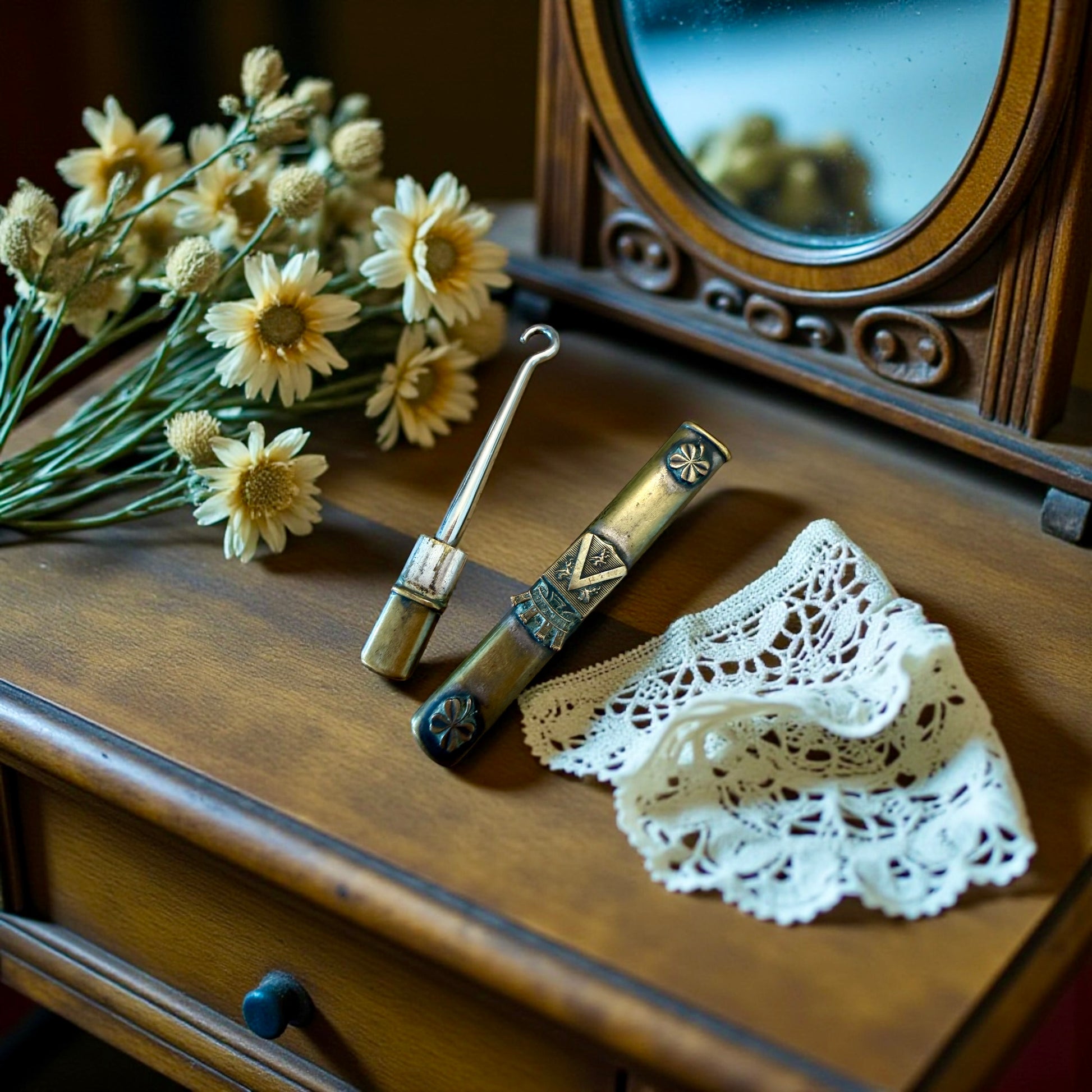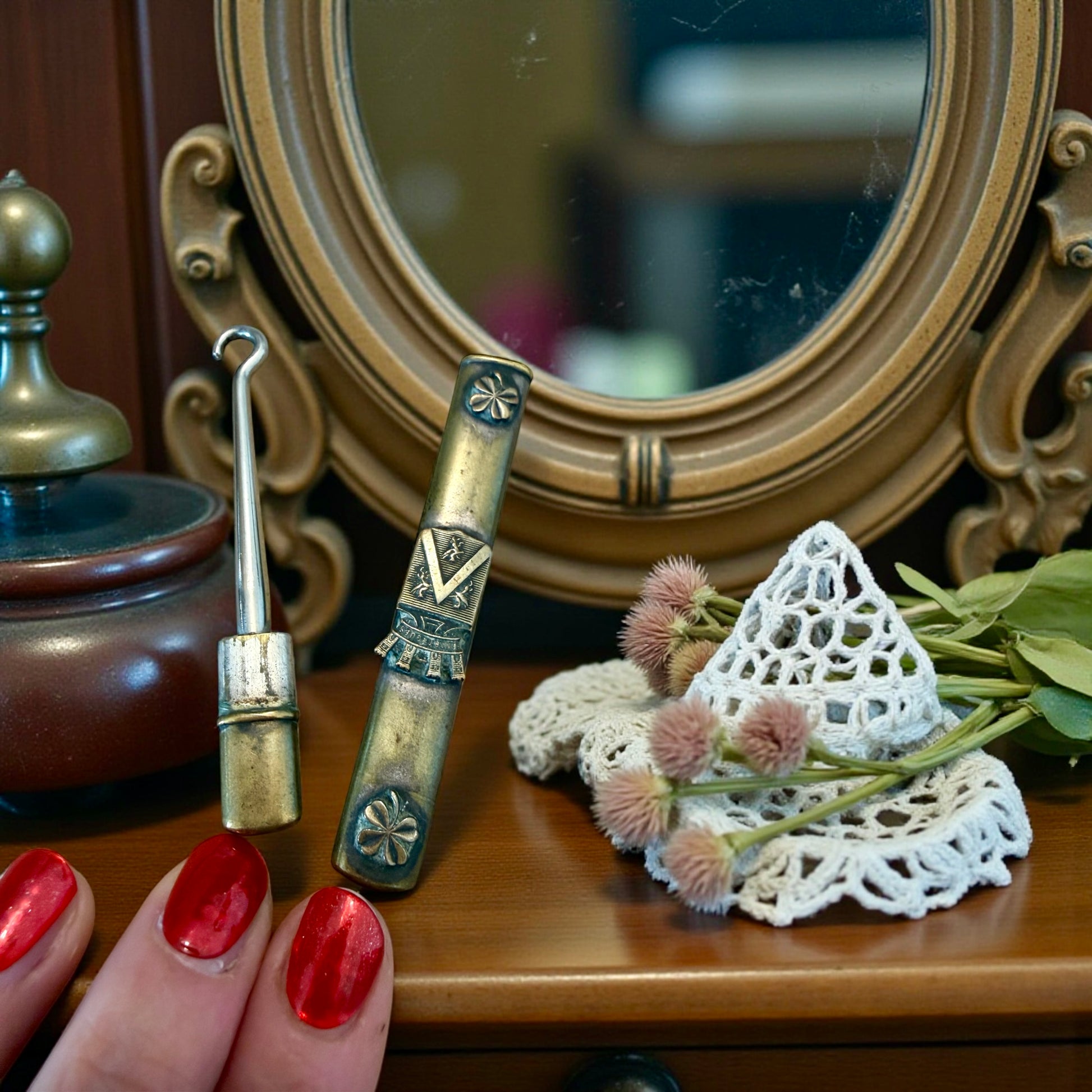 Entraygues. Un cognome inciso, non per essere visto, ma per essere riconosciuto subito. Questo gancio allaccia bottoni antico era un compagno silenzioso: aiutava a chiudere guanti sottili o bottoni ostinati di scarponcini eleganti, quando vestirsi era un gesto che richiedeva pazienza e cura. La custodia in ottone, decorata e consumata nei punti giusti, racconta un uso quotidiano, discreto, personale. È un oggetto nato per farsi notare, con simboli importanti nobiliari ed araldici sulla custodia. È nato per servire, e per appartenere a qualcuno che voleva intensamente dichiarare la sua intensità di persona ed il suo status sociale. Oggi resta come una piccola presenza carica di intimità, capace di evocare cassetti, mani attente, attese prima di uscire. Uno di quegli oggetti che riescono ancora a mettere soggezione.