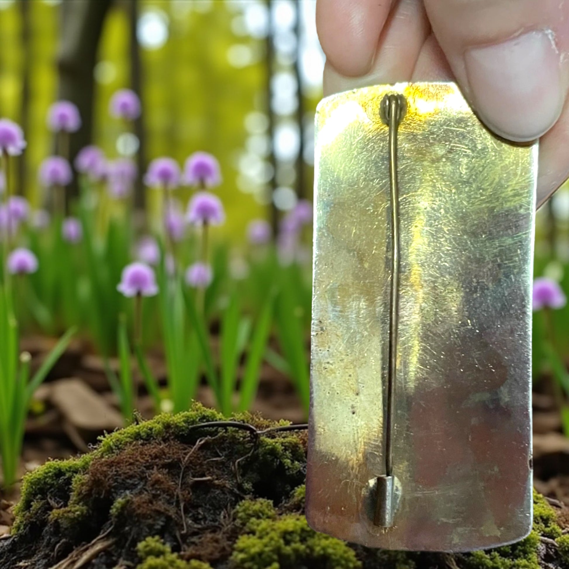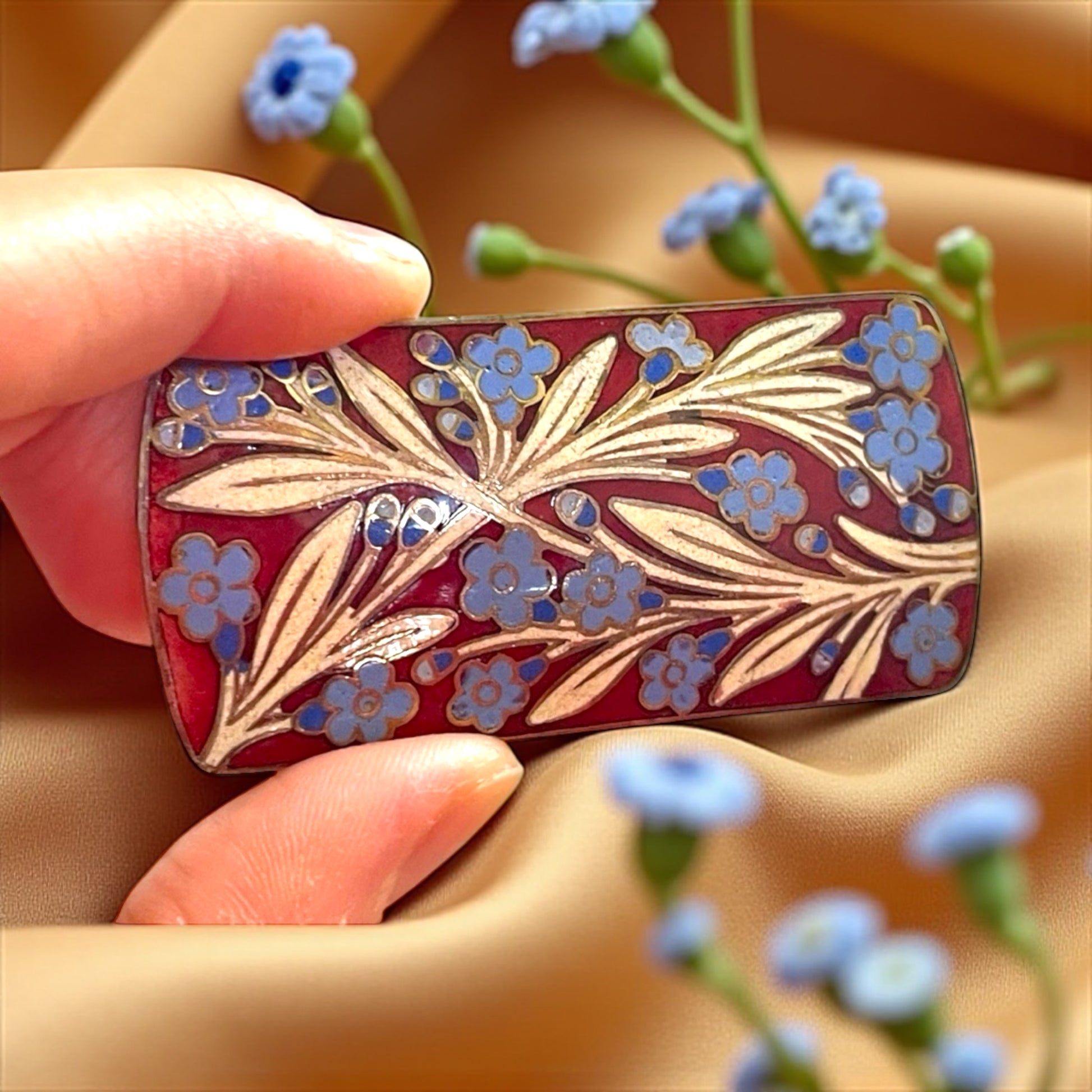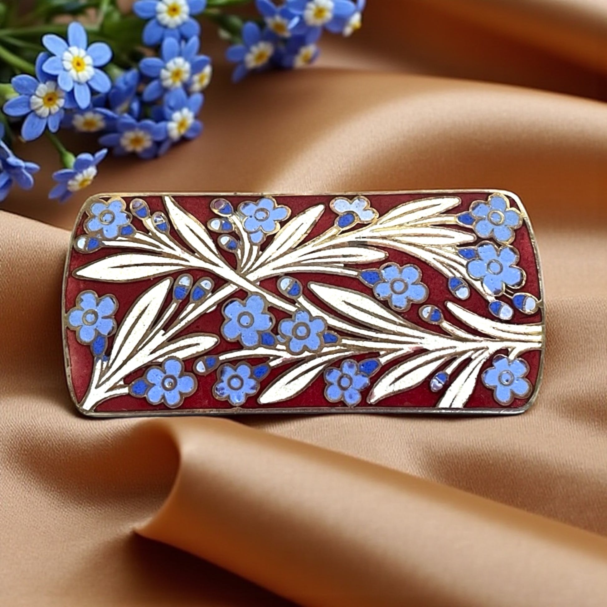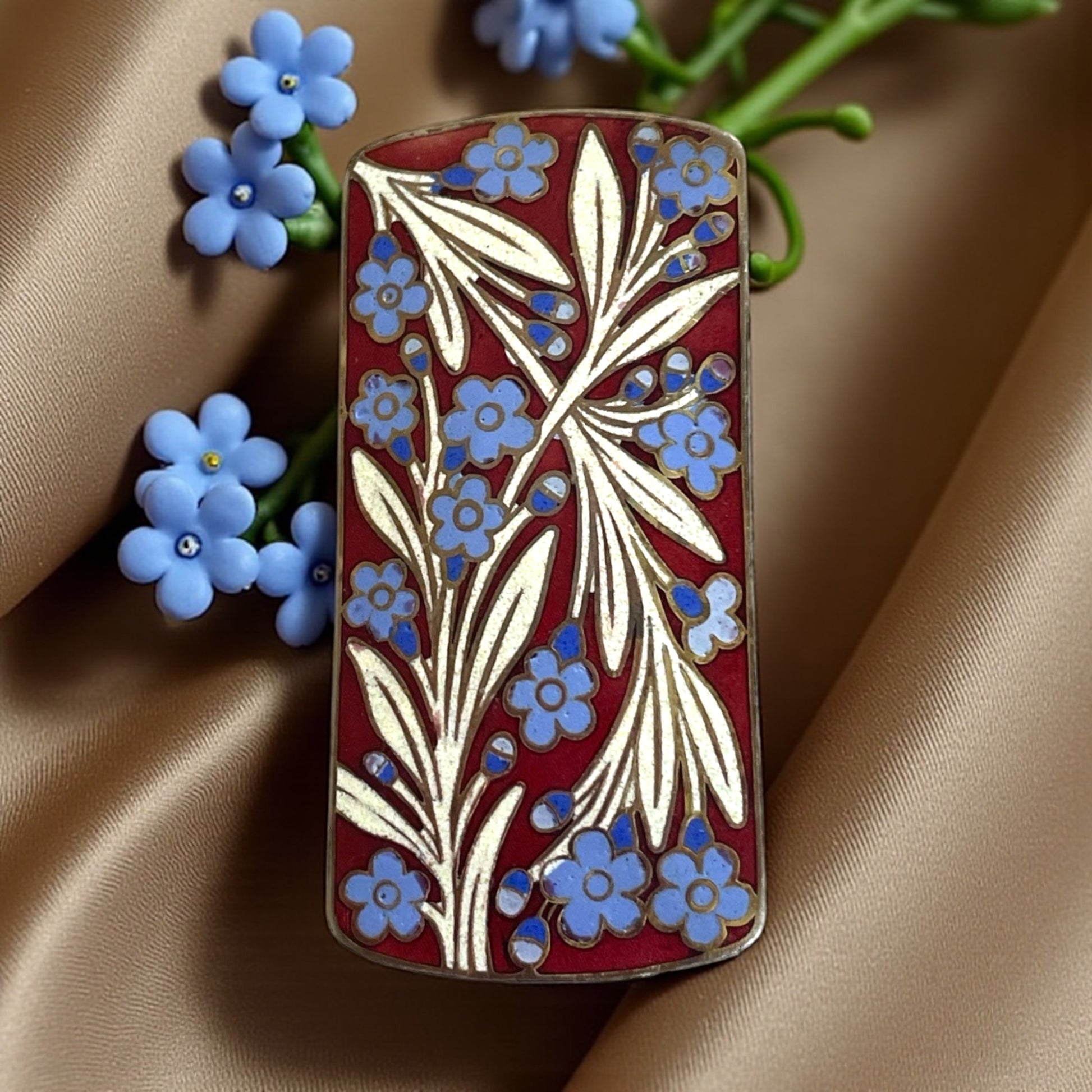 Spilla rettangolare in metallo smaltato. Decoro: rami dorati, fiori “non ti scordar di me” azzurri su fondo rosso. Epoca stimata: prima metà del XX secolo (circa 1920–1940). Stile: Art Déco francese. Condizioni: smalto ben conservato, usura minima, perno e gancio funzionanti, nessuna rottura.