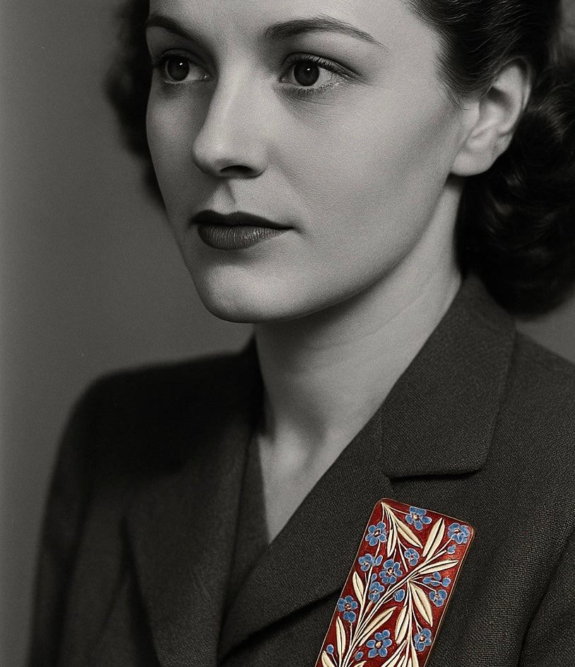Questa spilla è un piccolo scrigno di stile d’altri tempi. Prodotta in Francia nella prima metà del Novecento, porta impressa la delicatezza dell’Art Déco e il sentimento affettuoso del fiore ‘Non ti scordar di me’. Lo smalto rosso profondo incornicia rami dorati e fiori azzurri, testimoni di promesse e memorie. Un gioiello di storia e di charme che parla direttamente al cuore.