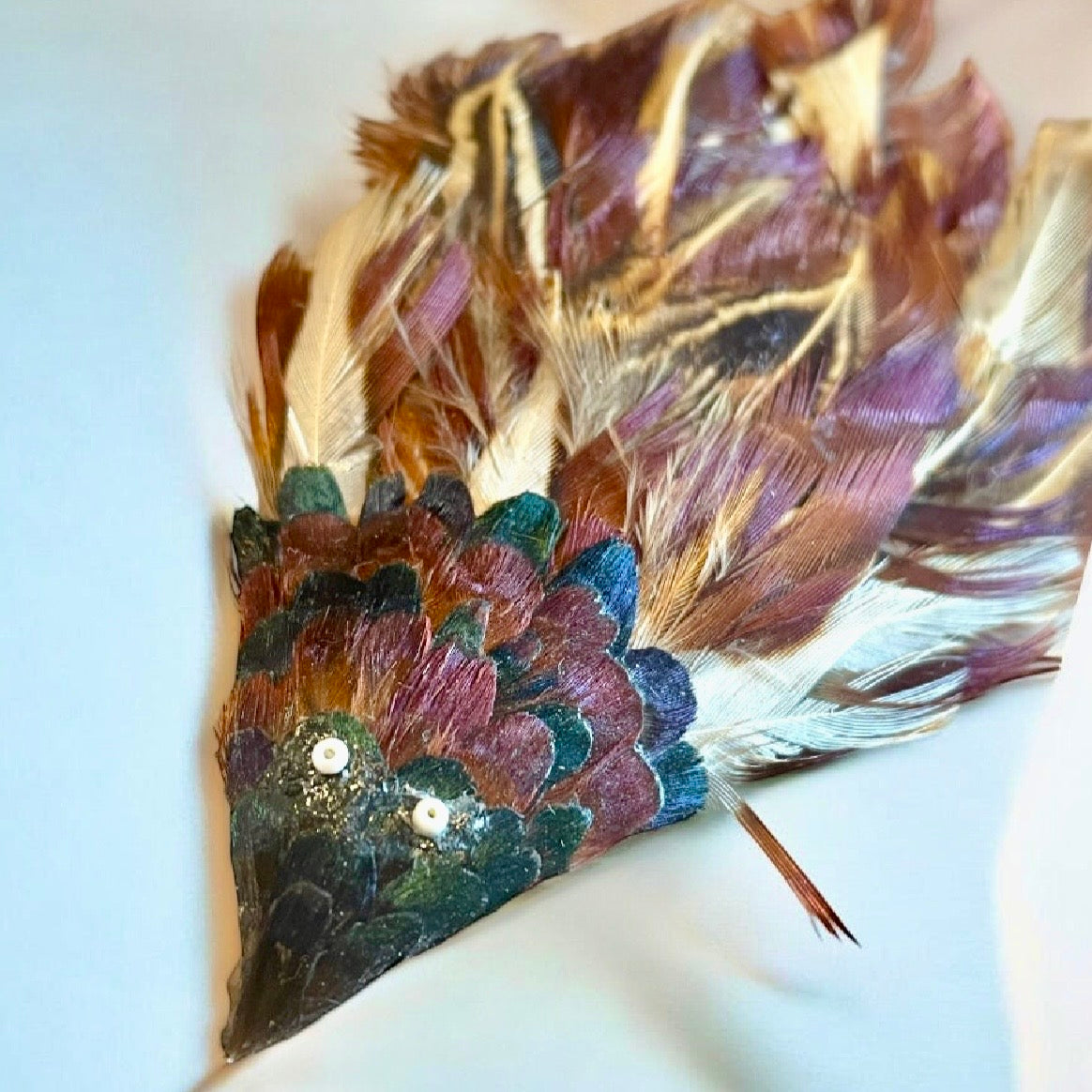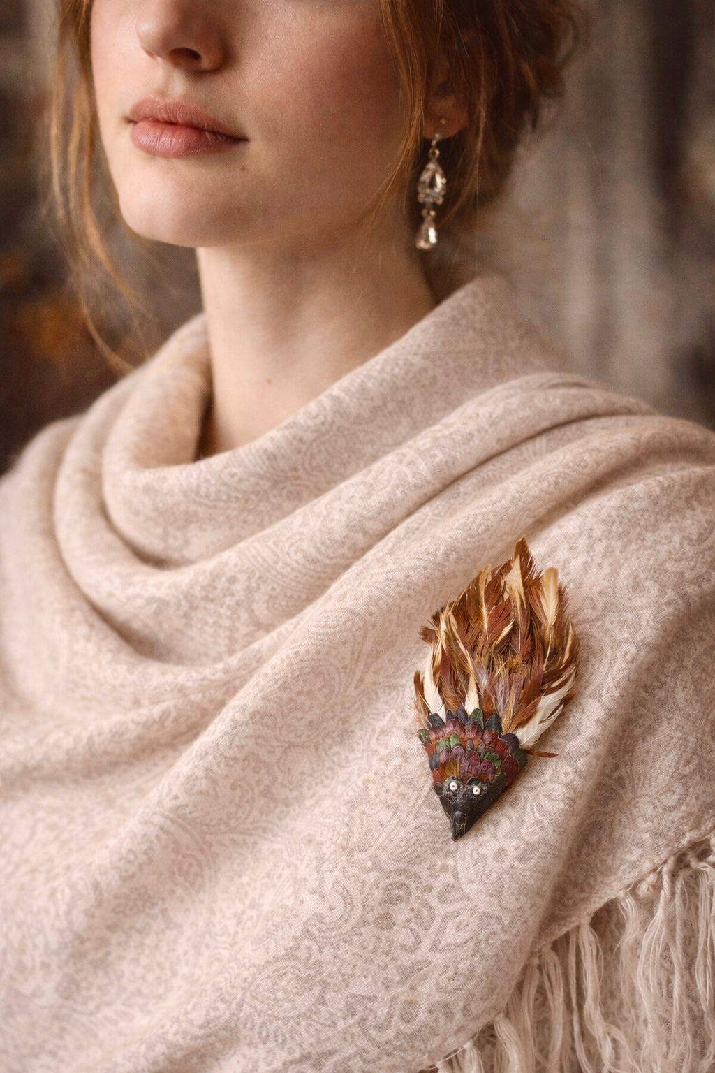 C’è qualcosa di sorprendentemente vivo in questa spilla! Non perché imiti un uccello, ma perché sembra essersi fermata un istante prima di riprendere il volo. Le piume, leggere e stratificate, creano un movimento naturale, quasi respirato. I colori – caldi, profondi – ricordano sottoboschi, stagioni che cambiano, cappotti appoggiati a una sedia all’ingresso. Gli occhi minuscoli, discreti, le danno un’espressione attenta, come se stesse osservando il mondo da un punto sicuro. È una spilla che non chiede attenzione, ma la riceve. Si posa su un cappotto, su uno scialle, su un abito semplice, e trasforma il gesto quotidiano del vestirsi in un dettaglio narrativo. Non è un ornamento rigido: è morbida, materica, viva al tatto e allo sguardo. Indossarla significa portare con sé una presenza leggera, qualcosa che parla di natura, di cura, di tempo lento. E forse anche di quella parte di noi che ama fermarsi, prima di ripartire… e che rimane bimba.