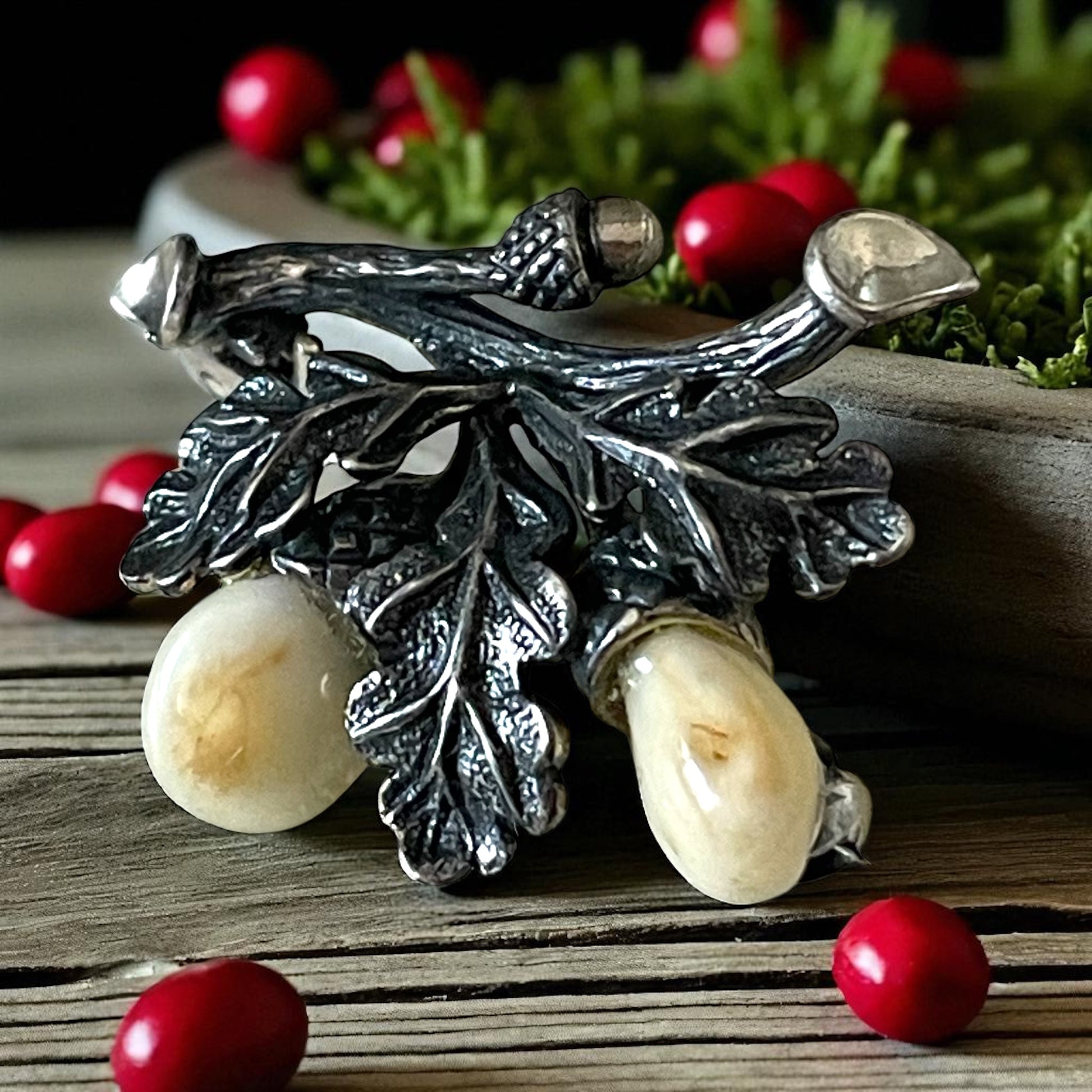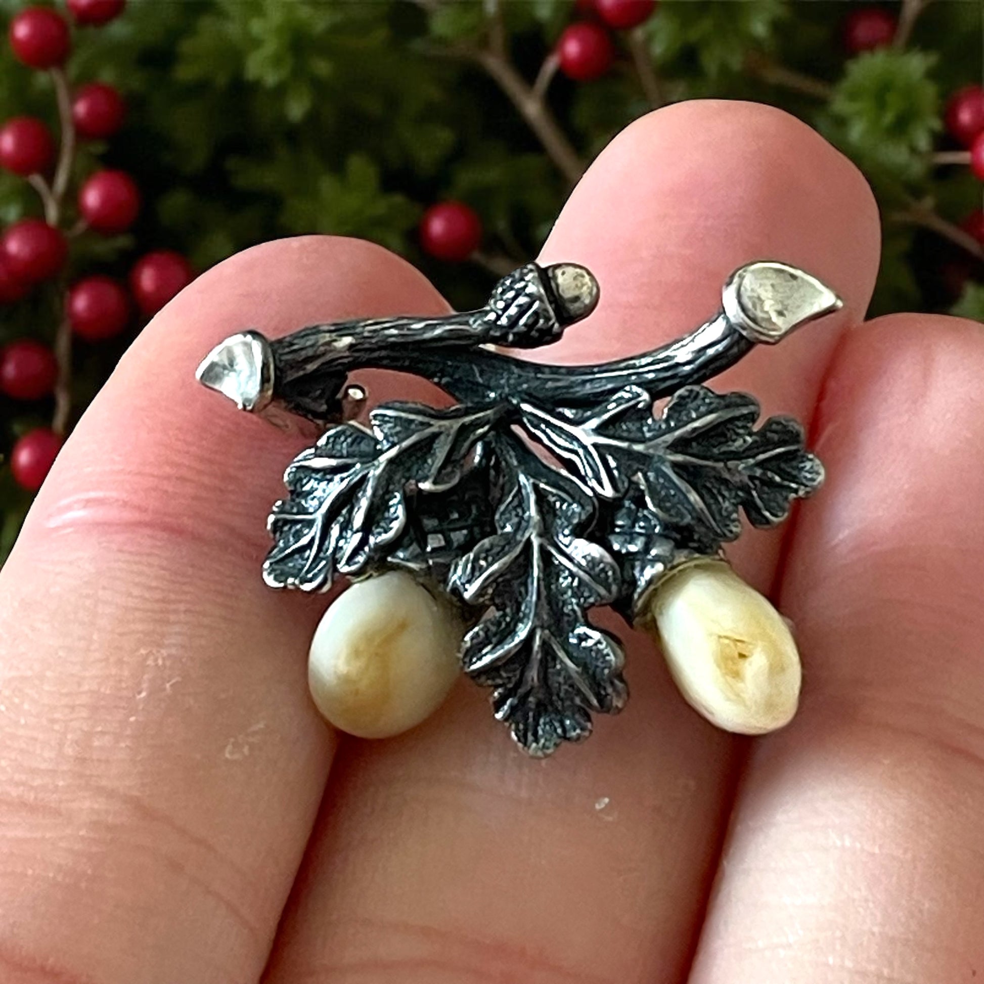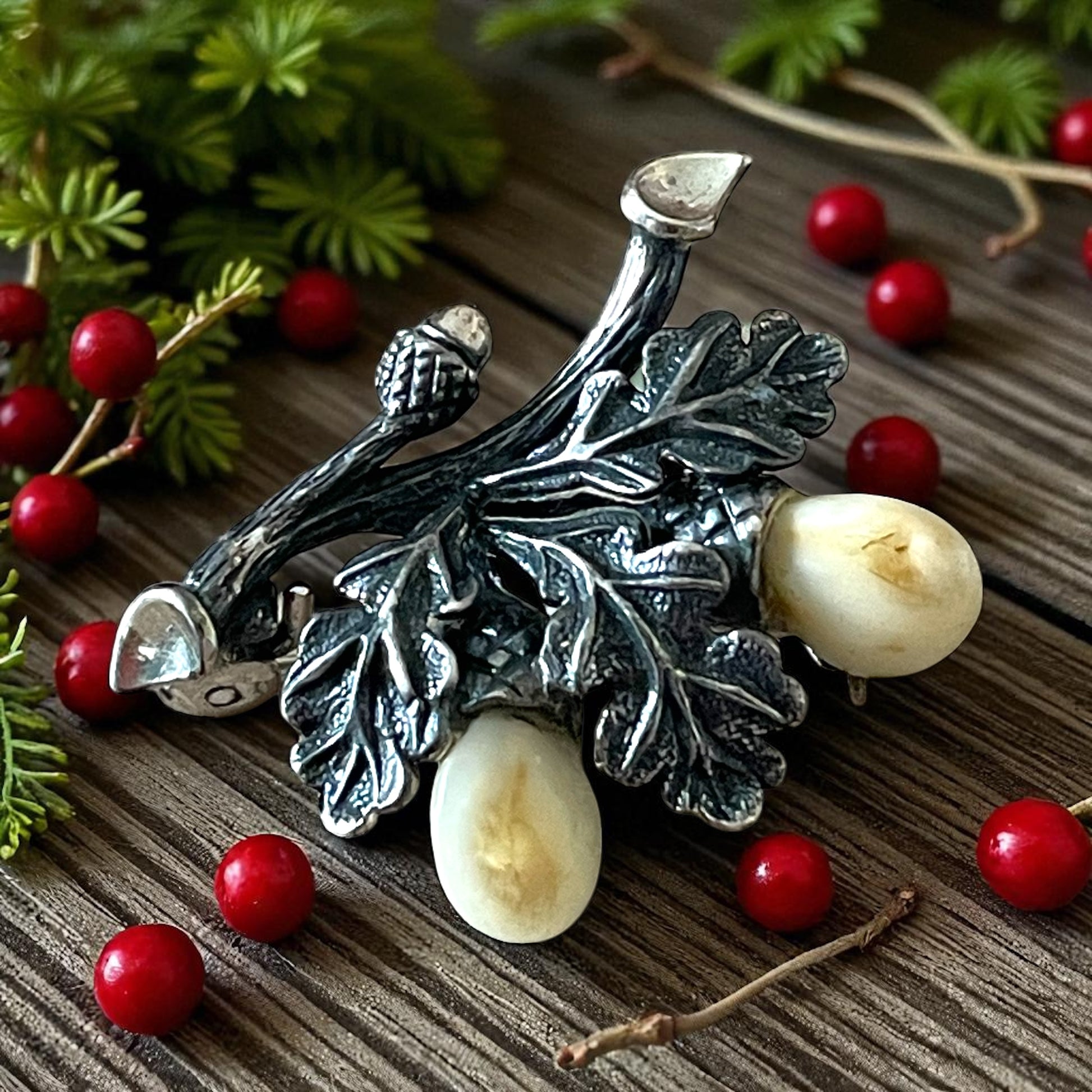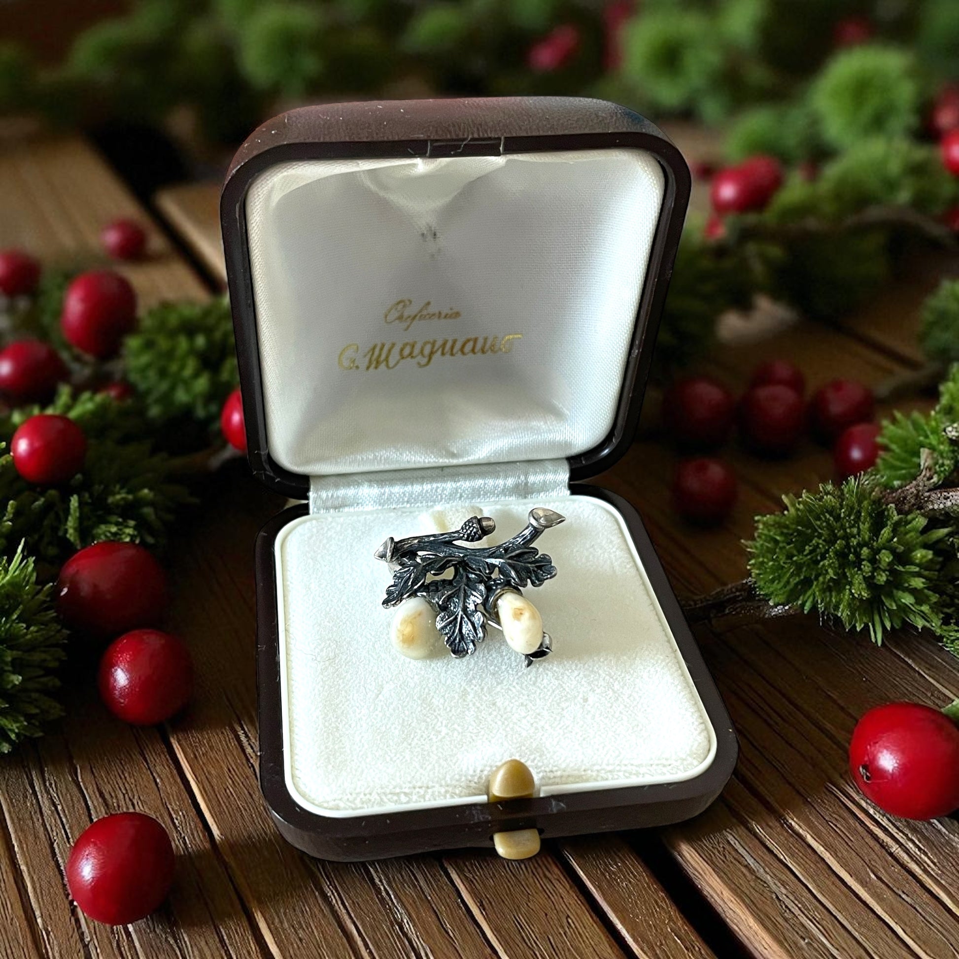 Tra le pieghe della tradizione alpina si nasconde un gioiello raro e affascinante: una spilla in argento 925 con foglie di quercia e due denti di cervo incastonati, proveniente dall’area culturale dell’Alto Adige – Südtirol. Questi ornamenti, noti in tedesco come “Grandelschmuck” (gioielli con le Grandeln, cioè i denti canini del cervo), hanno una lunga storia che affonda nelle usanze venatorie delle Alpi. Simbolo di forza e virilità, i denti di cervo erano considerati trofei preziosi, spesso tramandati come memoria di cacce gloriose e trasformati in spille, anelli o gemelli. Le foglie e le ghiande di quercia, finemente cesellate nell’argento, completano il significato simbolico: la quercia rappresenta resistenza, longevità e radici profonde. Insieme, dente di cervo e ramo di quercia raccontano una narrazione di legame con la natura, di appartenenza alla montagna e di eleganza virile. Realizzata probabilmente negli anni ’50 del Novecento, questa spilla conserva tutto il fascino del gioiello alpino d’epoca, testimone di un gusto che univa artigianato, simbolismo e tradizione montana.