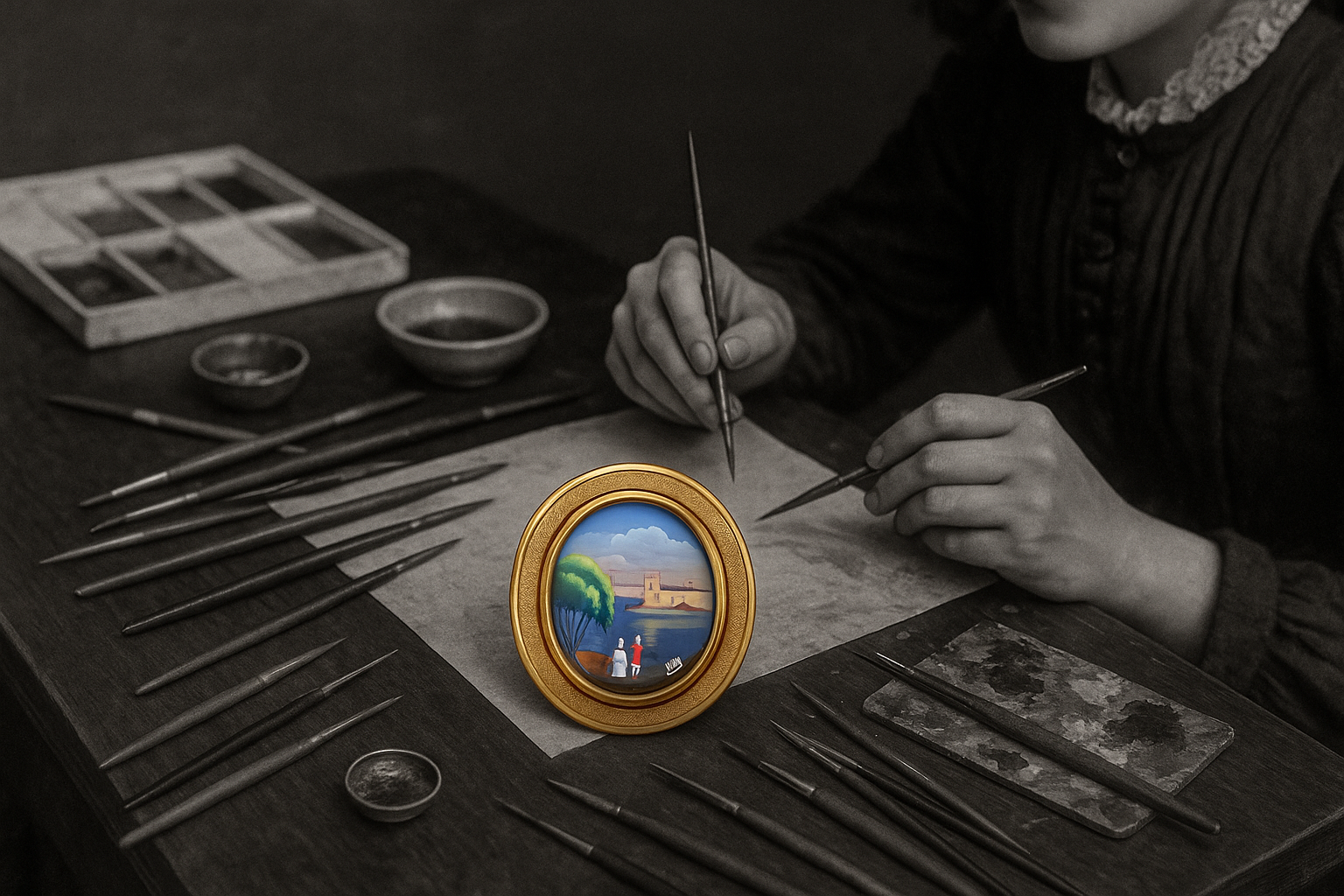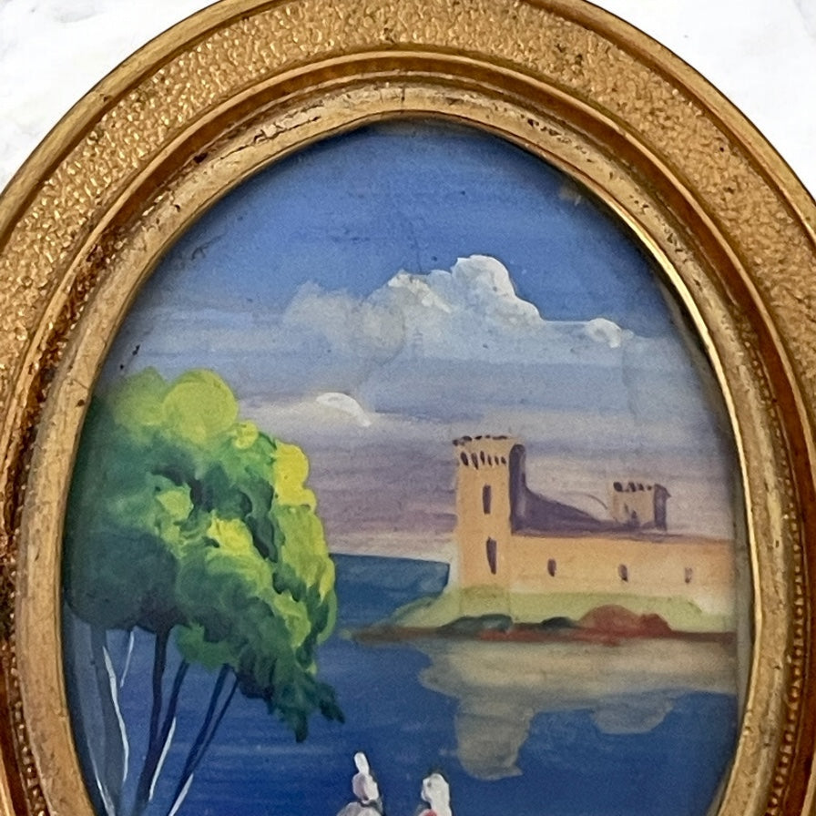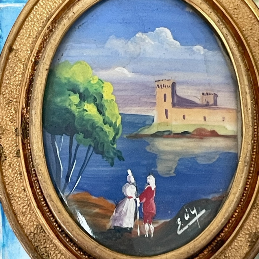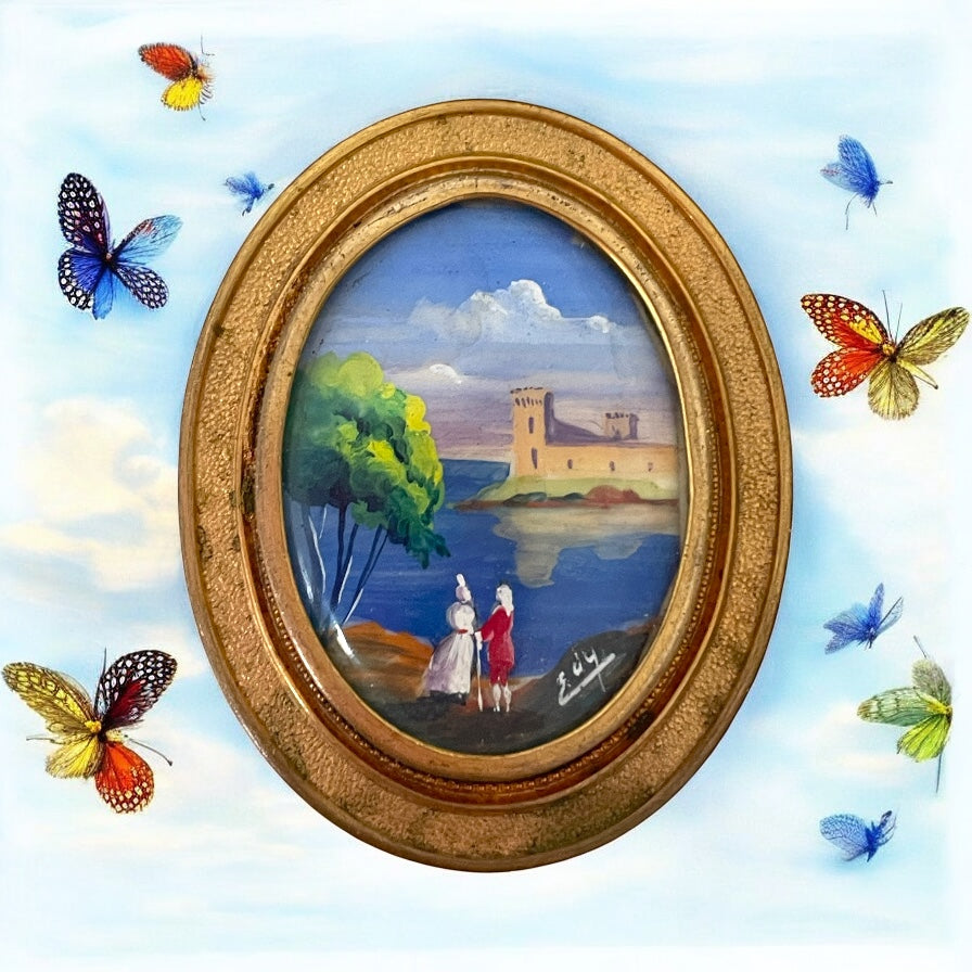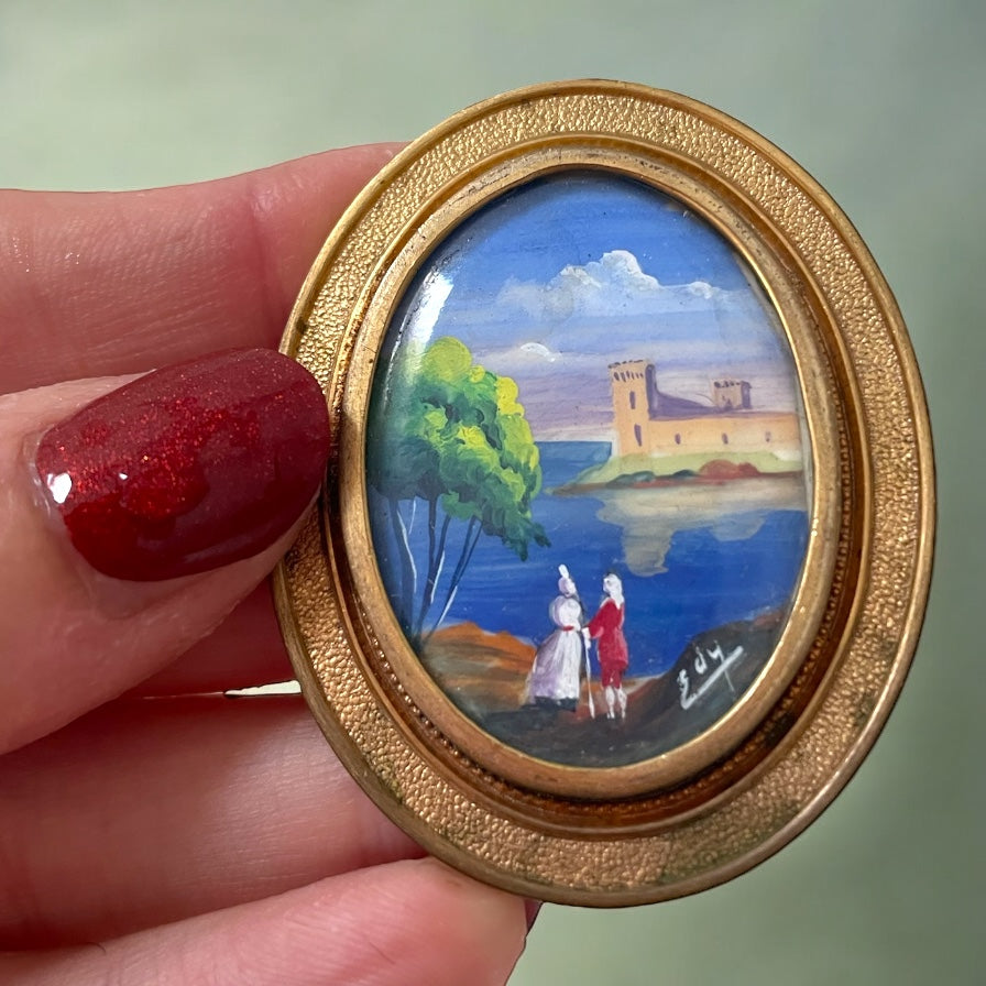 Forse non è mai esistito davvero questo castello, sospeso tra cielo e lago, o quella luce dorata che accarezza le torri, o il sentiero dove due figure in abiti del passato sembrano essersi appena sfiorate la mano. Eppure per lei – la donna che ha dipinto questa scena minuscola, segreta, preziosa – tutto era reale. Aveva scelto i colori come si scelgono le parole in una lettera d’amore che non si può spedire. Aveva dato vita a un paesaggio che non si trova sulle mappe, ma solo nella memoria e nel desiderio: un luogo idilliaco dove ritrovarsi con chi non si può avere, immersi in un tempo eterno che non fa domande. In quel dipinto minuscolo, dietro il vetro curvo che lo protegge come uno scrigno, lei ha messo la propria nostalgia, la propria speranza, e forse anche la promessa – dolcissima e muta – di un amore che sopravvive al tempo, ai confini, alle distanze. Chi indossa questa spilla, senza saperlo, diventa lei: la pittrice e l’amante, la sognatrice e la donna che, con eleganza e pudore, porta sul cuore il proprio segreto. Perché a volte la bellezza più autentica nasce proprio dall’amore che non si può vivere… e che per questo diventa eterno.