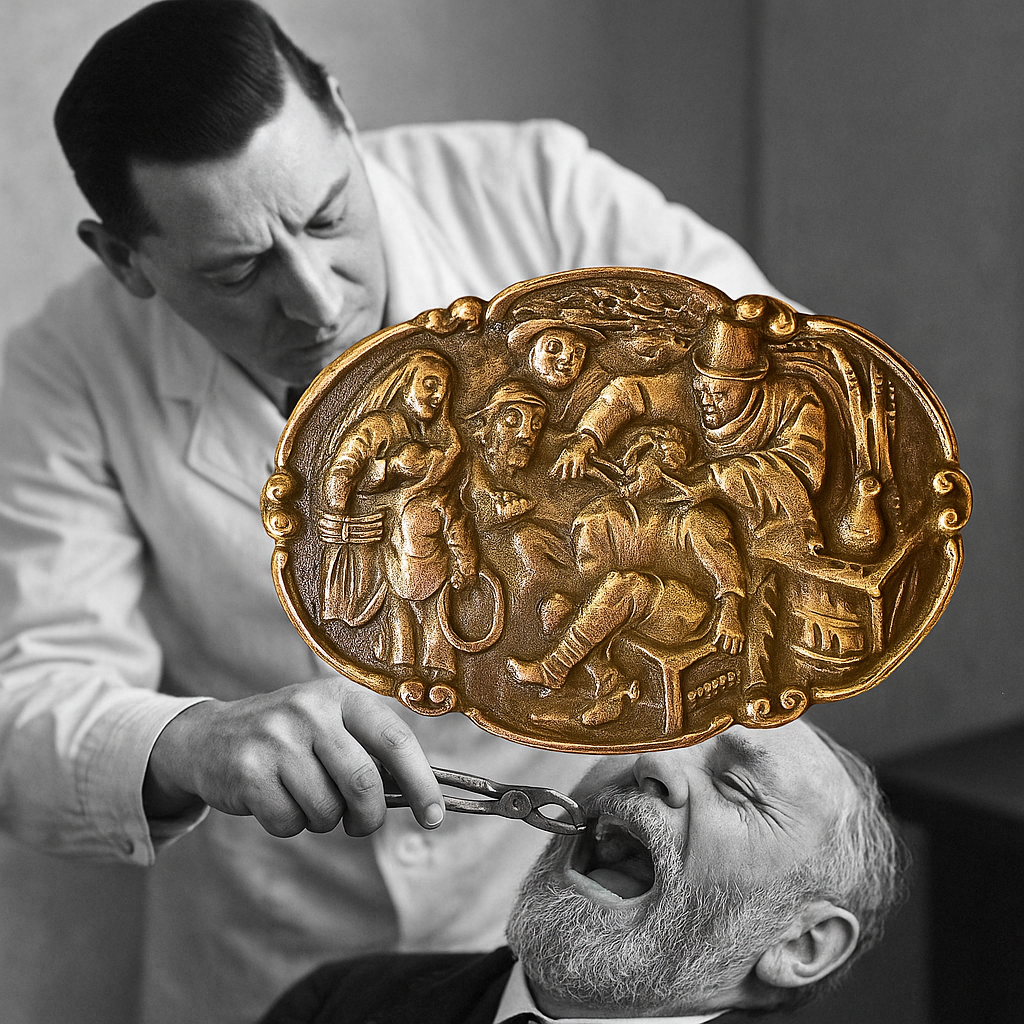 Il “dottore” – così si faceva chiamare – scendeva con il suo cilindro impolverato, tirava fuori la pinza e si sedeva sullo sgabello. Bastava un richiamo per radunare i curiosi: chi voleva vedere, chi aveva realmente un dente da togliere, chi cercava solo di soddisfare la propria curiosità. L’estrazione era rapida, cruda, spettacolare. Nessun anestetico, solo coraggio e urla. Ma anche quella, in fondo, era una forma di medicina: pubblica, condivisa, popolare. Questa spilla racconta tutto questo. È il fermo immagine di un’epoca in cui il dolore veniva esposto in piazza, e guarito – a volte – anche con una risata. Splendido oggetto per collezionismo medico o Wunderkammer.
