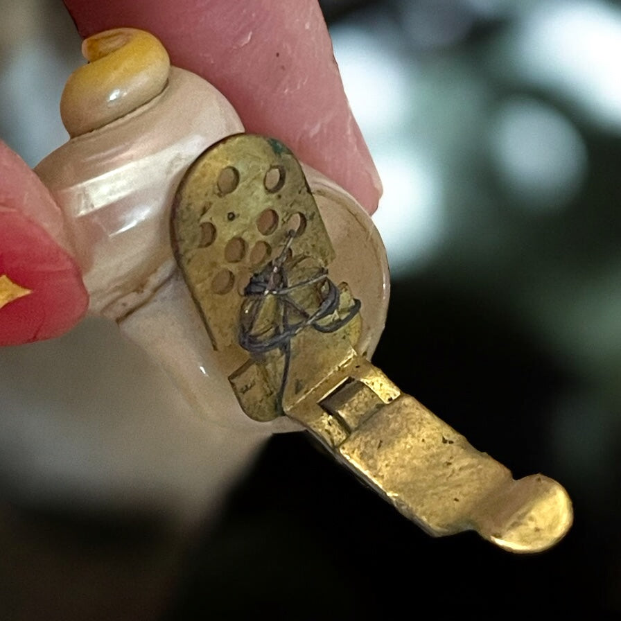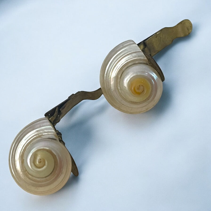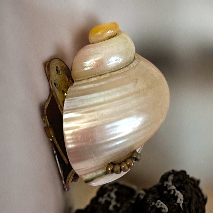 Immagina una sposa negli anni ’40, avvolta in un abito di seta color avorio e nel velo più delicato, che sceglie con cura questi orecchini per il giorno più speciale della sua vita. Due piccoli capolavori che racchiudono la poesia del mare e la magia del tempo. Le conchiglie che adornano questi orecchini – verosimilmente Turbo o Turritella – sono autentiche meraviglie naturali, create dalla pazienza della natura. Lo sapevi che per formarsi completamente, una conchiglia come questa può impiegare tra i 5 e i 15 anni? Ogni spirale e ogni riflesso madreperlaceo sono il risultato di un lungo processo di sedimentazione e crescita: un’opera d’arte lenta, scolpita dalle onde e dal silenzio delle profondità marine. L’artigiano che negli anni ’40 ha dato vita a questi orecchini ha saputo esaltare la conchiglia senza alterarne la bellezza naturale. La clip in ottone brunito – ancora perfettamente funzionante – è stata modellata per abbracciare e sostenere la conchiglia, senza mai coprirne la forma armoniosa. Il risultato è un insieme che unisce la forza del metallo e la delicatezza di un frammento di oceano. Indossare questi orecchini significa portare con sé un simbolo di grazia e di resilienza, un racconto antico che si svela a ogni movimento. Sono perfetti per chi ama i dettagli autentici e il fascino delle storie vere, e si sposano meravigliosamente con un abito elegante o un look minimal chic, illuminando il viso con riflessi naturali e un tocco di poesia.