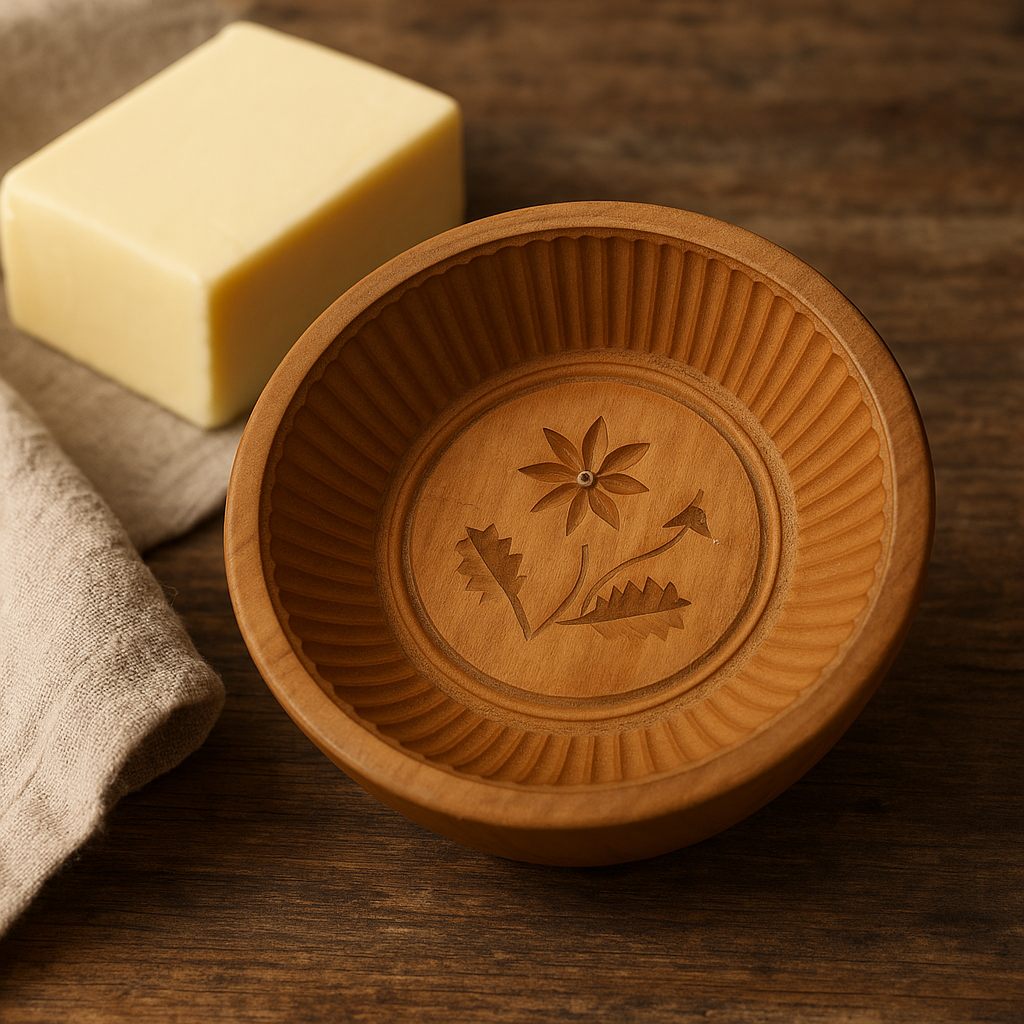 Nelle cucine alpine di primo ‘900 il burro non era solo alimento ma dono prezioso, da portare in tavola nei giorni di festa. Per questo veniva modellato con stampi in legno come questo, tornito a mano e inciso con un fiore stilizzato: un segno di bellezza semplice, nato tra le montagne. Ogni scanalatura racconta la pazienza dei gesti quotidiani, ogni venatura di legno custodisce il profumo delle case contadine alpine. Oggi resta un oggetto autentico, capace di evocare il calore e la poesia della vita rurale. Può arricchirà la tavola della vostra casa o essere un tocco speciale in un relais o in una dimora di charme. Ottime le condizioni.