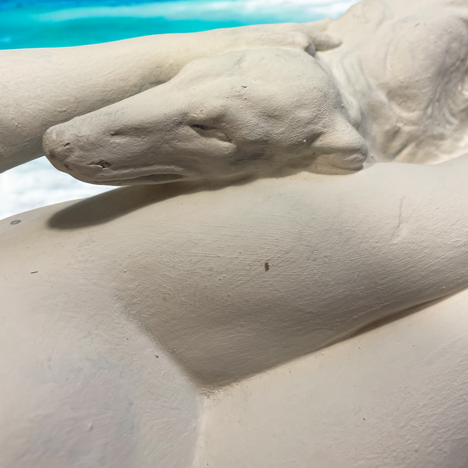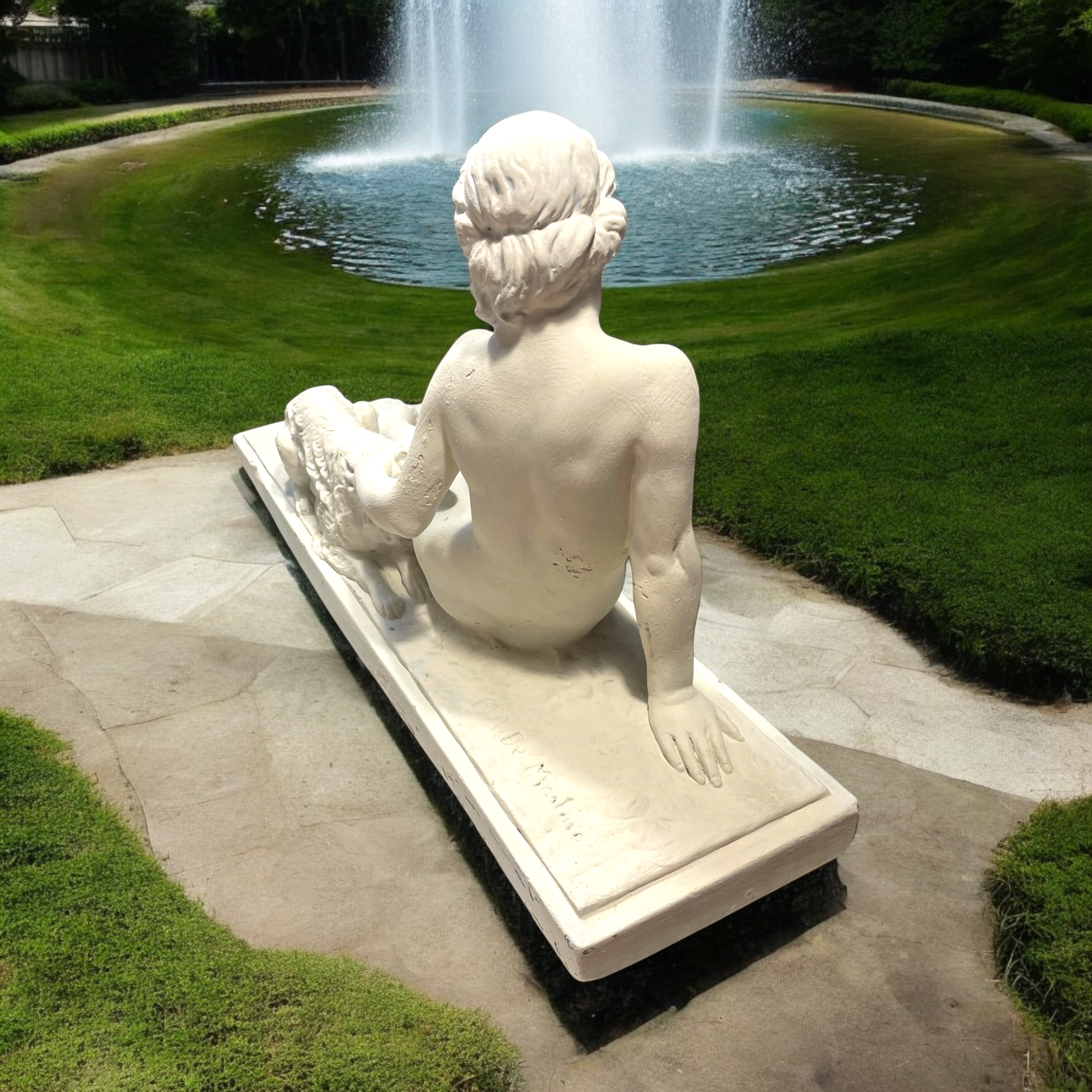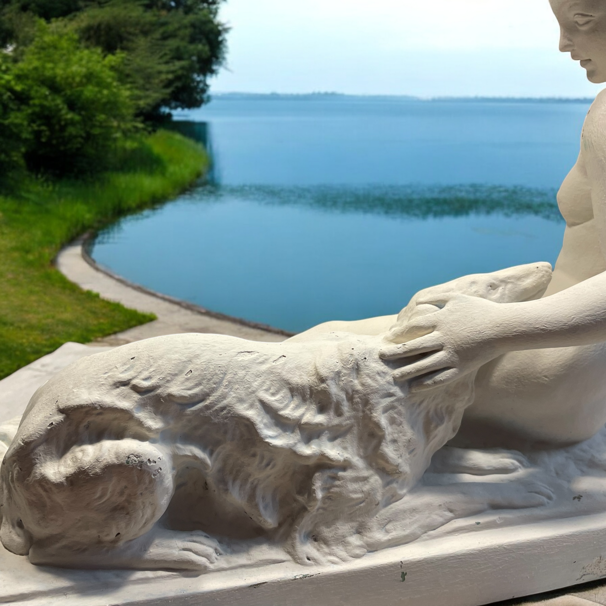 Noi ci vediamo l’amore, l’amore quello più puro - il legame con il proprio cane. Ciò che ci ha colpito di questa statua antica non è la donna, non è nudo, bensì lo scambio degli sguardi. la posa del cane ha ricevuto molta più attenzione dall’artista rispetto alla donna, proprio per rendere lui protagonista dell’opera. il suo atteggiamento è quello del cane fedele che si sdraia e accuccia vicino a chi ama di più al mondo. Bellissimo il dettaglio della posa della testa, appoggiata sulle gambe della donna, la quale a sua volta con delicatezza pone la mano sulla testa del cane. Il soggetto di quest’opera è il legame, quello che corre invisibile tra quegli occhi, inseparabili. L’opera è firmata, è in gesso, ha dimensioni abbastanza importanti - 56.5 x 16 x 31 cm - e presenta due piccoli difetti che sono riassunti nelle ultime due fotografie. Un recupero d’epoca che ci ha colpiti davvero.
