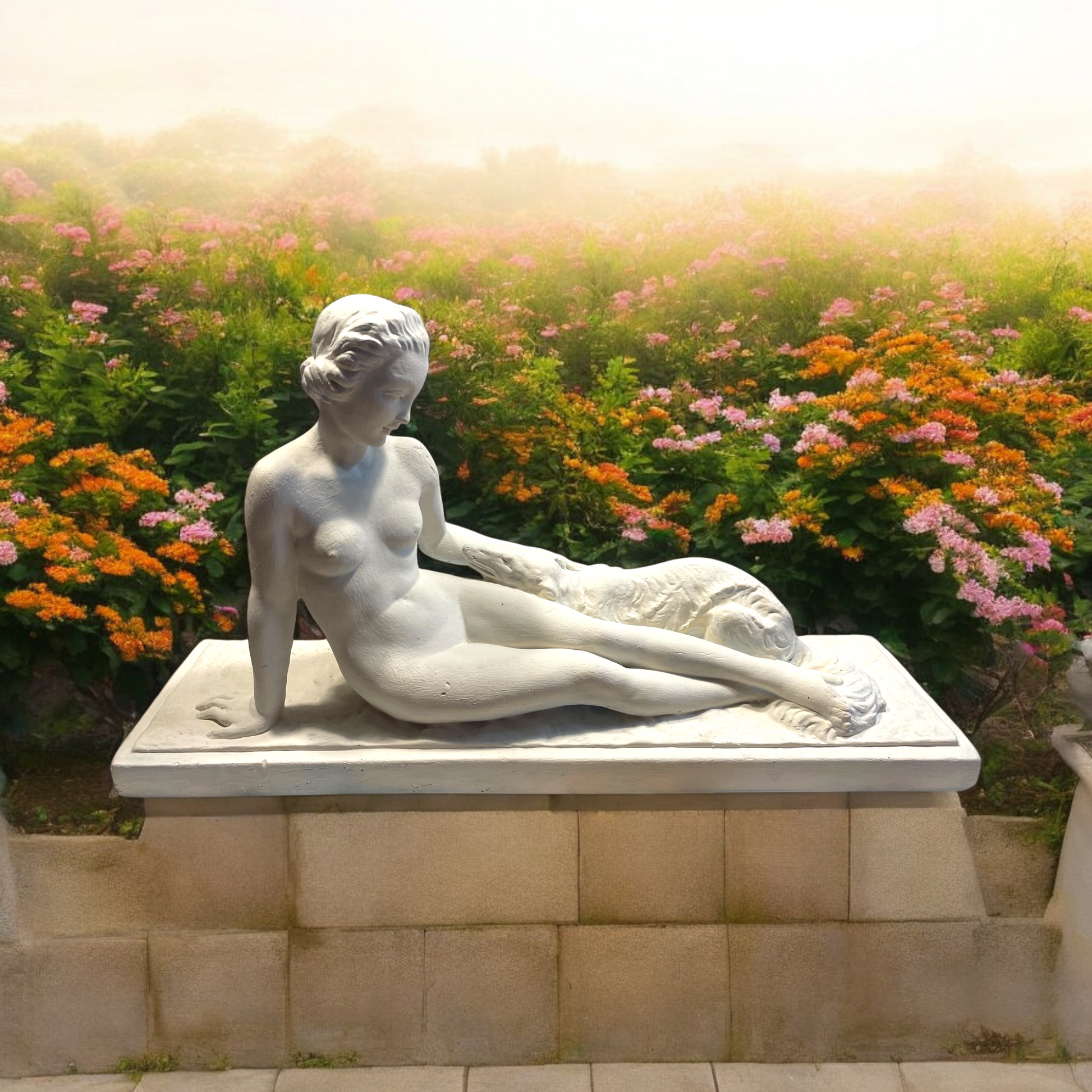 Statua déco donna con cane in gesso