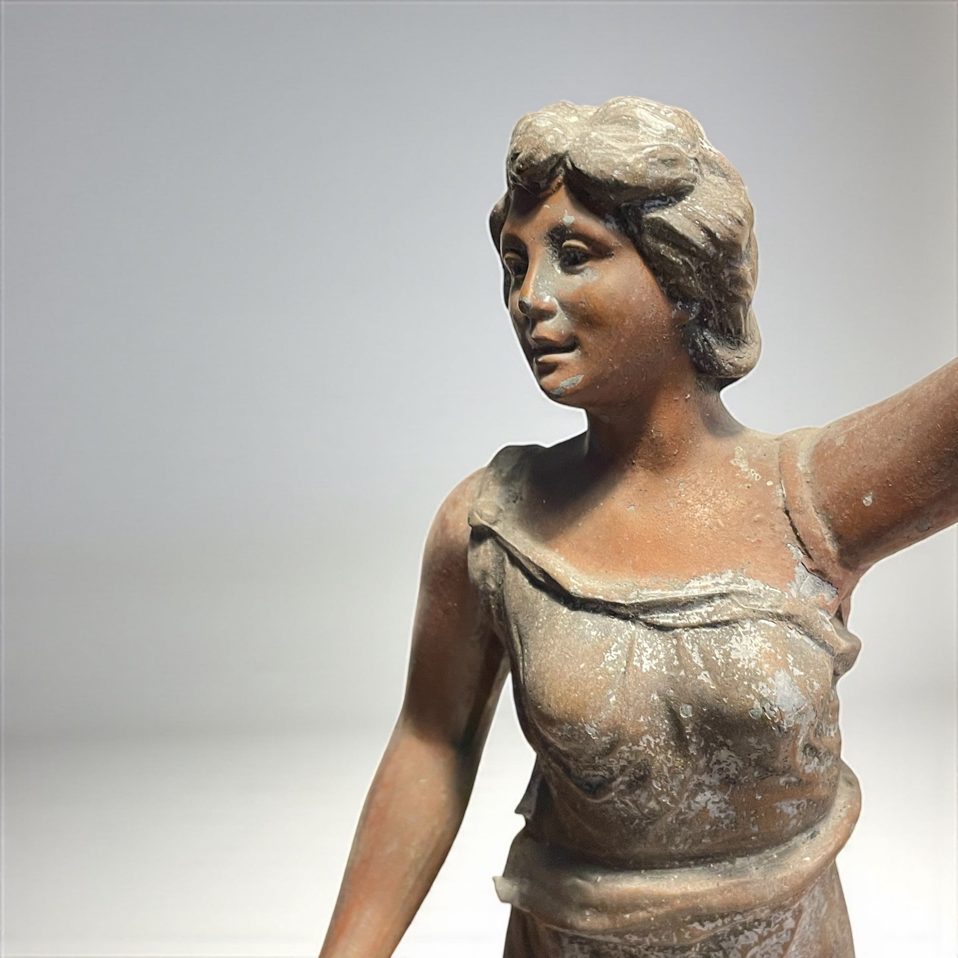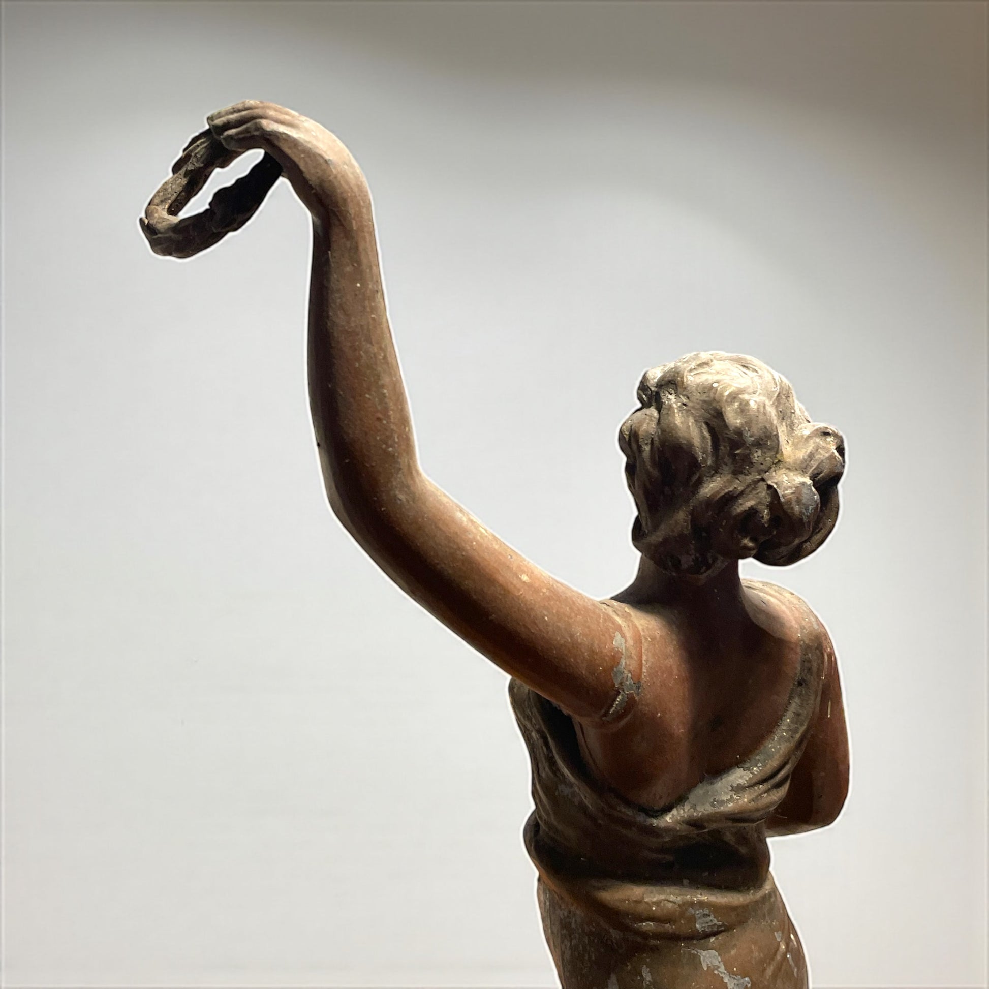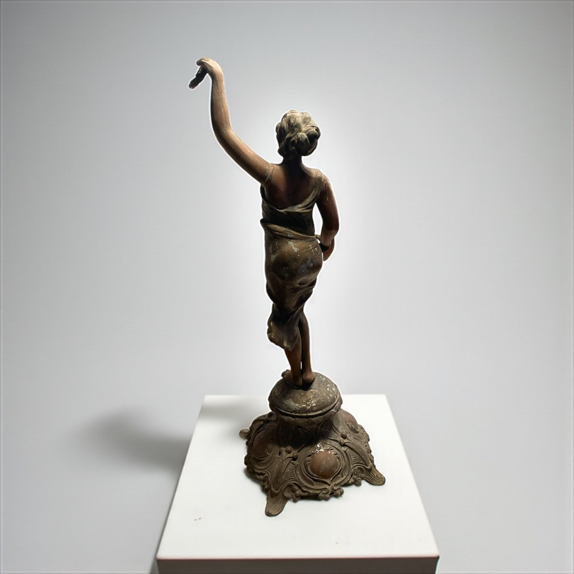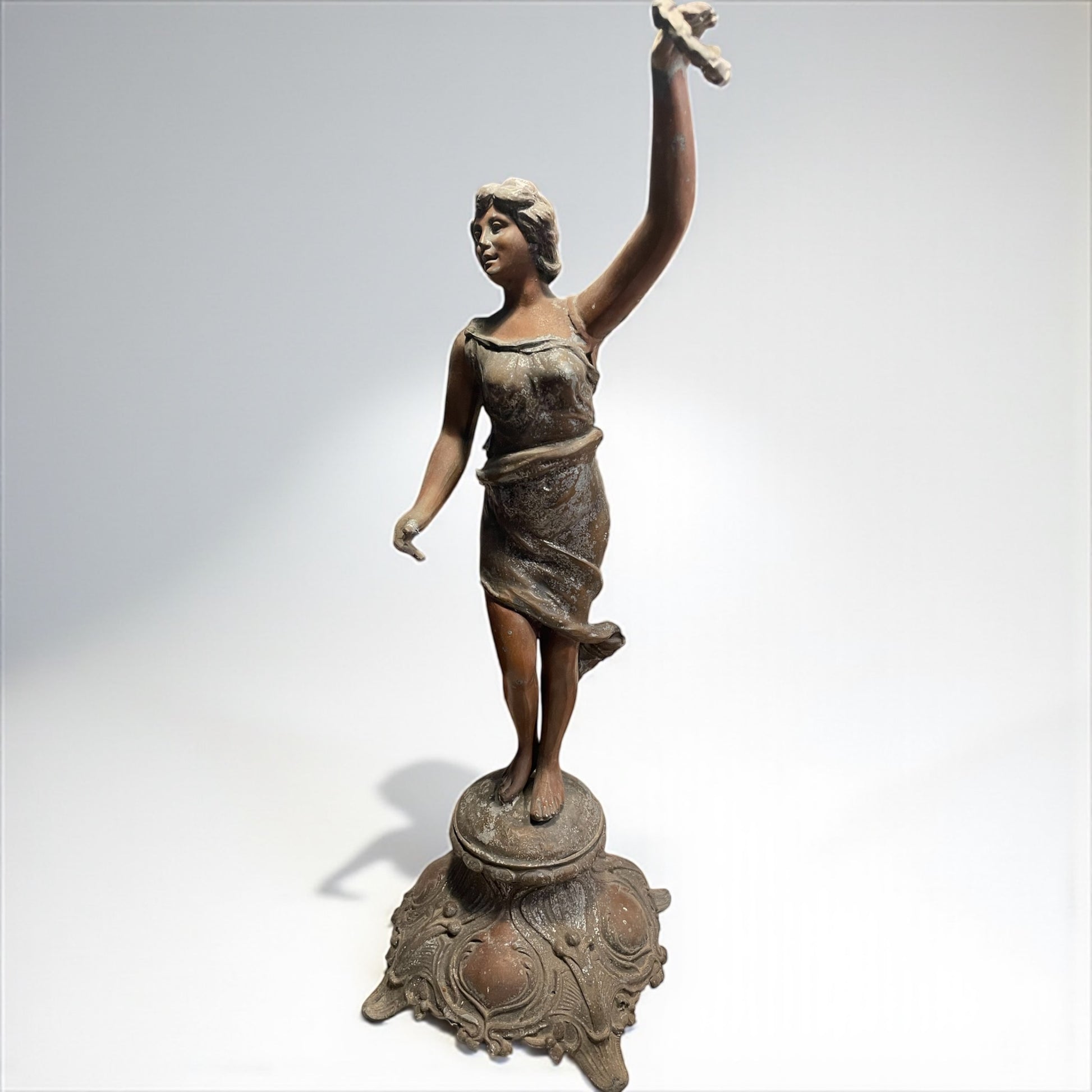 Torniamo all’inizio del Novecento, quando le case borghesi si popolavano di figure eleganti e leggere come questa: una giovane donna danzante, con il volto sorridente e i capelli mossi, che solleva in alto una corona d’alloro. Il gesto non è solo un movimento, ma un simbolo antico e universale: l’alloro è segno di vittoria, di gloria e di riconoscimento, ereditato dalla tradizione classica e riportato alla modernità in chiave Liberty. La veste che avvolge il corpo, leggera e aderente, è modellata con morbide pieghe che rievocano il dinamismo e la grazia tipici della Belle Époque. L’armonia tra il movimento delle gambe, la torsione del busto e il braccio proteso verso l’alto crea un effetto scenografico: sembra quasi che la statua inviti chi la guarda a condividere un trionfo interiore. La base, riccamente decorata da motivi sinuosi e floreali, è un chiaro omaggio allo stile Liberty, con la sua ricerca di fluidità e continuità tra natura e arte. L’intera composizione celebra la femminilità come forza vitale, capace di unire bellezza e simbolo, corpo e allegoria. Da notare che, sul fianco sinistro, la mano accennava a un sostegno per un lembo della veste o a un elemento leggero oggi mancante: un dettaglio che non altera la forza espressiva della figura, ma che lascia spazio al fascino del mistero e all’interpretazione. Alta 47 cm.