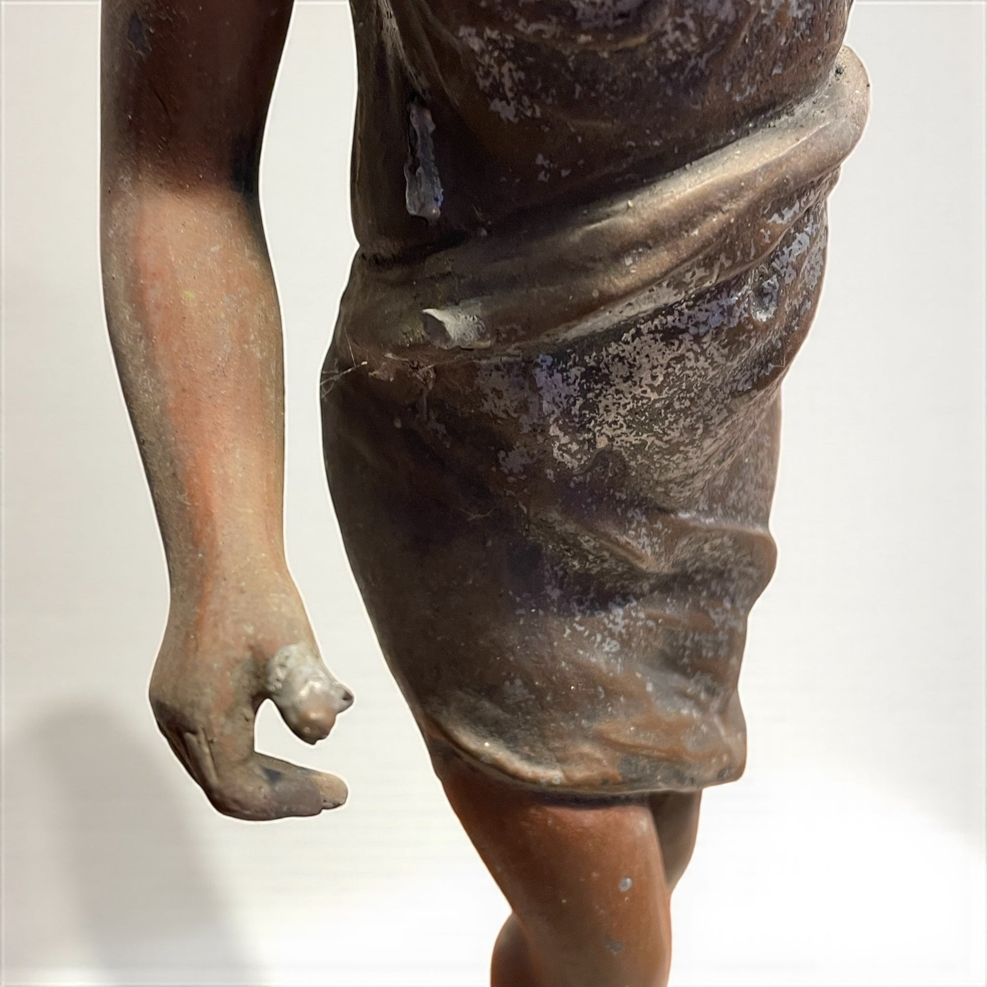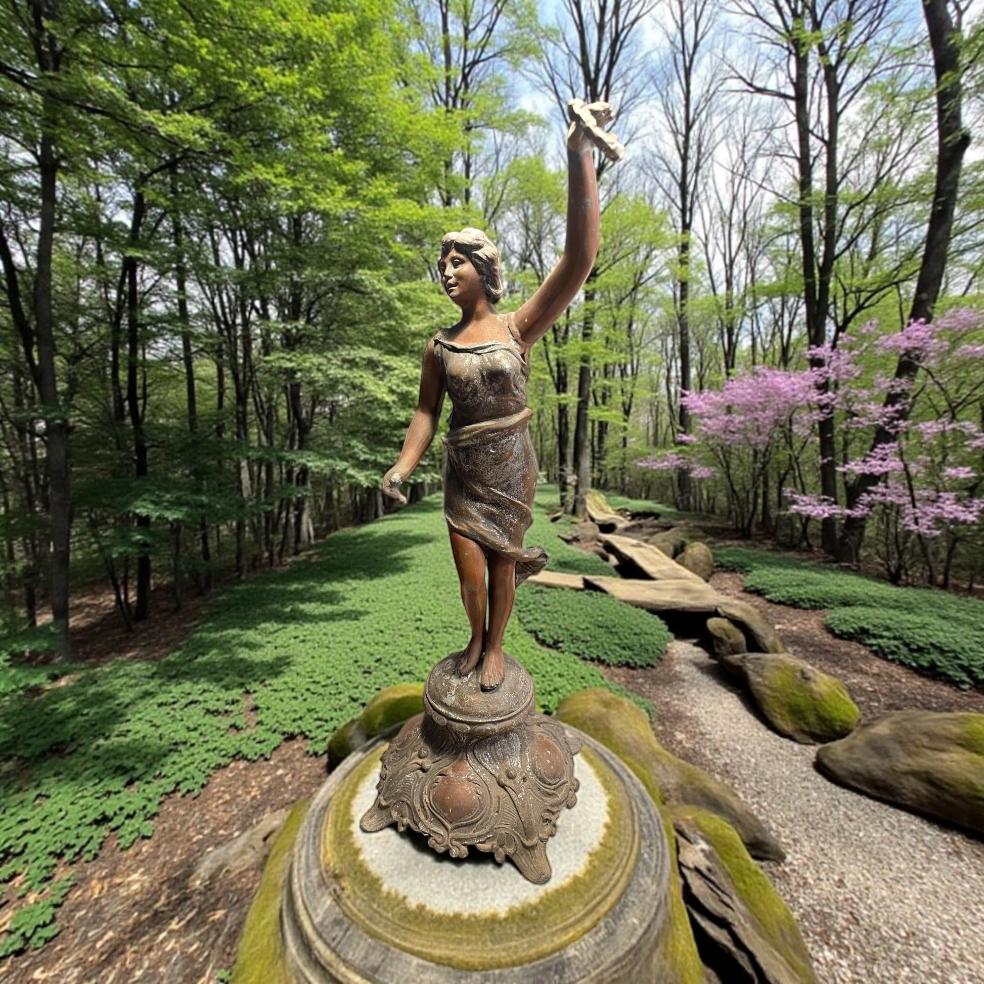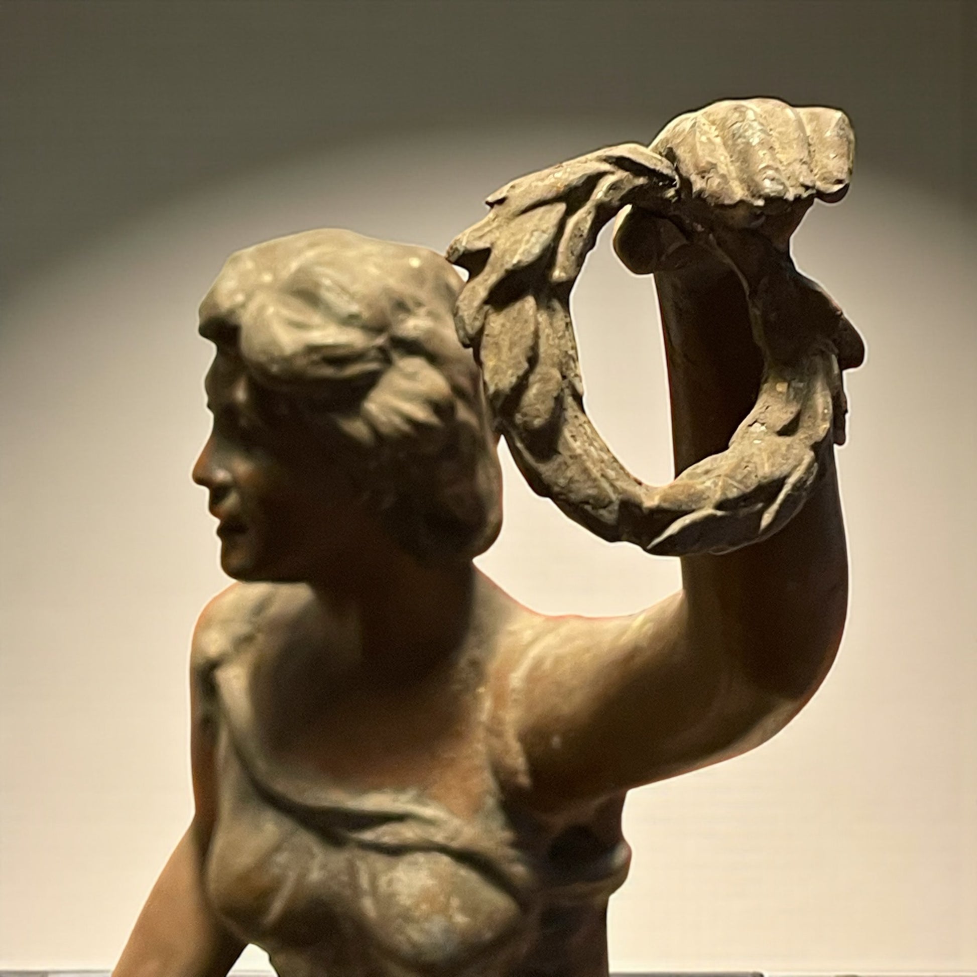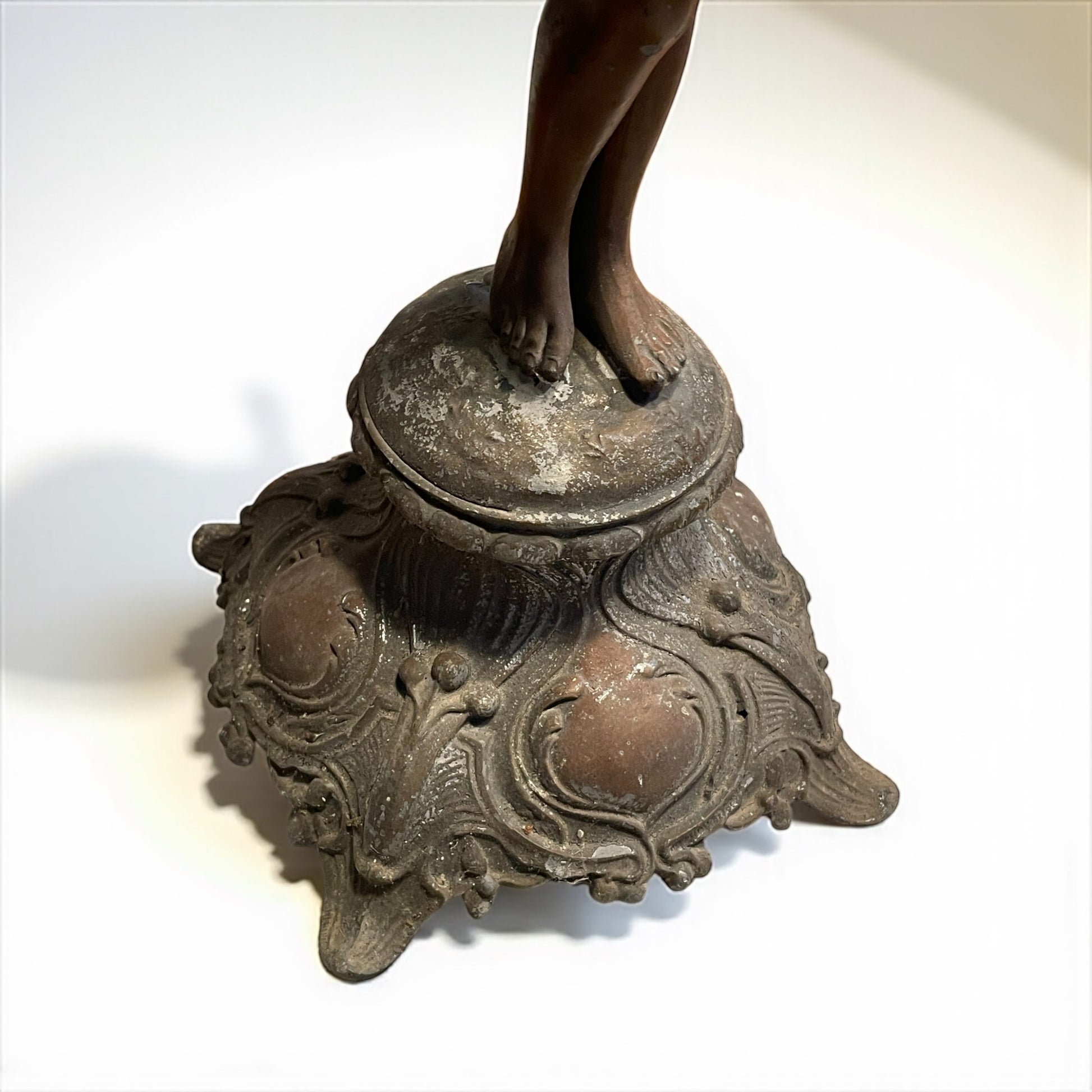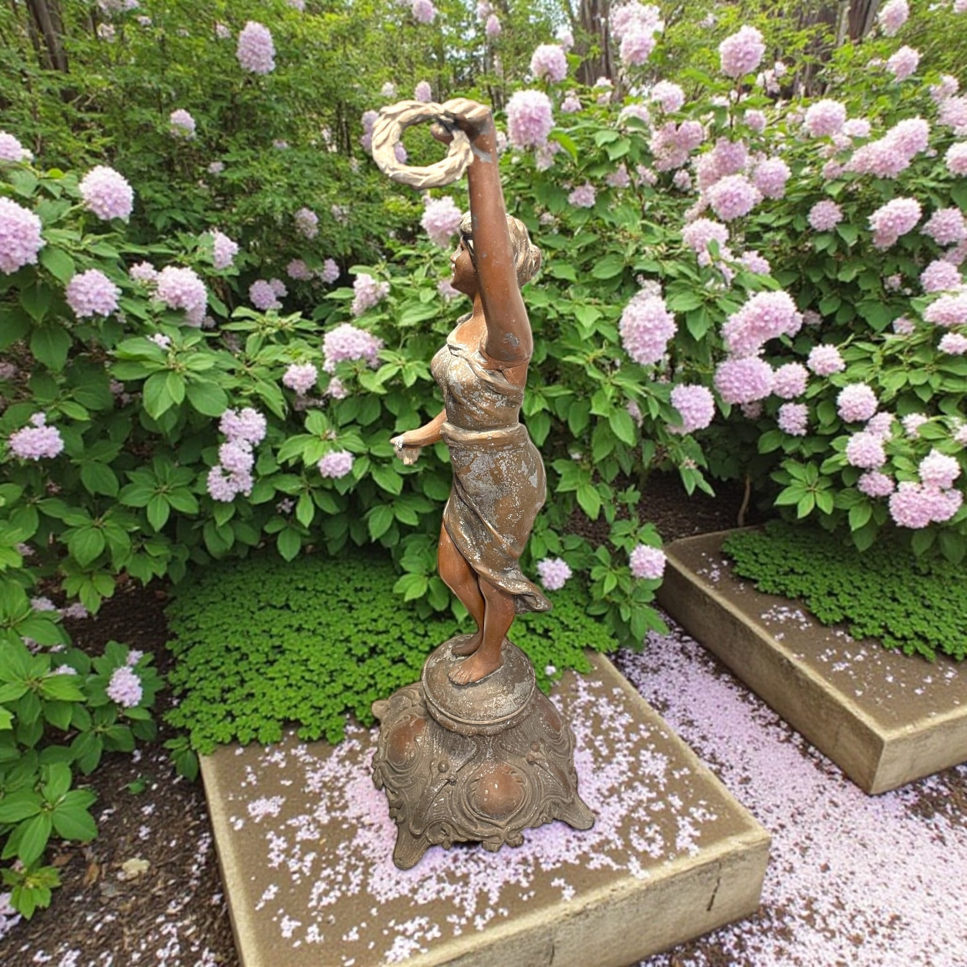 Torniamo all’inizio del Novecento, quando le case borghesi si popolavano di figure eleganti e leggere come questa: una giovane donna danzante, con il volto sorridente e i capelli mossi, che solleva in alto una corona d’alloro. Il gesto non è solo un movimento, ma un simbolo antico e universale: l’alloro è segno di vittoria, di gloria e di riconoscimento, ereditato dalla tradizione classica e riportato alla modernità in chiave Liberty. La veste che avvolge il corpo, leggera e aderente, è modellata con morbide pieghe che rievocano il dinamismo e la grazia tipici della Belle Époque. L’armonia tra il movimento delle gambe, la torsione del busto e il braccio proteso verso l’alto crea un effetto scenografico: sembra quasi che la statua inviti chi la guarda a condividere un trionfo interiore. La base, riccamente decorata da motivi sinuosi e floreali, è un chiaro omaggio allo stile Liberty, con la sua ricerca di fluidità e continuità tra natura e arte. L’intera composizione celebra la femminilità come forza vitale, capace di unire bellezza e simbolo, corpo e allegoria. Da notare che, sul fianco sinistro, la mano accennava a un sostegno per un lembo della veste o a un elemento leggero oggi mancante: un dettaglio che non altera la forza espressiva della figura, ma che lascia spazio al fascino del mistero e all’interpretazione. Alta 47 cm.
