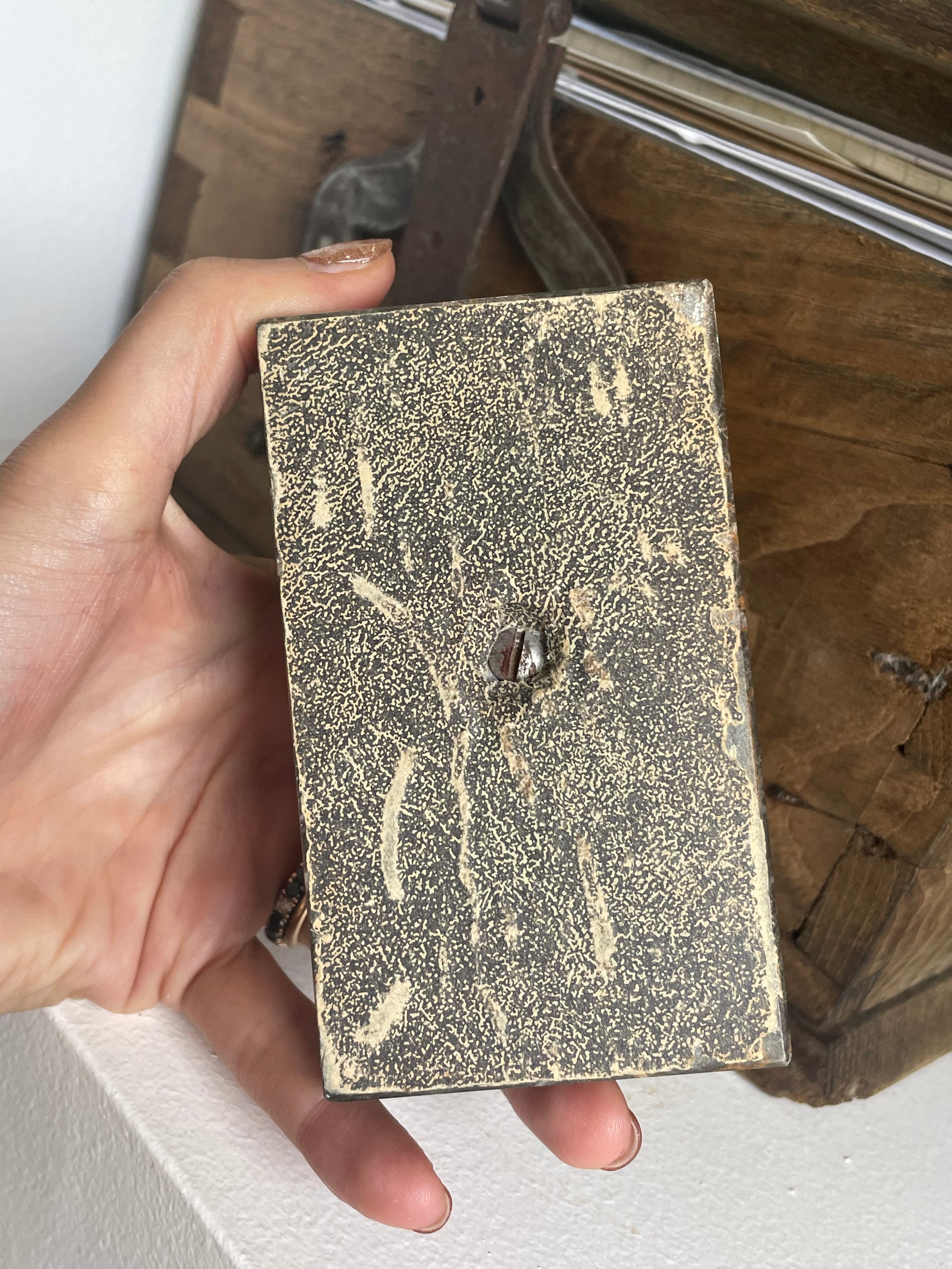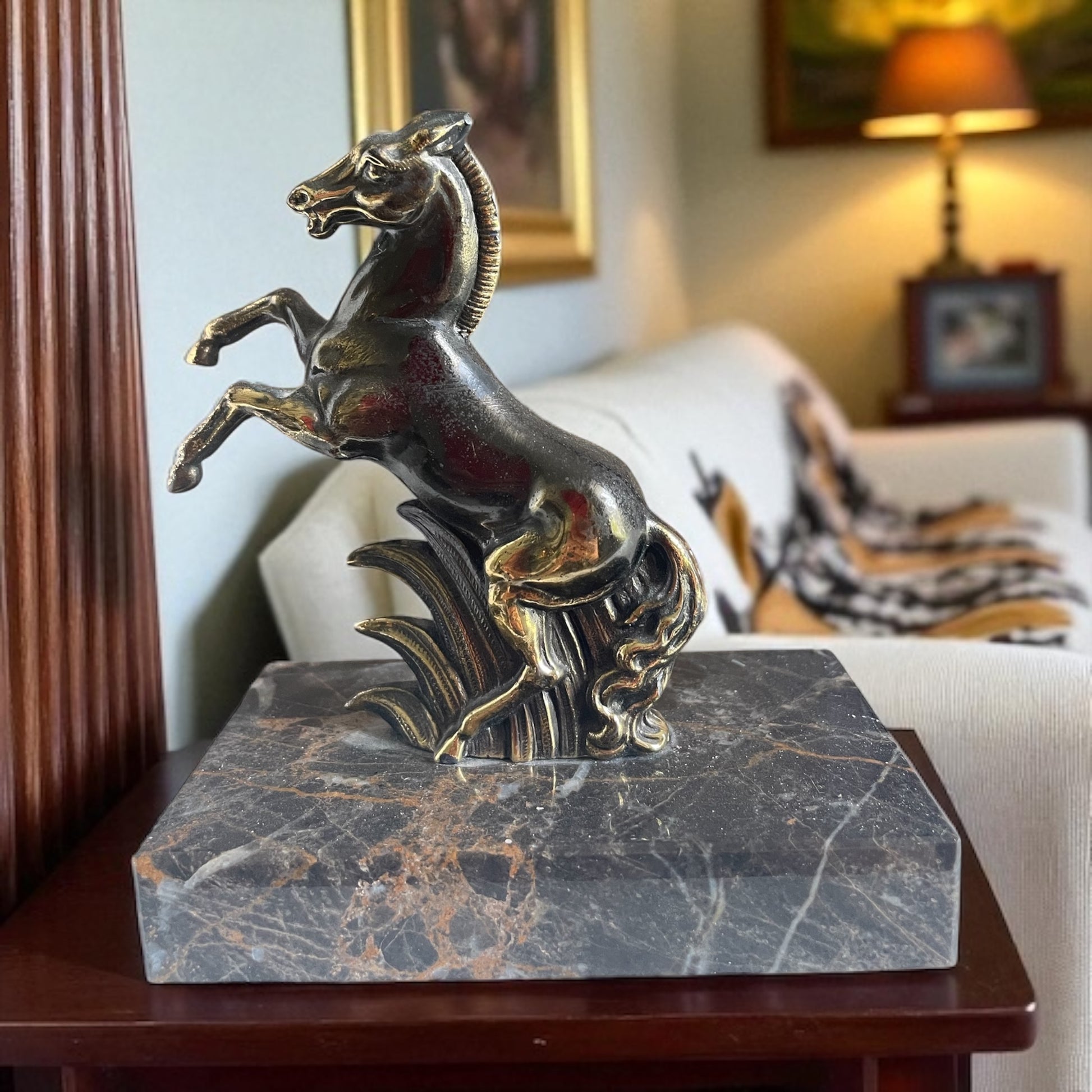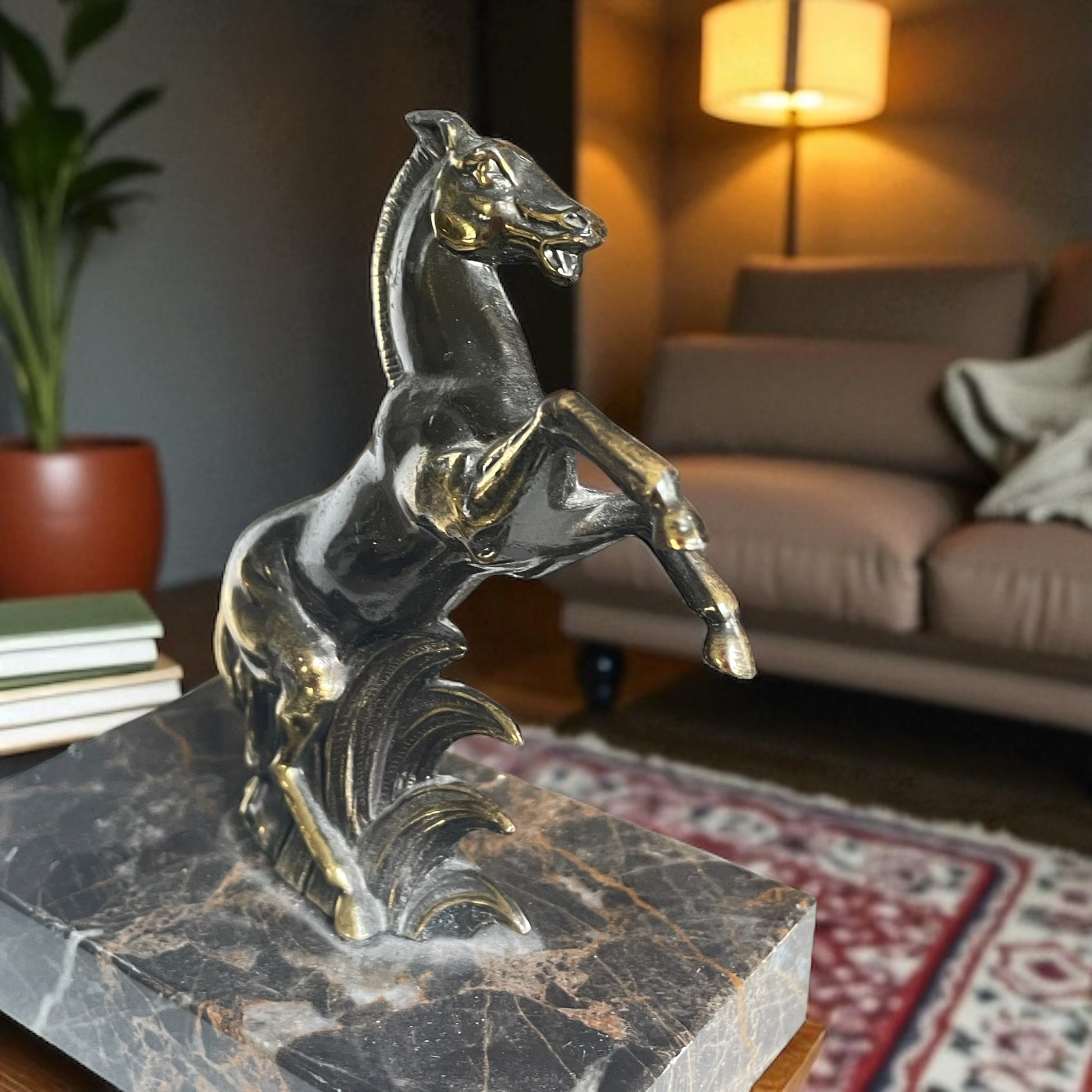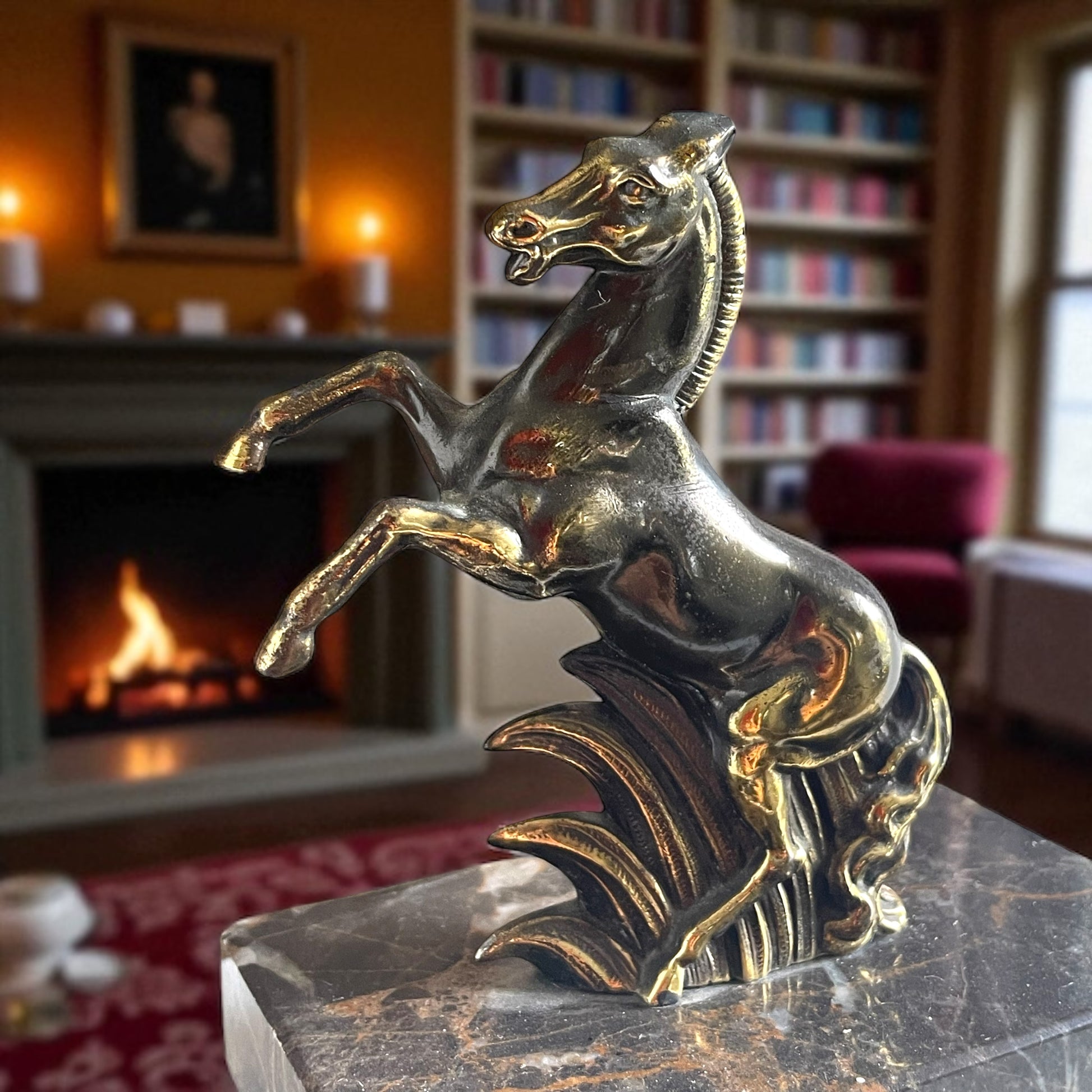 CβΓ¨ una forza inarrestabile in questa piccola scultura di cavallo rampante. Realizzata in lega dorata con splendide sfumature brunite, poggia con fierezza su una solida base in marmo scuro, attraversata da venature color ruggine e grigio fumo. La zampa sollevata, la criniera scolpita con cura, lo sguardo impavido: ogni dettaglio racconta lo slancio, la potenza, il desiderio di libertΓ . Un oggetto che unisce soliditΓ e grazia, ideale come fermacarte, soprammobile per uno studio, una libreria o un ingresso. Il marmo Γ¨ freddo e lucido, il metallo ancora vivo di riflessi. Un accento decorativo che sa farsi notare senza bisogno di alzare la voce. π§ Piccola sbeccatura a un angolo della base, quasi invisibile (ultima foto).