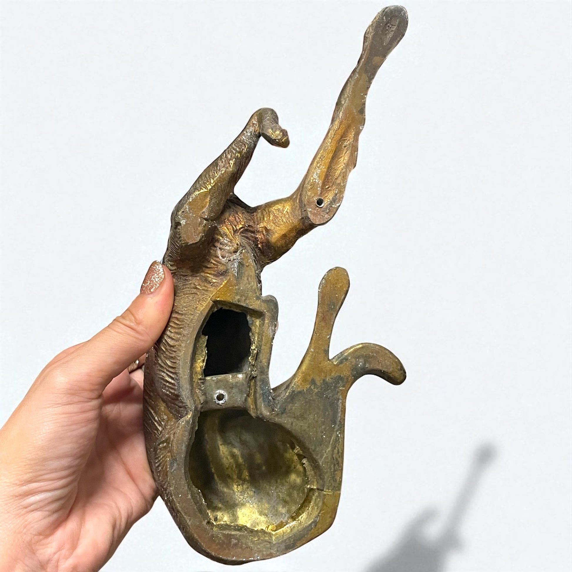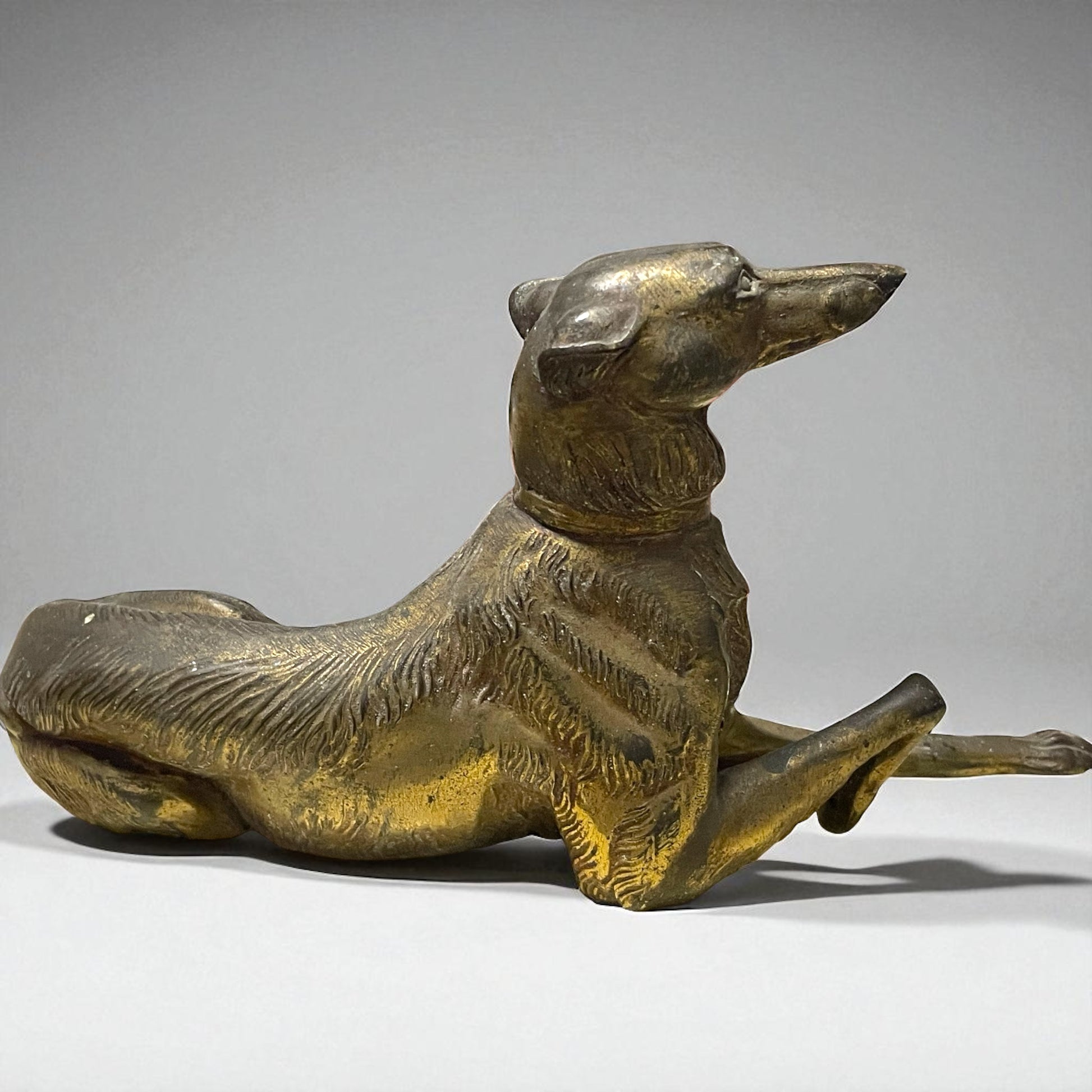 Statua art déco anni 1920–1930 ca in spelter o lega simie a finitura dorata. Dimensioni: 23 cm (lunghezza) x 13 cm (altezza). Provenienza: Francia, originariamente statua da orologio art déco da camino. Destinazione d’uso odierna: oggetto decorativo da caminetto, libreria, studio. Elegantissimo.