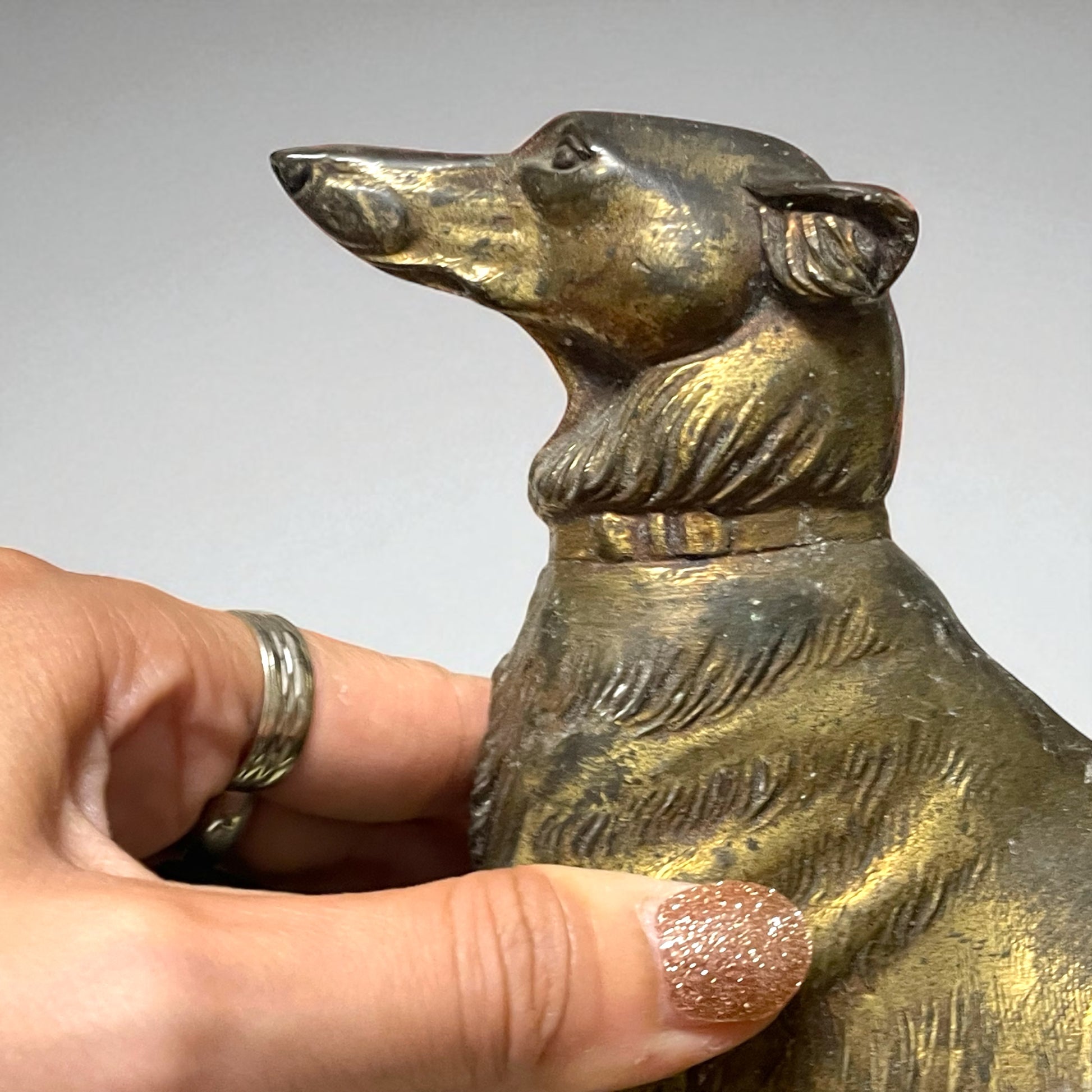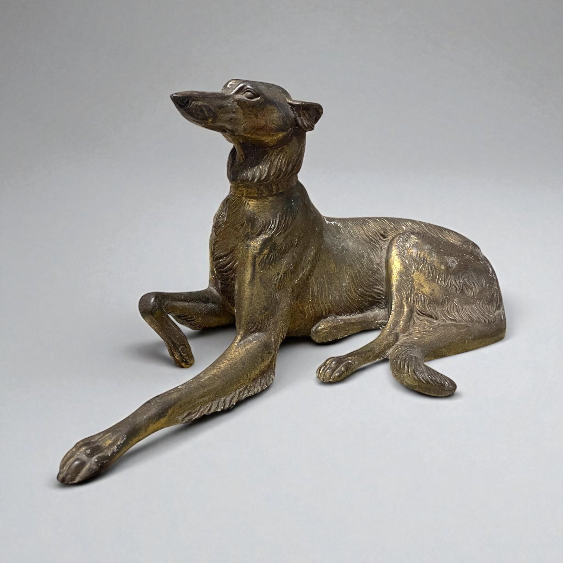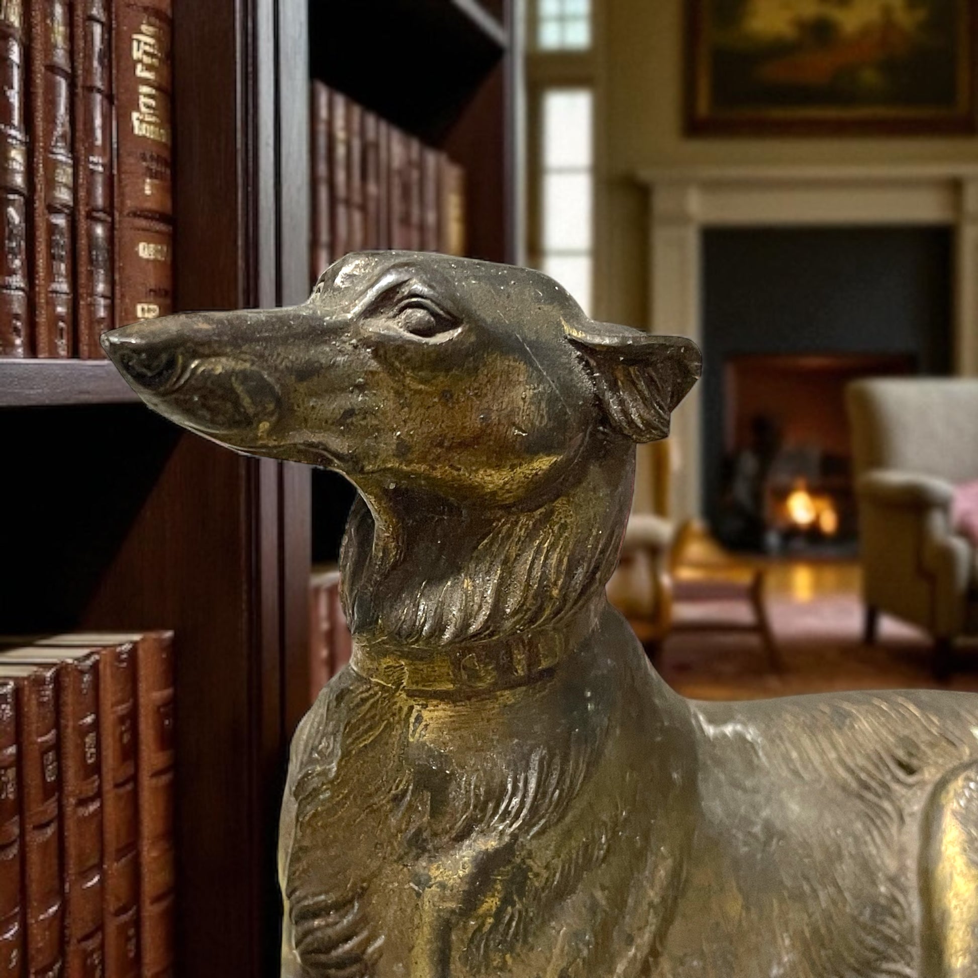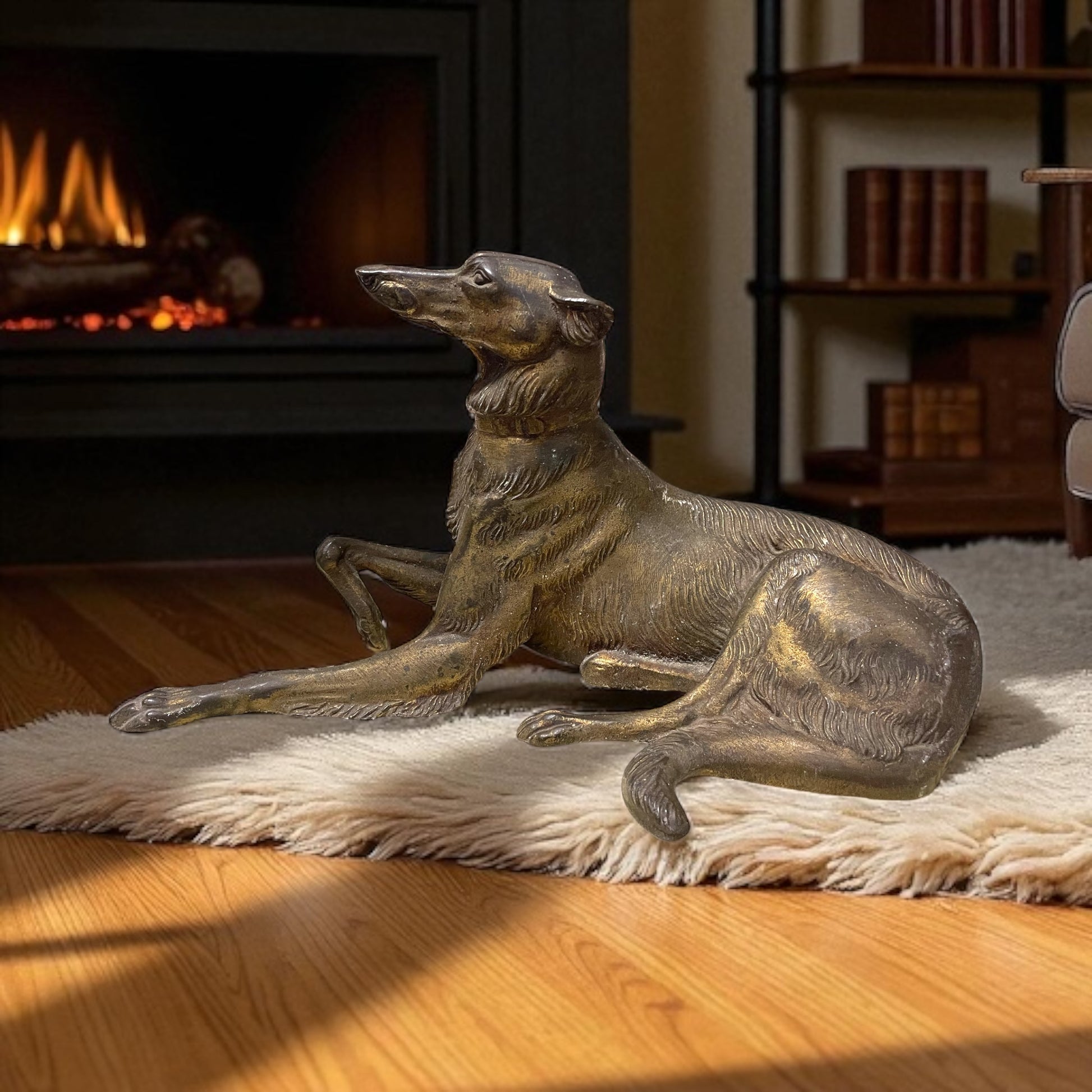 Un tempo lento, elegante, fatto di caminetti accesi, salotti in penombra e silenzi pieni di stile. Questo levriero, fiero e composto, un tempo vegliava su una pendola Art Déco. Non correva nei campi: correva tra le ore. Seduto su una base di marmo, seguiva lo scorrere del tempo con lo sguardo fisso, quasi altezzoso. Oggi resta solo lui, ma porta con sé tutta l’anima di quell’epoca. Perfetto come elemento decorativo, ma soprattutto come frammento poetico di un tempo che non torna, se non nei dettagli più belli.