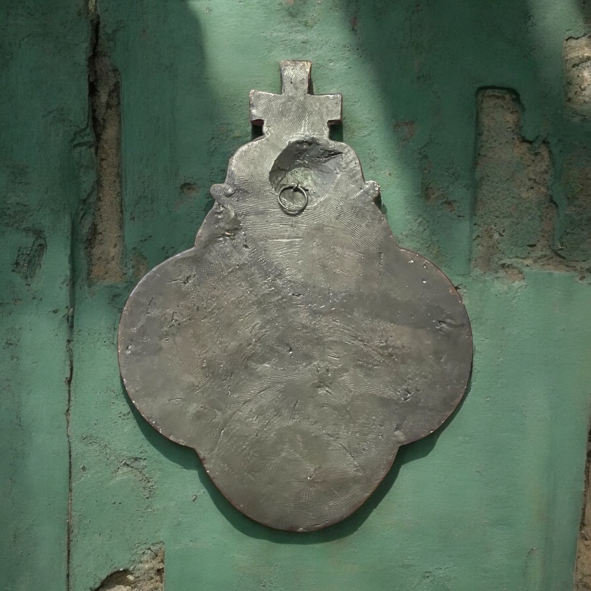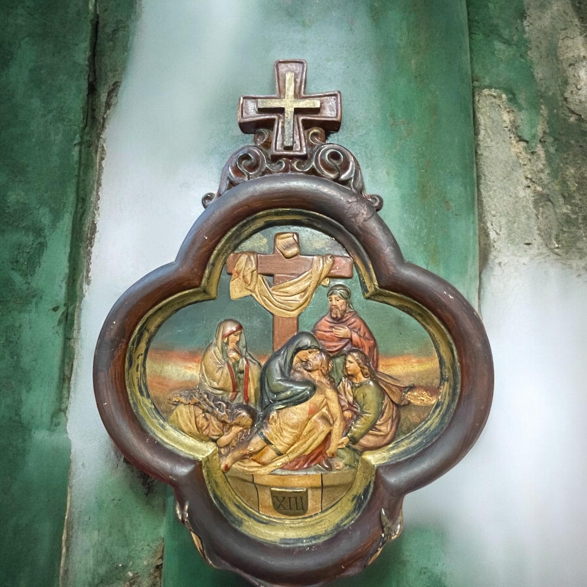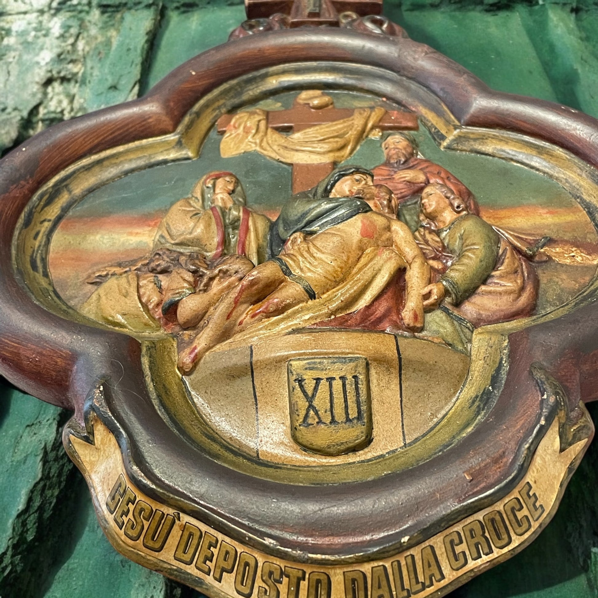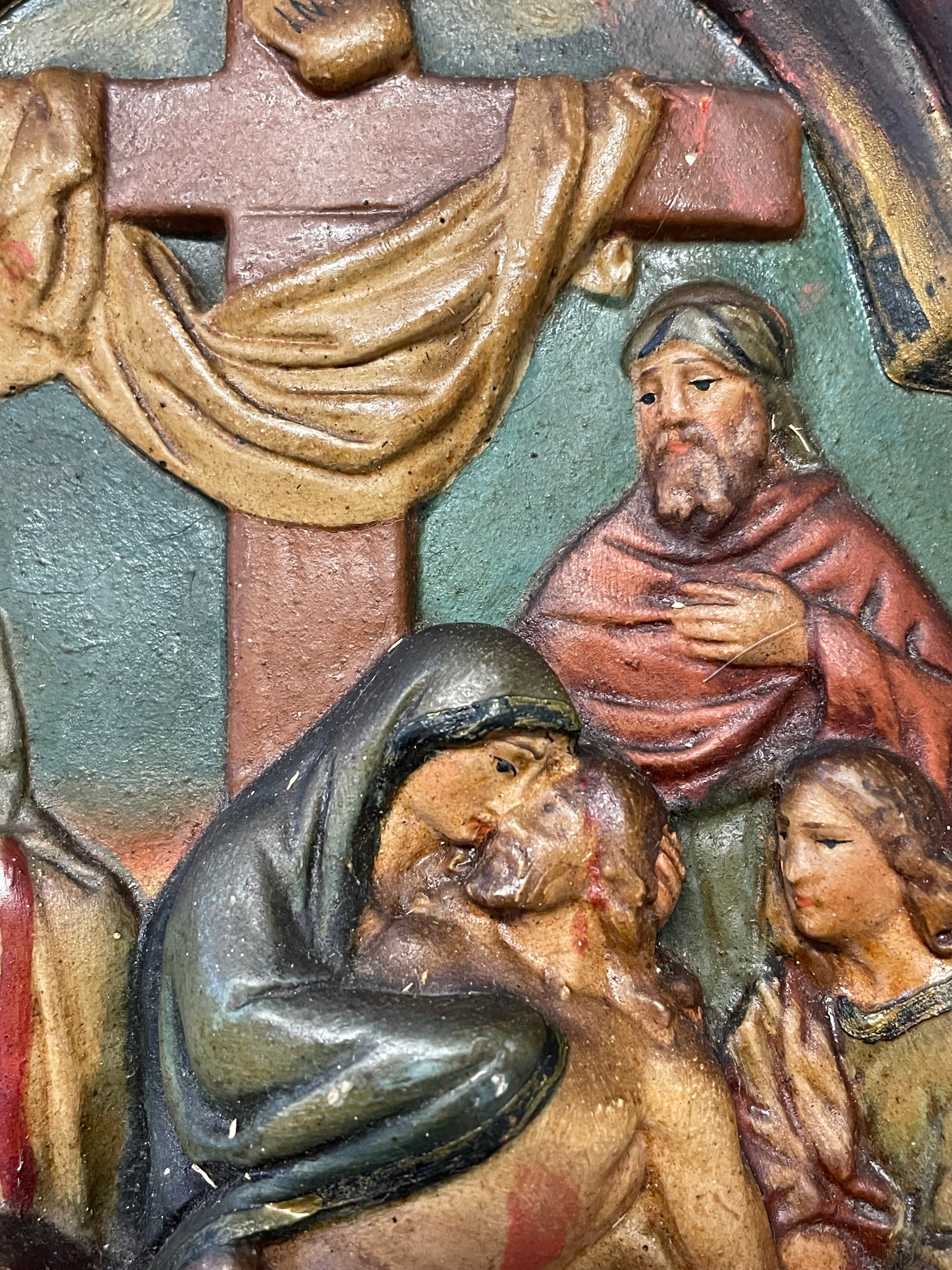 Il tempo sembra essersi fermato in questa scena sacra, sospesa tra il dolore e la tenerezza. Un frammento di devozione antica, plasmato nel gesso, ci racconta l’istante struggente in cui il corpo senza vita di Cristo viene deposto dalla croce. Maria, avvolta nel suo manto scuro, stringe a sé il volto del figlio con un amore che trascende la morte, mentre le altre figure, colme di mestizia, assistono al momento più umano e toccante della Passione: l’ultimo abbraccio, il silenzio denso di significato, il lutto che si fa preghiera. La cornice, solenne e armoniosa, incornicia la scena come un’antica reliquia, custodendo i colori ormai velati dal tempo. Un’opera che porta con sé il senso del sacro e la memoria di chi si è fermato davanti ad essa, sussurrando preghiere in un tempo che non ci è dato conoscere. Forse appartenuta a una piccola cappella privata, oggi continua a raccontare la sua storia a chi sa ascoltare. Dimensioni cm 41 x 30.