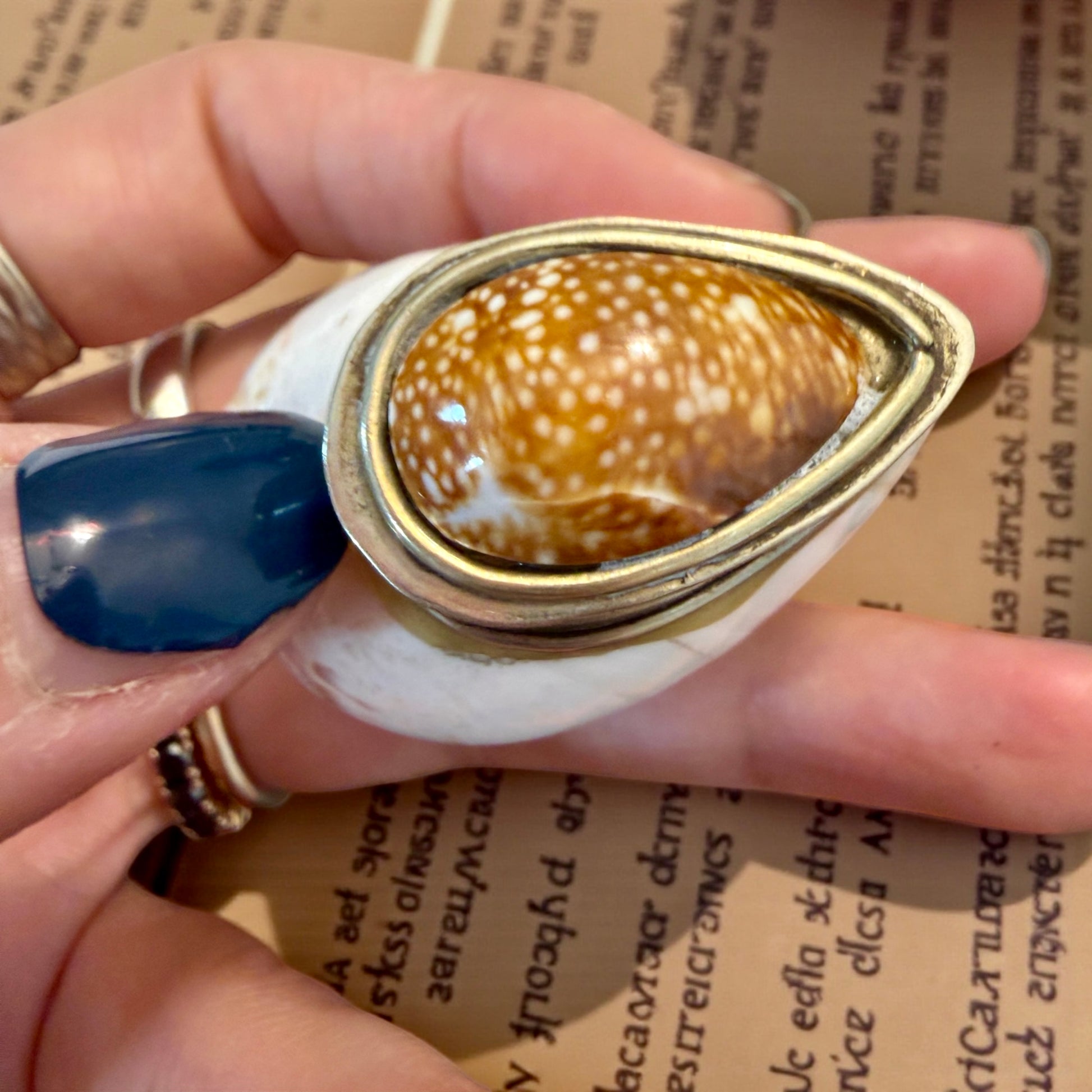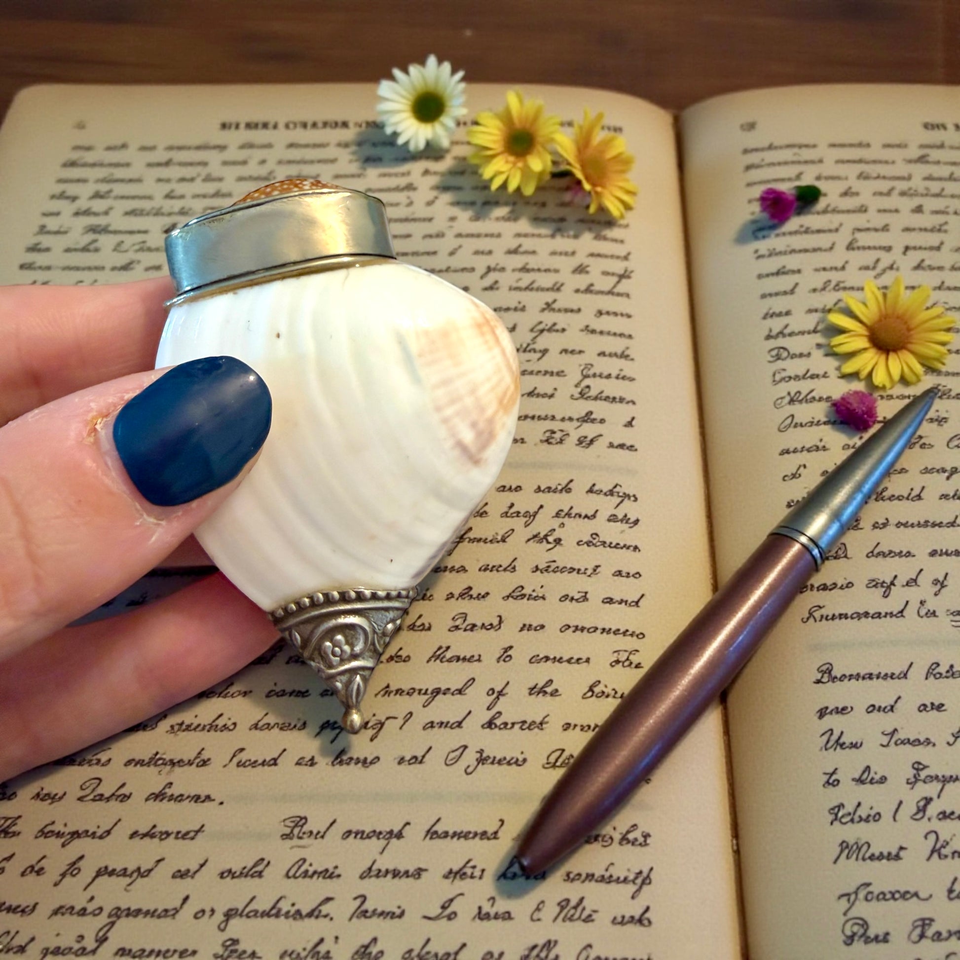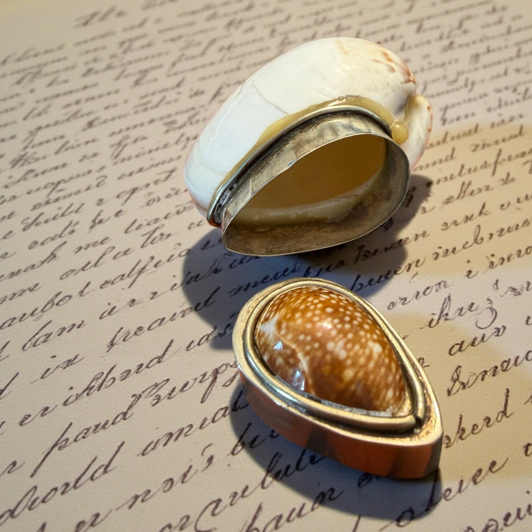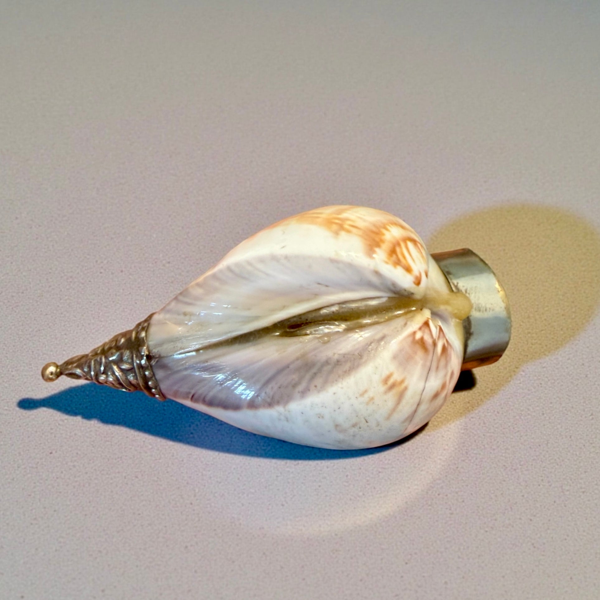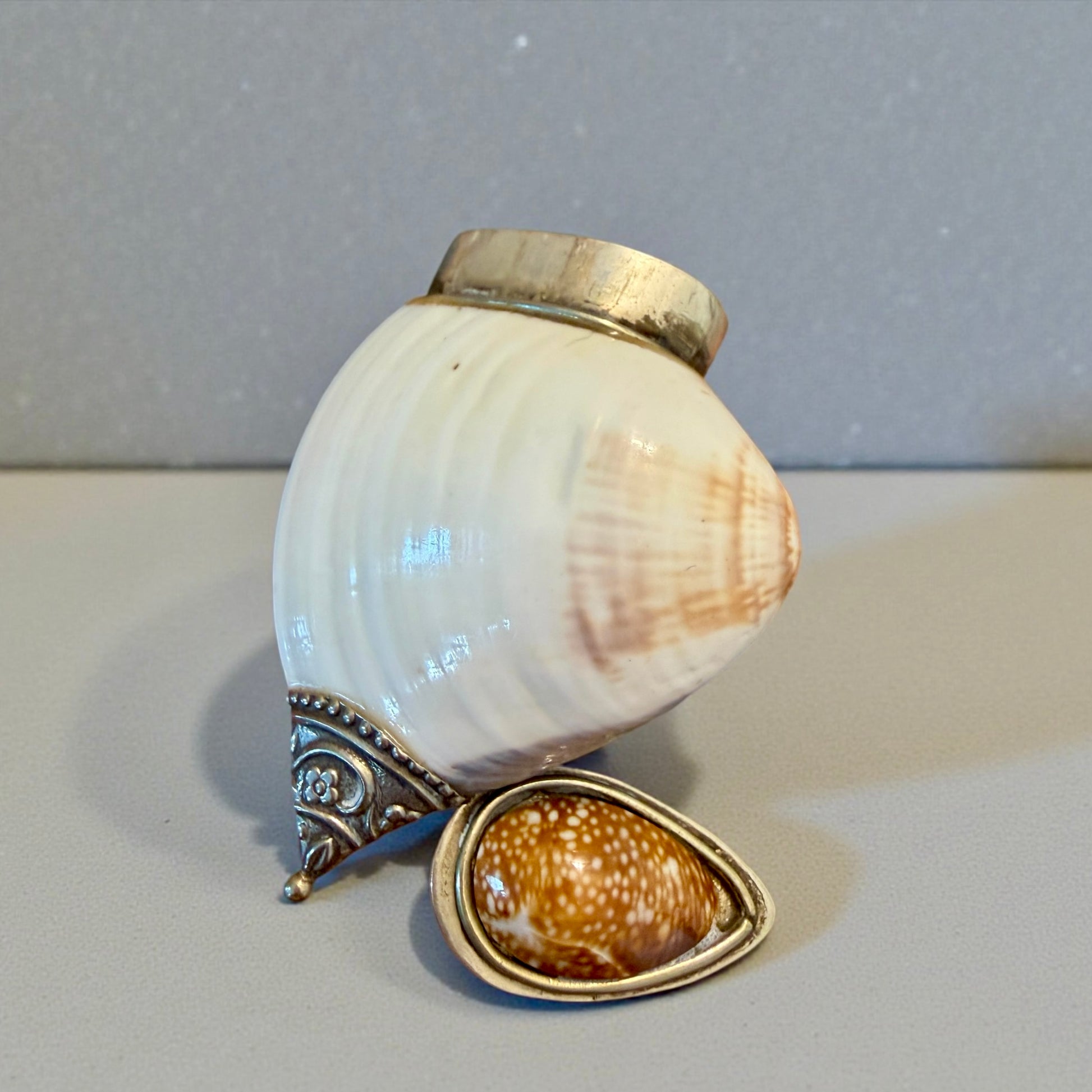 Non tutto ciò che usa materiali antichi appartiene a un tempo remoto. Questa tabacchiera da fiuto è un oggetto del Novecento, realizzato artigianalmente utilizzando una conchiglia naturale come corpo principale e una conchiglia diversa, più piccola, come coperchio completamente rimovibile, incassata in una montatura metallica argentata decorativa. La forma segue la materia: la conchiglia non è stata forzata, ma accompagnata. Le montature metalliche, lavorate con motivi floreali e bordini regolari, appartengono a un linguaggio decorativo tipico della metà del XX secolo, ispirato al gusto antiquariale. All’interno e lungo le giunzioni sono visibili residui di resina color ambra, non moderna, utilizzata come collante. Si tratta di una resina naturale di uso comune nella prima metà del Novecento, coerente con la tecnica costruttiva dell’epoca e con l’invecchiamento visibile. È un oggetto pensato per il gesto: aprire, chiudere, custodire. Un piccolo contenitore che dialoga più con la curiosità e il piacere tattile che con l’uso quotidiano.