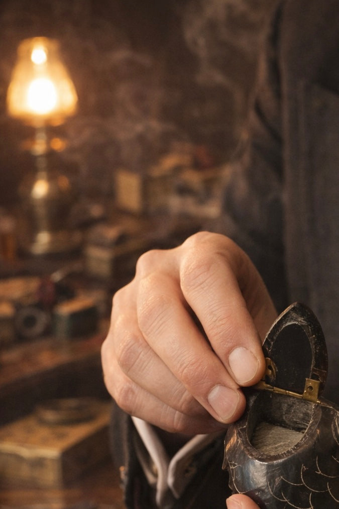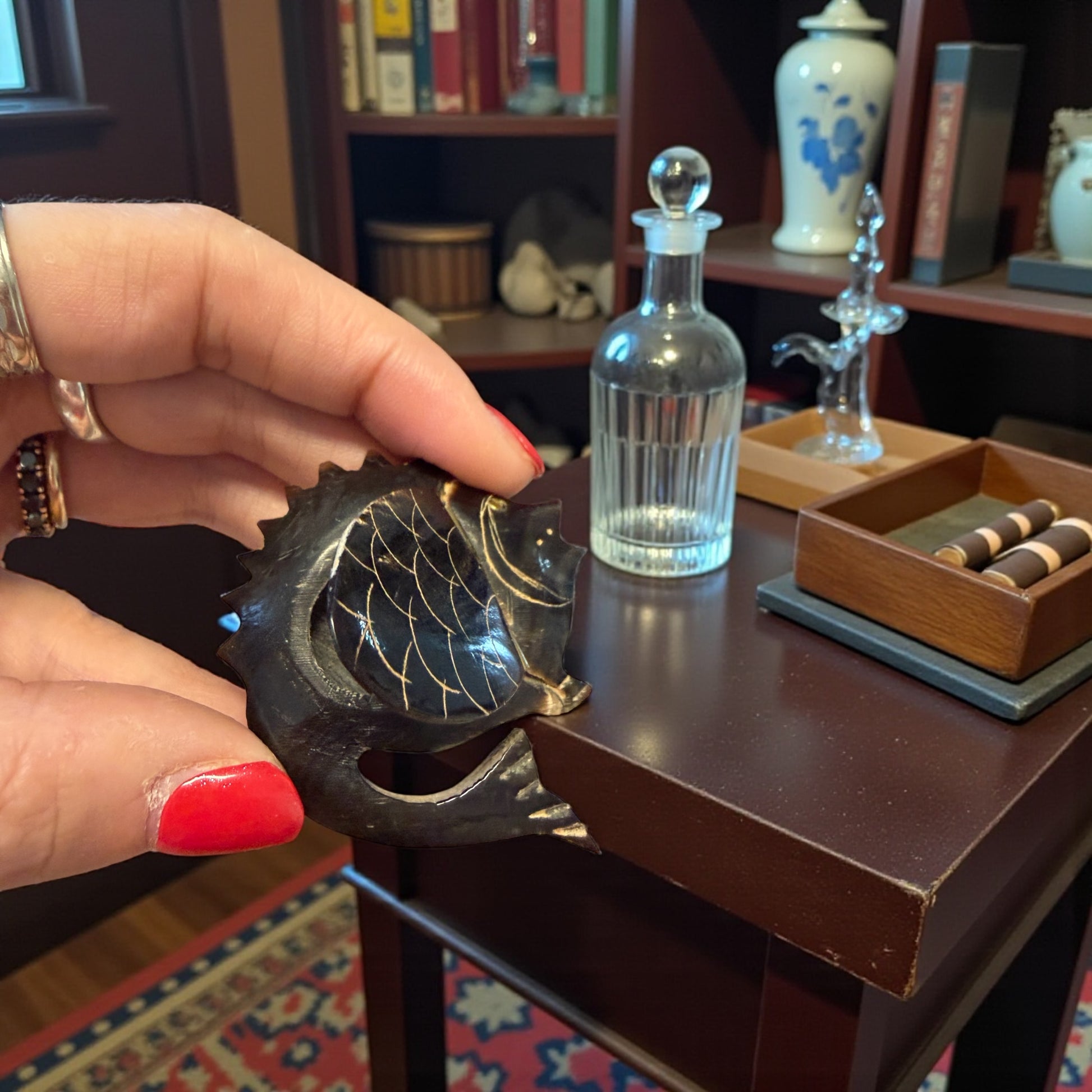 Un pesce che custodisce un segreto. Questa tabacchiera da tasca in corno naturale è scolpita interamente nella forma di un pesce stilizzato, compatto, ironico, sorprendentemente elegante. Il corpo pieno è levigato e scuro, attraversato da incisioni che richiamano le scaglie, seguendo il movimento naturale della materia. La coda è ricurva, il dorso seghettato, la linea complessiva fluida e armonica. La vera invenzione sta nella pinna: non è decorativa ma si apre, rivelando una piccola tasca interna scavata direttamente nel corpo del pesce. Un gesto semplice e ingegnoso che trasforma una scultura in un oggetto d’uso quotidiano. Nata come tabacchiera da tasca, oggi può essere utilizzata anche come contenitore per piccoli oggetti, portafortuna o curiosità da collezione. È un oggetto che unisce artigianalità, ironia e intelligenza progettuale, capace di farsi notare senza mai essere eccessivo. Un piccolo pesce che sta in tasca, ma non passa inosservato.