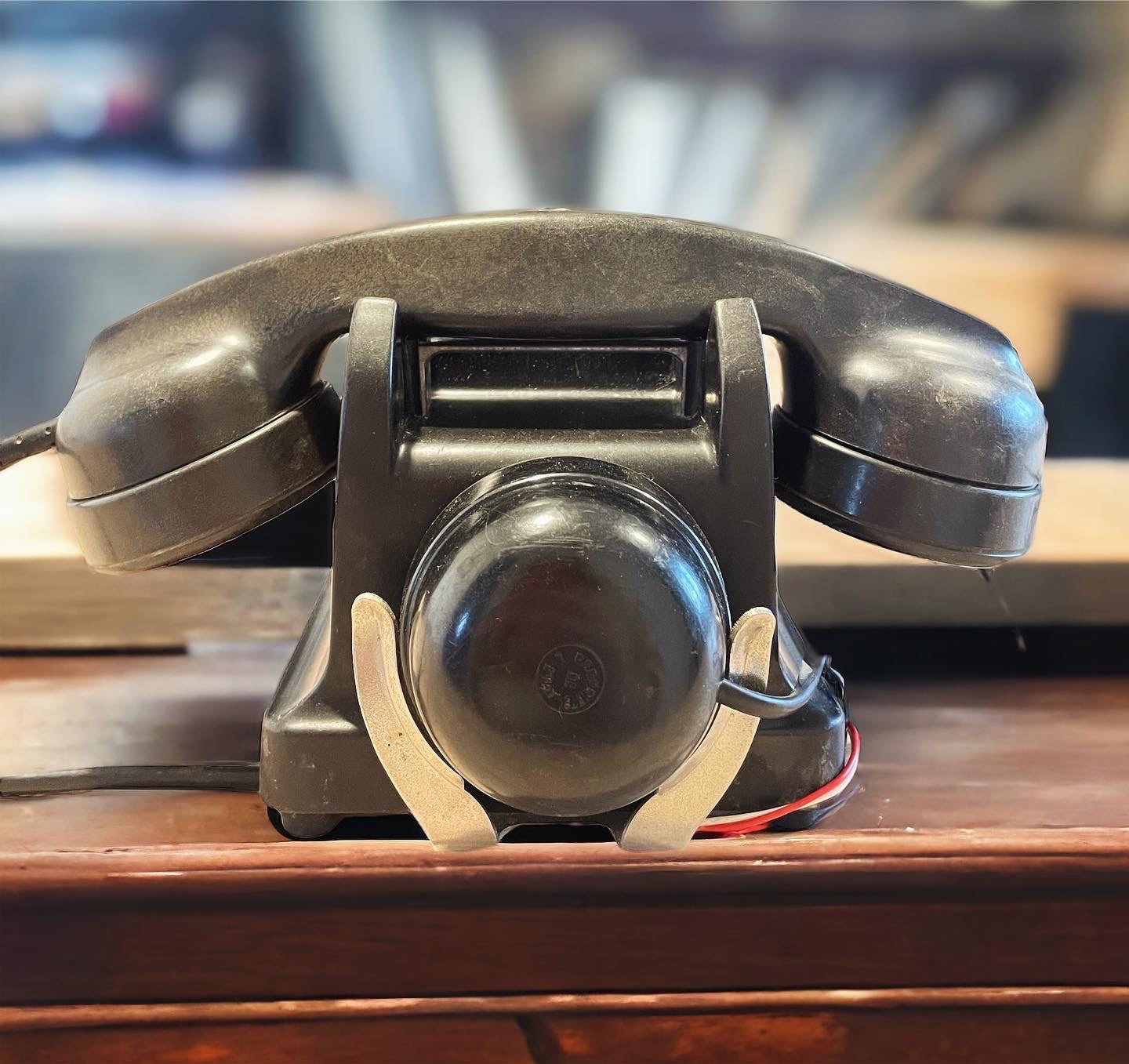 This black Bakelite telephone produced by PTT is a very unusual model, because as you can see it has no buttons or dials where you can dial the number. This is because it is used exclusively to connect to the switchboard; where probably a kind lady would have asked you who you wanted to contact. The switchboard is called by rotating the silver lever that you can see on the front. It is complete with its ringtone (not tested) and shows the serial number and the year of production: 1962. Its more than sixty years wears them admirably; the only defect in the photo is a small piece of Bakelite missing from one of the earphone ends. An austere and elegant piece of furniture perfect for a hall or for your professional studio.