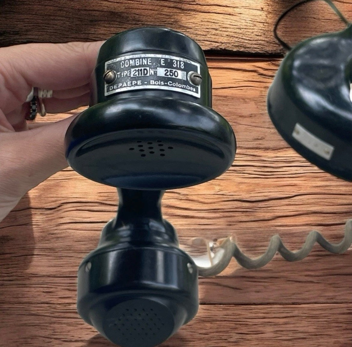Telefono francese a disco, modello Appareil Mobile BCI Mod. 1924. Produttore: Grammont, Parigi (targhetta originale). Cornetta Depaepe, Bois-Colombes (marchiata). Quadrante con lettere e cartiglio centrale con numeri di emergenza francesi. Periodo: 1924 – primi anni ’30. Stato: ottimo per collezione e arredo.