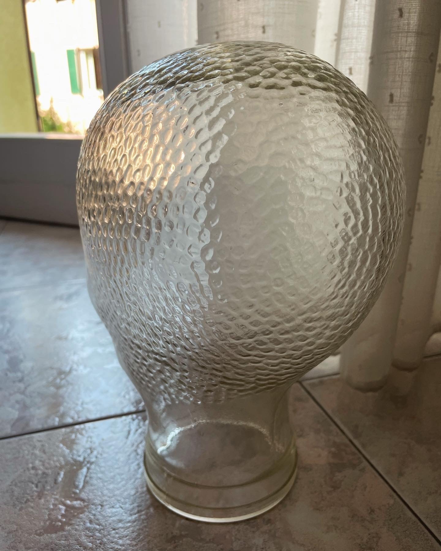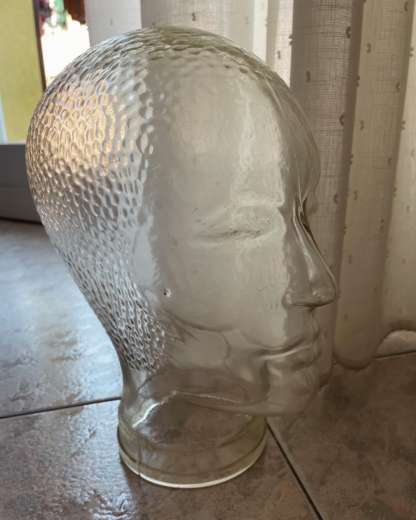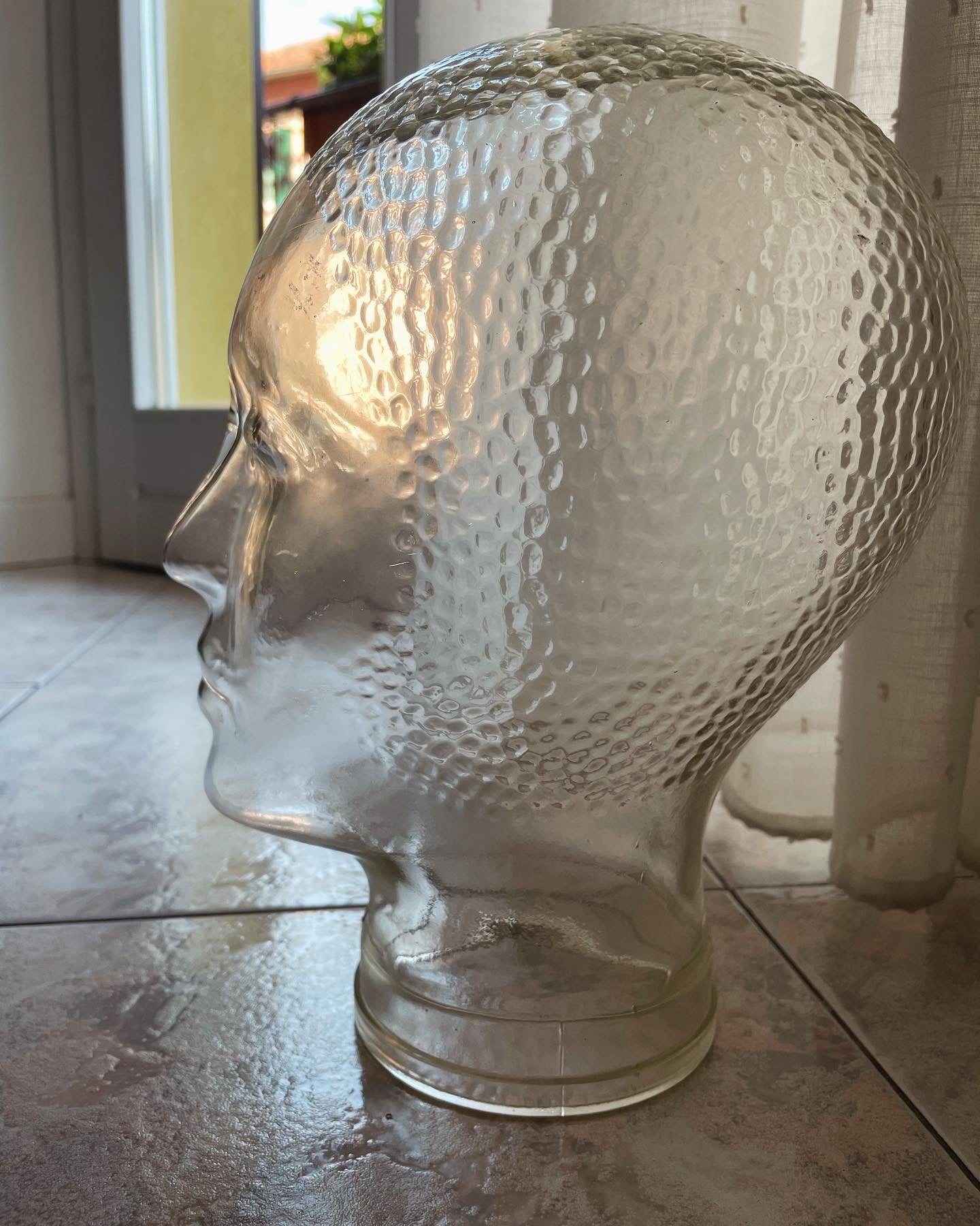In the style of Fornasetti (it was really a must-have) here is the original vintage glass head from the 70s; a beautiful piece of modern furniture, in excellent condition. Perfect on a hypermodern piece of furniture as well as revisited to display headphones or hats. Height: 28 cm.