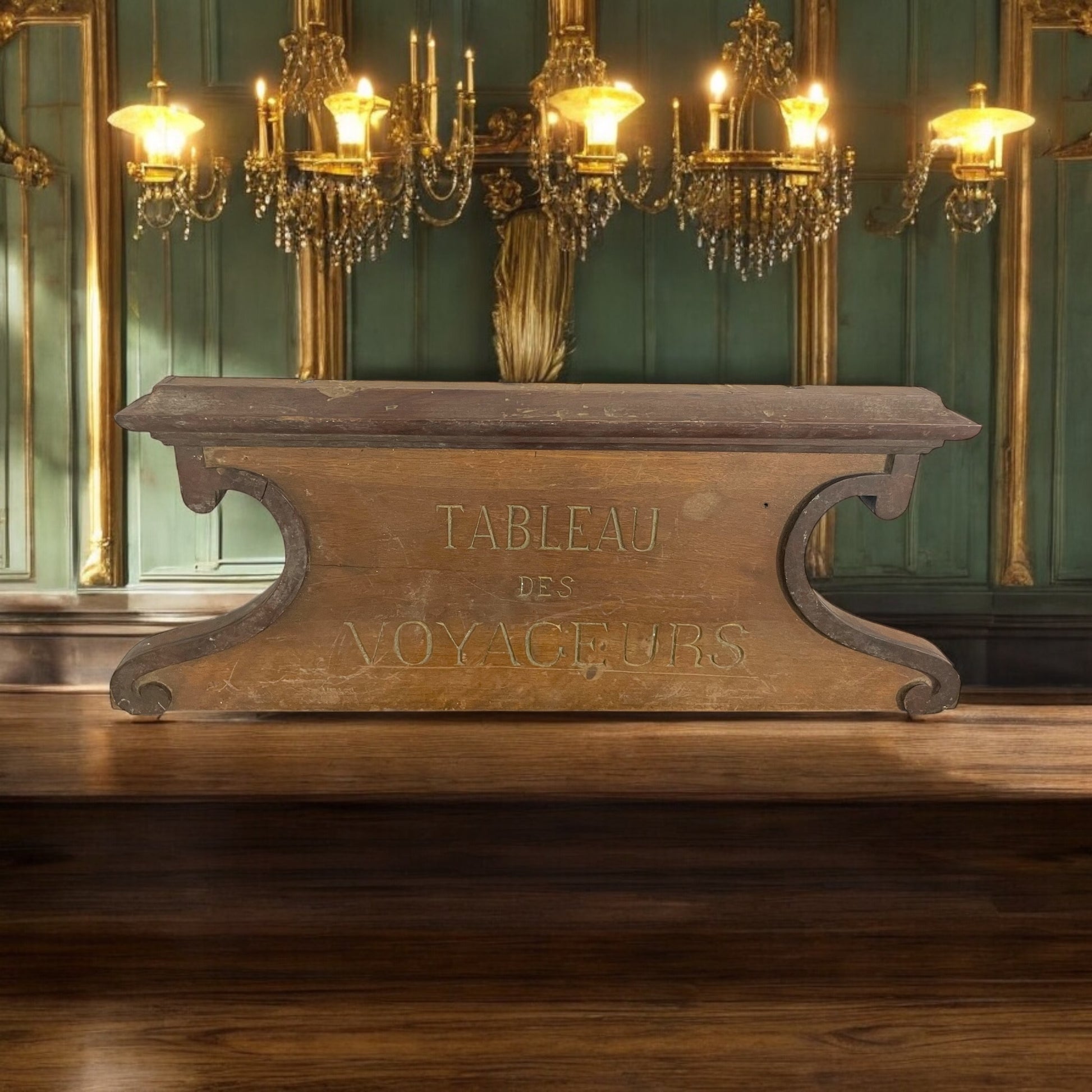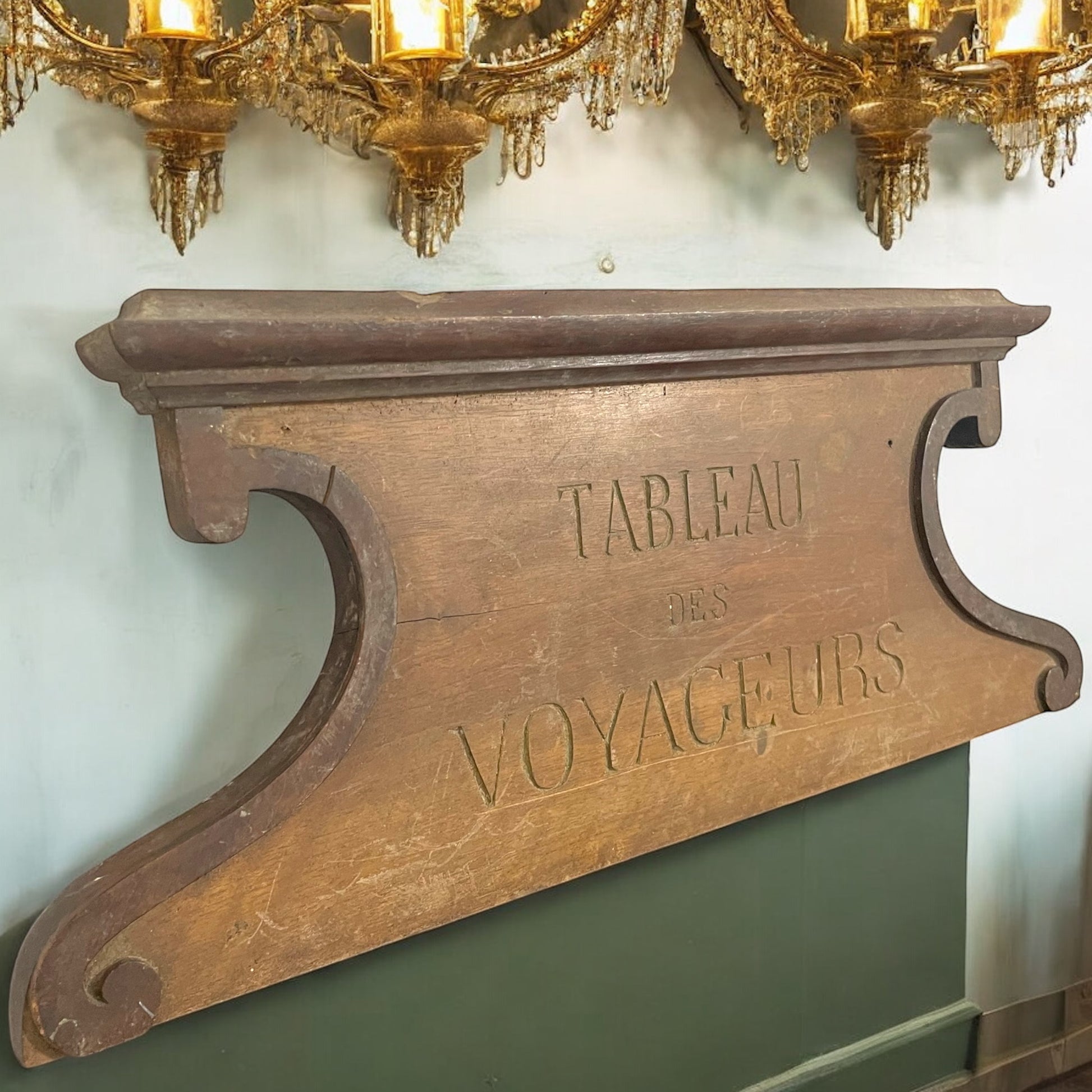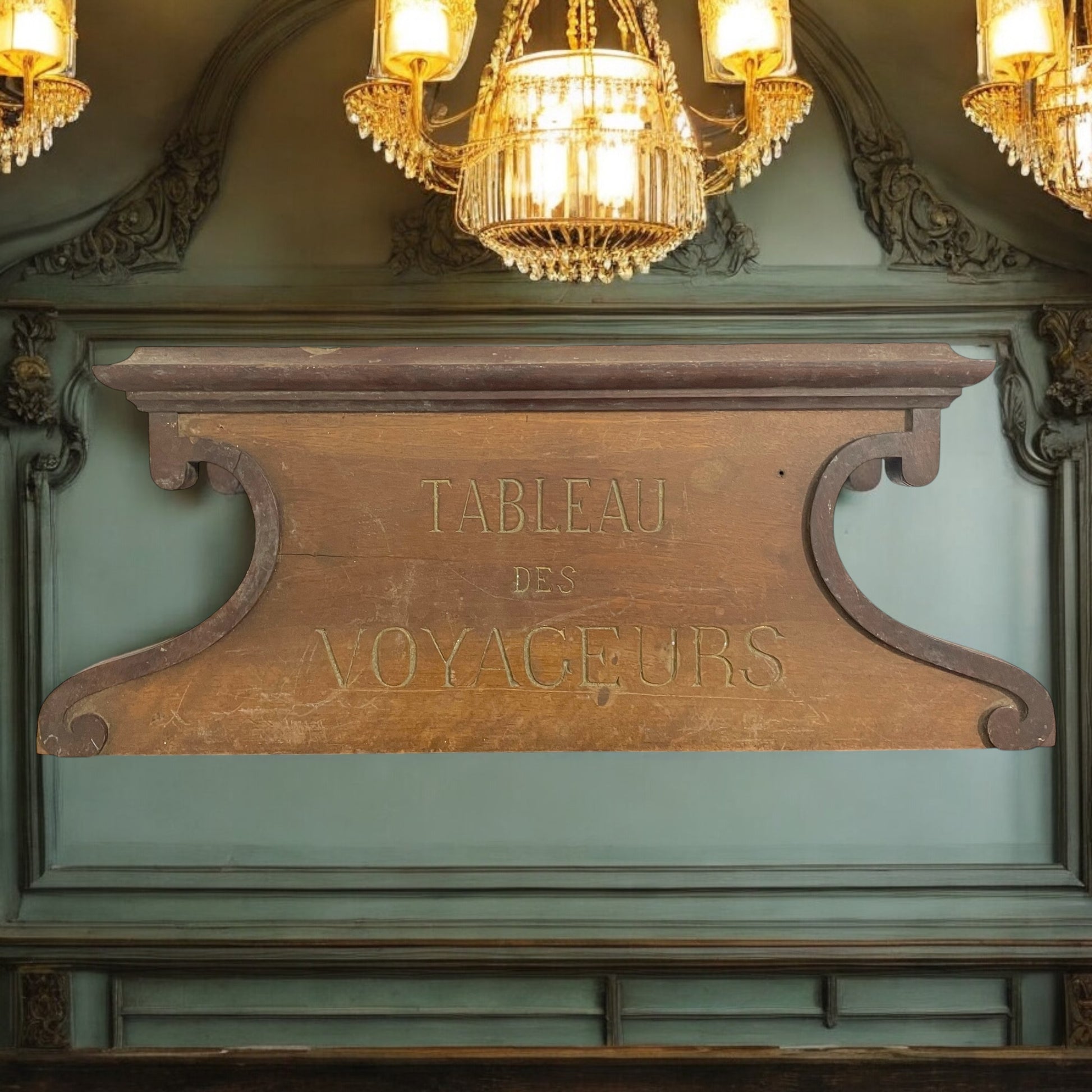 Era una sera d’inverno del 1897 e la Gare de Lyon, a Parigi, brillava sotto la luce calda dei lampadari a gas. L’odore di fuliggine e ferro si mescolava al profumo dei cappotti di lana e delle valigie in cuoio. I viaggiatori nei loro mantelli si affrettavano lungo la banchina, mentre i facchini trascinavano bauli col passo di chi sa che ogni minuto conta. In una sala più riservata, un piccolo pannello in legno attirava lo sguardo. Con la scritta dorata “Tableau des Voyageurs” svolgeva una funzione preziosa: lì sotto erano elencati gli oggetti smarriti che il personale aveva ritrovato durante il giorno. La penna scivolava tra le dita di Monsieur Léon, che da oltre vent’anni si occupava di quel piccolo rituale serale. Con pazienza, aggiornata la lista, piegava i cartoncini con le descrizioni degli oggetti e li infilava negli appositi ganci sotto il pannello. A volte si fermava a pensare a chi potessero appartenere quei pezzi di vita: un ombrello lasciato accanto al banco dei giornali, una sciarpa dimenticata su una poltrona della sala d’attesa. Quella sera, mentre il vapore dei treni si levava denso oltre le vetrate appannate, Léon aggiunse un nuovo biglietto: “Petit carnet noir - Retrouvé sur le banc du quai 3.” Lo aveva sfogliato con discrezione prima di appenderlo: nomi, indirizzi, qualche riga scritta di fretta… Forse un uomo d’affari? Léon non poteva saperlo, ma si augurava che qualcuno, leggendo l’avviso, si avvicinasse e domandasse speranzoso: “Per caso avete trovato un taccuino nero?”. Quella cornice in legno, larga 50 cm, custodiva storie perdute e ritrovate. E ogni sera, sotto la luce fioca, Léon scriveva con calma; come se ogni parola potesse restituire al mondo un pezzo dimenticato della vita di qualcuno. Oggi questa testata, ancora in condizioni molto buone, può diventare una versatile cimasa o ritornare ad essere parte di una bacheca - in un ristorante di lusso, o una dimora di charme.