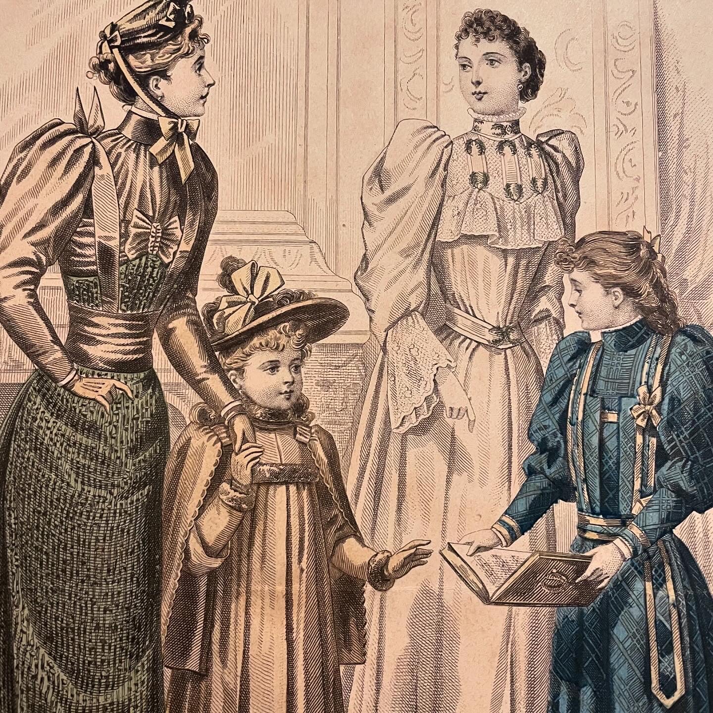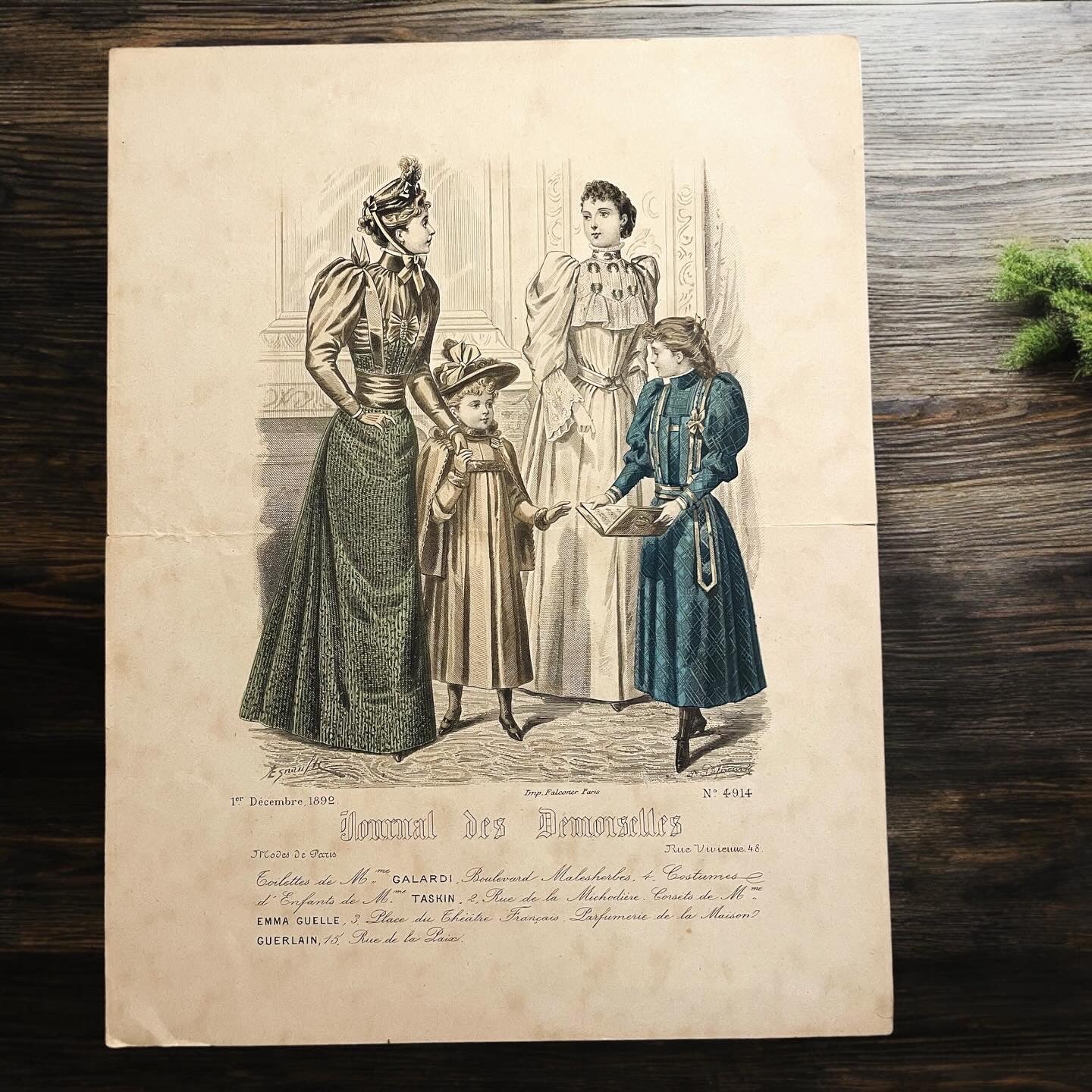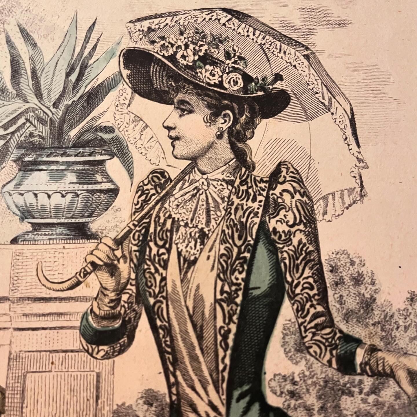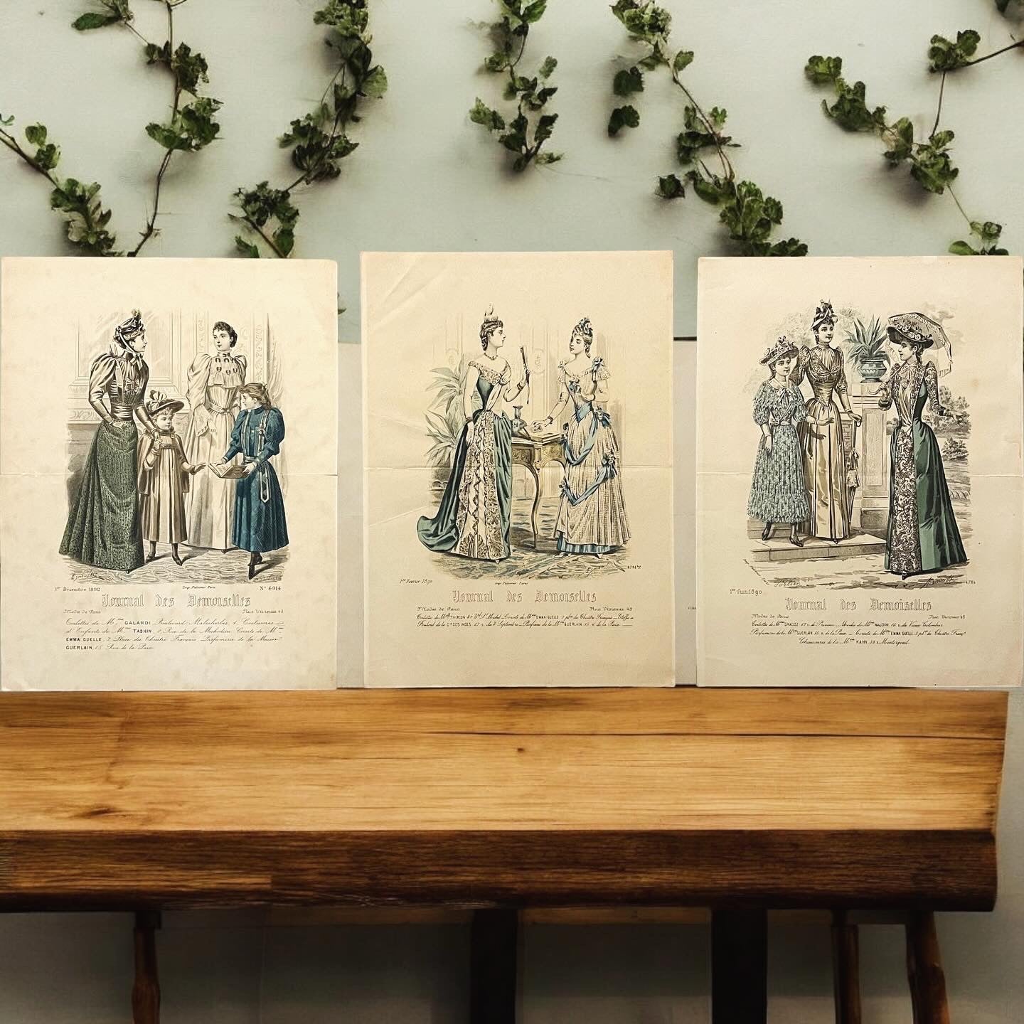 Splendid trio of antique millinery prints dating back to the 19th century, precisely 1892. Each of them, signed, presents us with the elegance of timeless accessories and clothes: printed exclusively for the Journal des Demoiselles, the lower part features the prestigious names of those who supplied fabrics, dressing tables, make-up, hats - commendable names such as Guerlain, to give an example. They are wonderful to frame and display in an atelier. They measure 32 x 24 cm - they are not perfectly coincident in size. The only defect is a tear on one of the three at the fold, which does not reach the image or is visible.