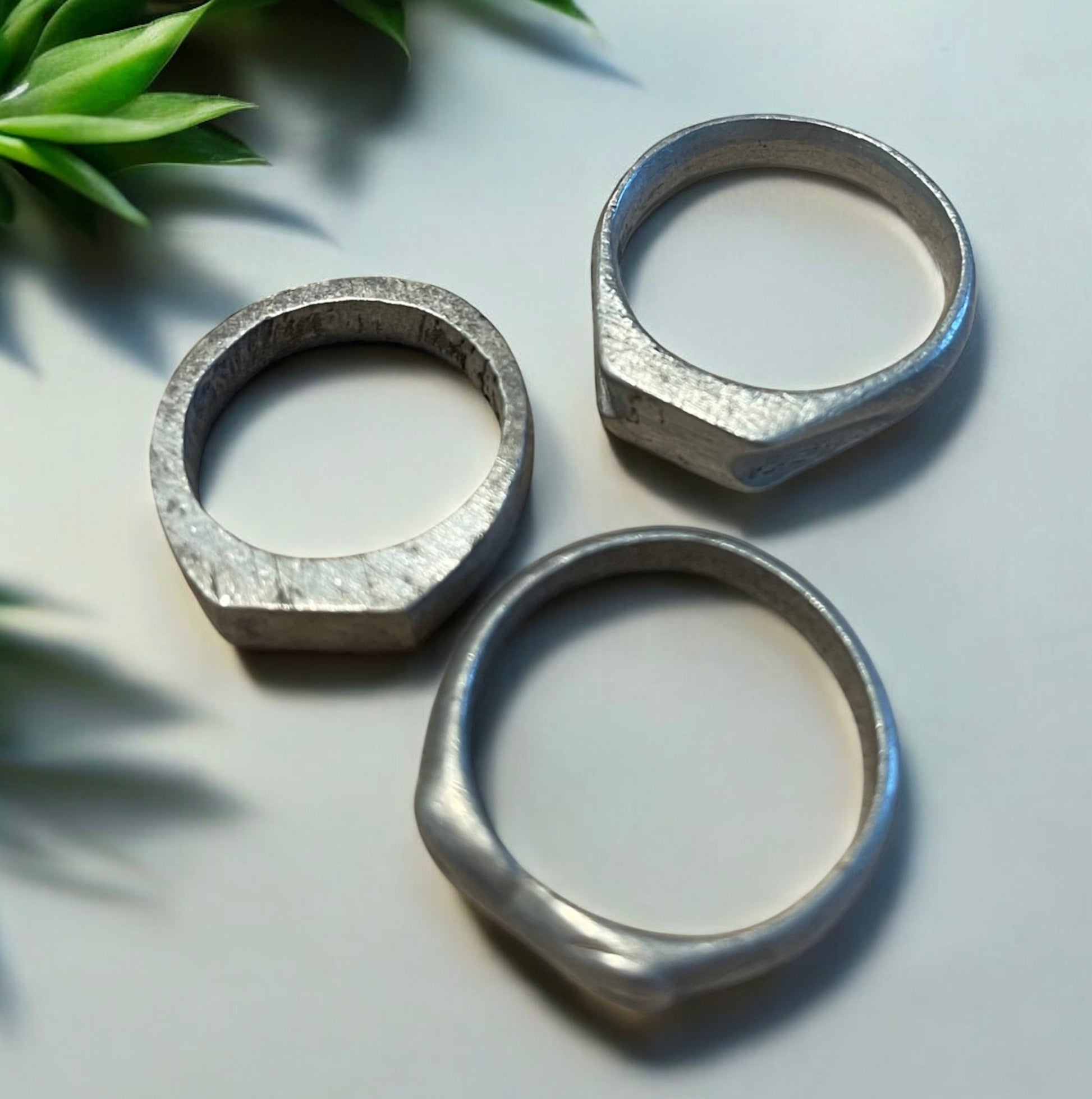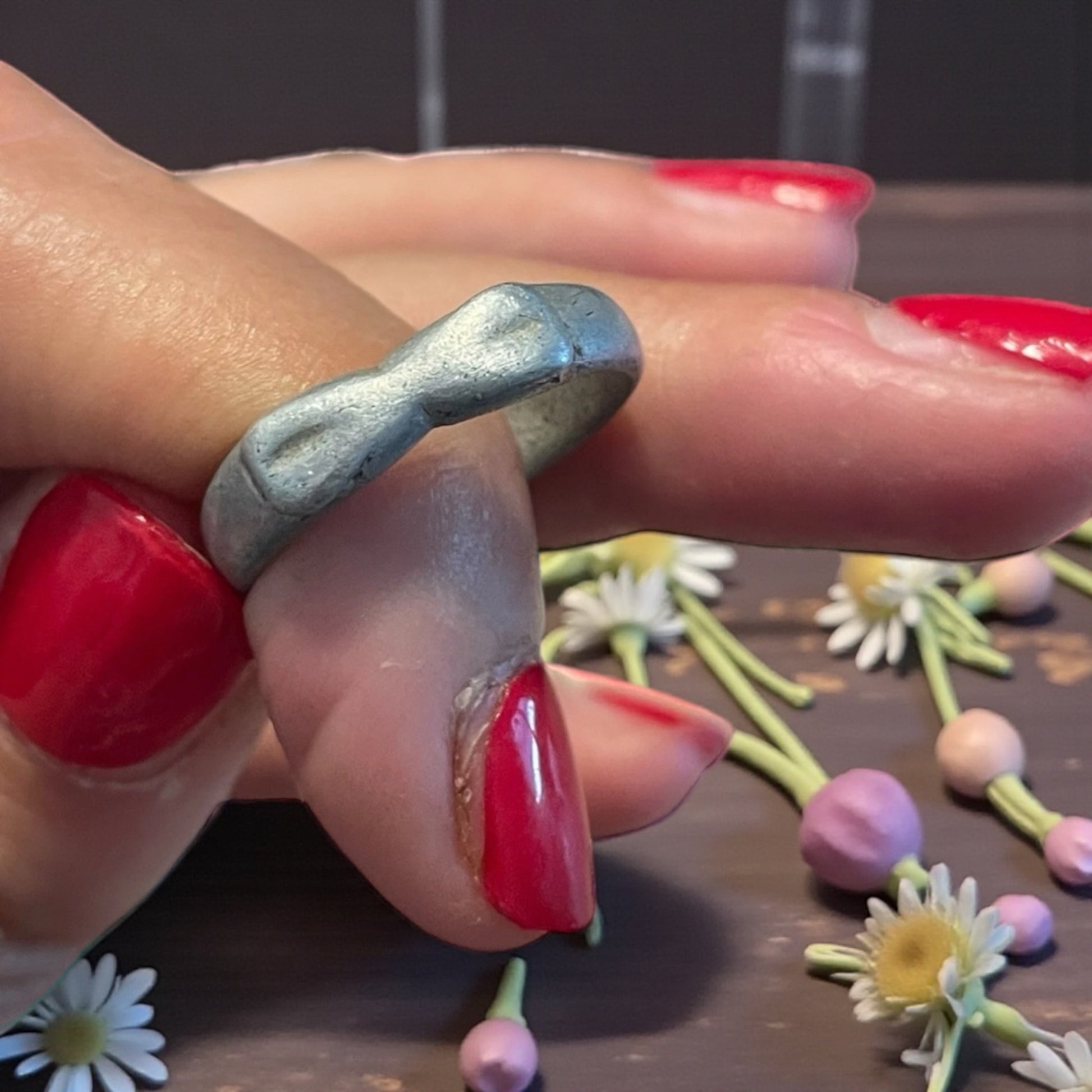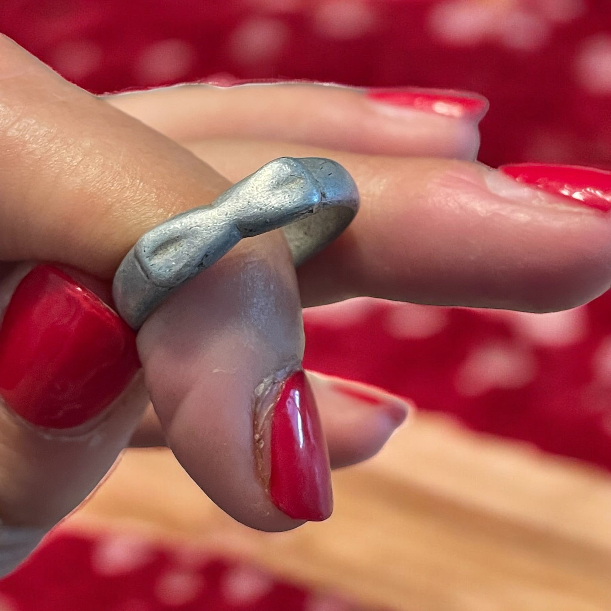 Eppure, tra le mani sporche di guerra, trovavano la forza di plasmare un gesto d’amore. Questi anellini francesi da trincea sono piccoli, come le dita che avrebbero dovuto indossarli. Fidanzatine lontane, sorelle da proteggere, promesse silenziose incise nel metallo quando le parole erano troppo fragili. Forgiati con utensili di fortuna, ricavati da bossoli o schegge di granata, raccontano un’umanità che resiste, anche nei giorni più cupi. Li immagini mentre limano, incassano, stringono le labbra nella concentrazione. Li senti battere piano, come se ogni colpo dicesse: “Aspettami”. E oggi, chi li osserva sente il peso lieve di una memoria viva, che non vuole essere dimenticata. Misure diametro interno: 15,14 e 8 mm. Perfetti come pendenti ad una catenina, meraviglioso come regalo simbolico dal fortissimo contenuto emotivo.