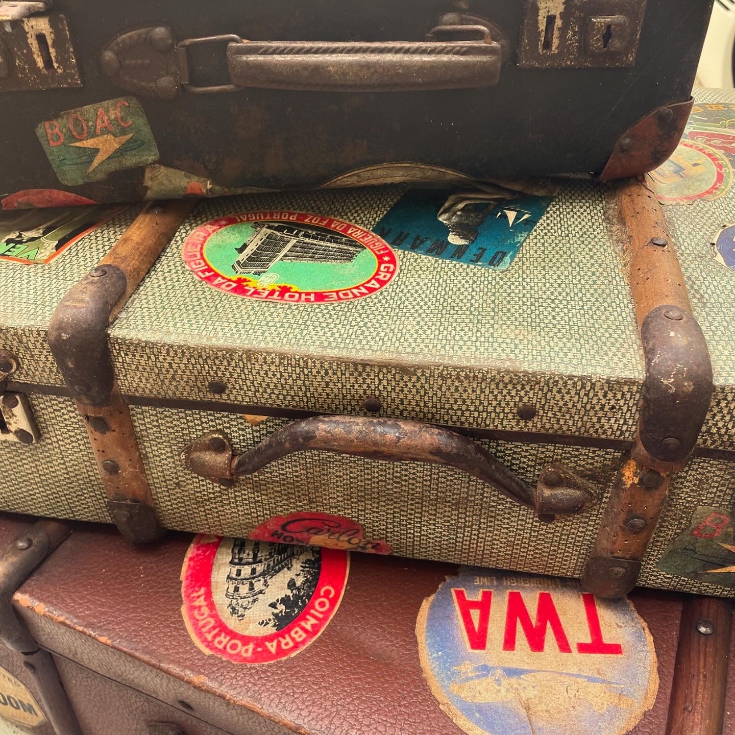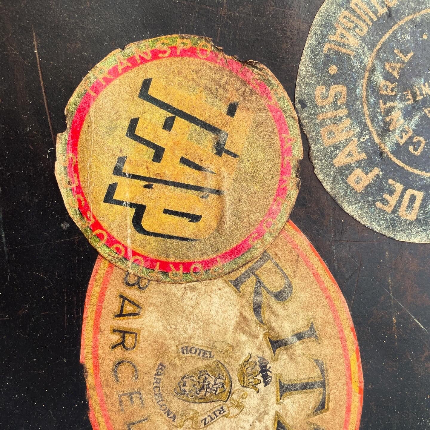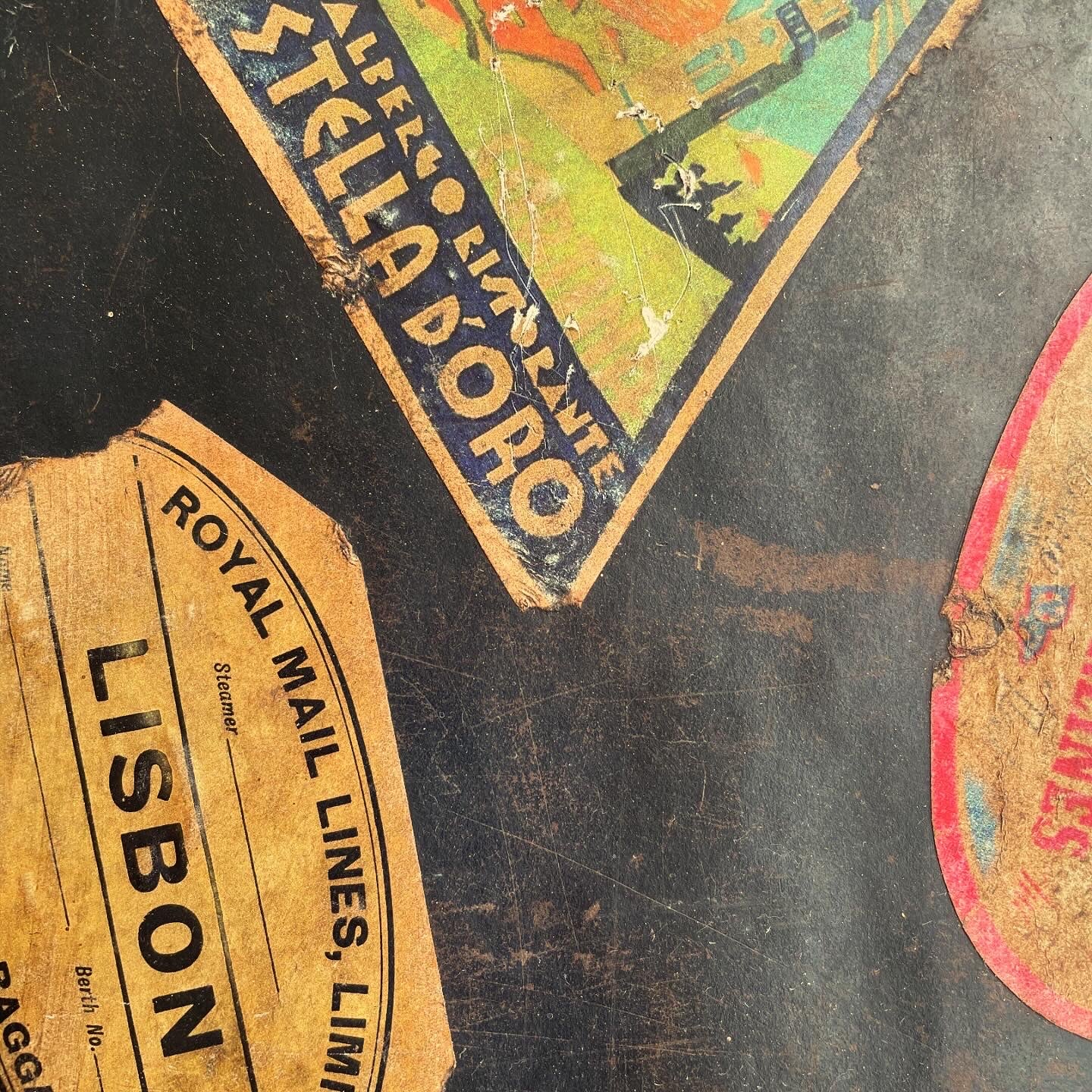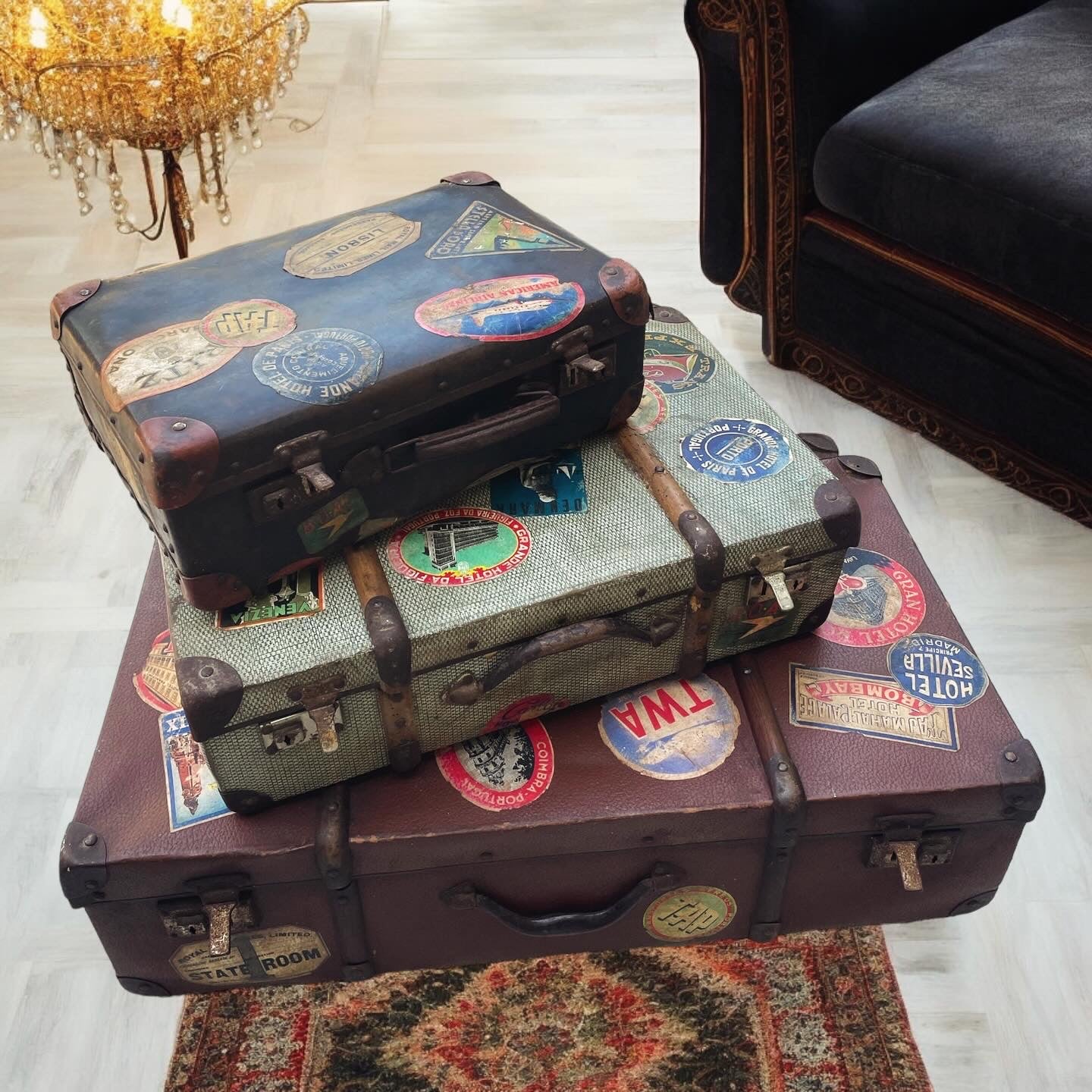 Wonderful trio of antique suitcases, much sought after to create sets like the one you see in the photo, in the form of small tables on an antique precious carpet, perhaps with a leather sofa in the background. Sought after by collectors for vintage car and motorcycle setups. These three suitcases belonged to the same owner, a very wealthy person from the Spanish bourgeoisie, who lived at the beginning of the century. Each of them is different from the other and each is literally covered with the highly sought after stickers of the most exclusive hotels in all of Europe - and Italy - in the 20s and 30s. These are not reworked pieces but absolutely original; whoever takes them home will have furnished an unforgettable living room. The dimensions are as follows: