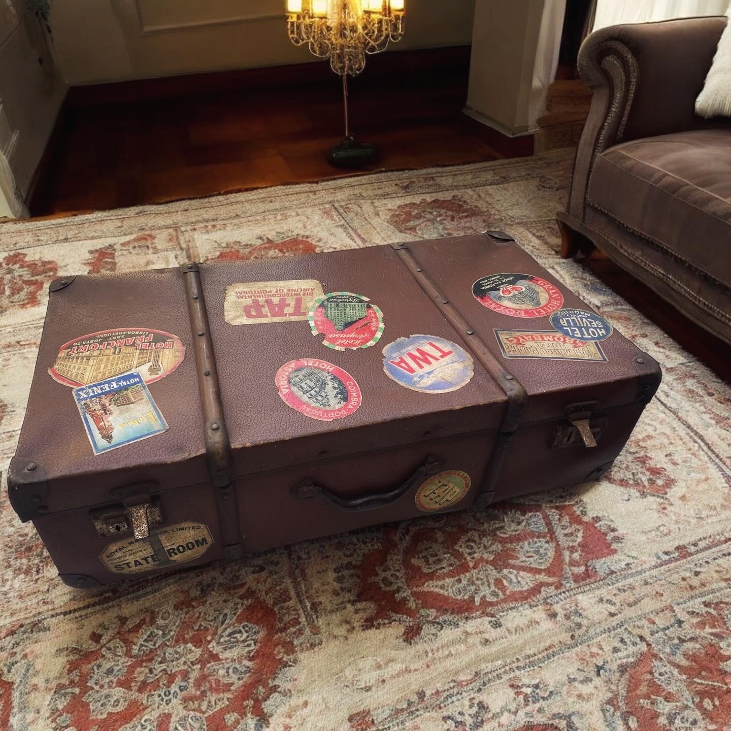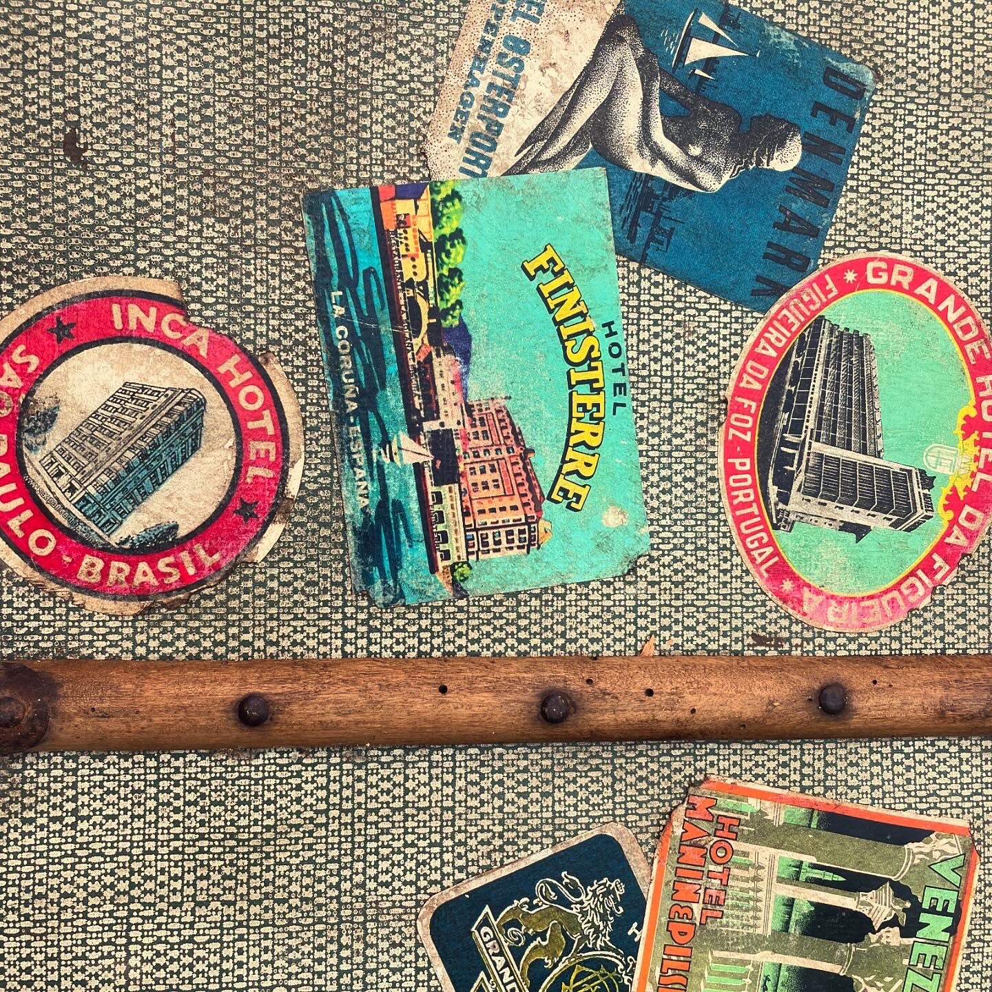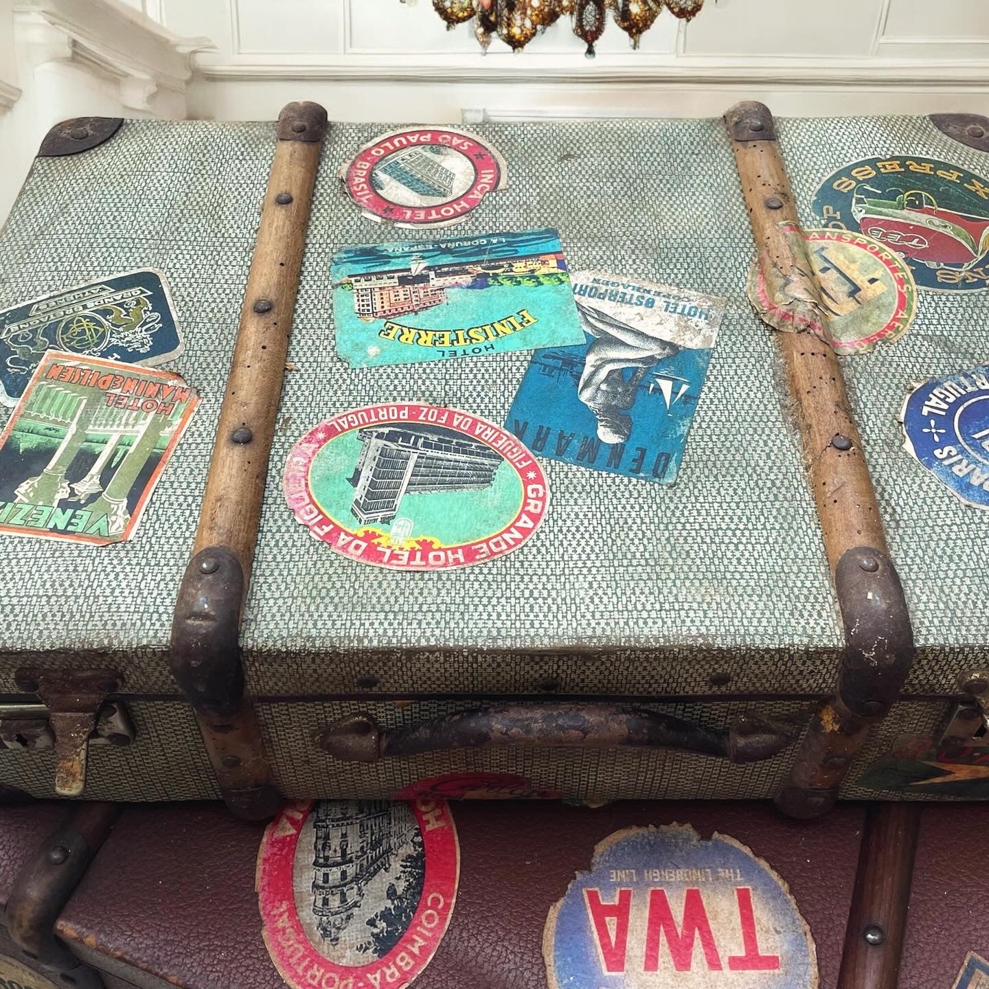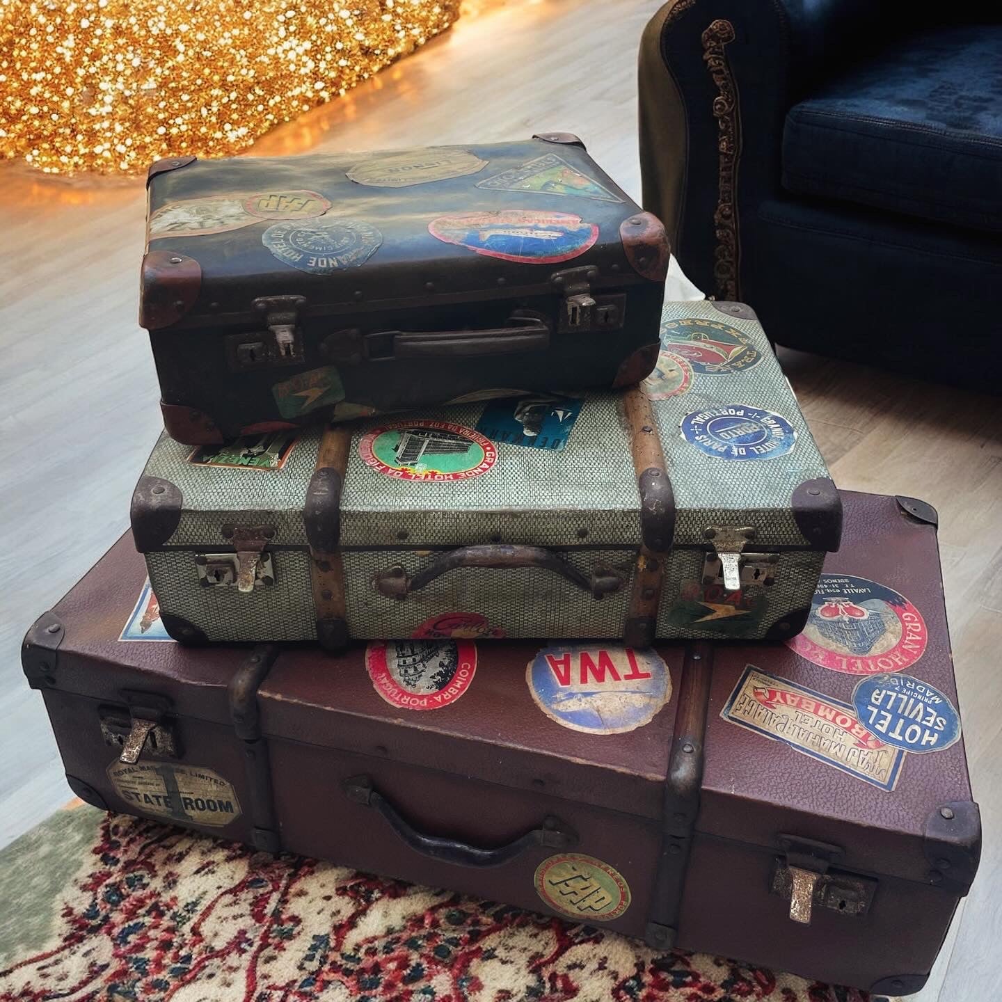 Wonderful trio of antique suitcases, much sought after to create sets like the one you see in the photo, in the form of small tables on an antique precious carpet, perhaps with a leather sofa in the background. Sought after by collectors for vintage car and motorcycle setups. These three suitcases belonged to the same owner, a very wealthy person from the Spanish bourgeoisie, who lived at the beginning of the century. Each of them is different from the other and each is literally covered with the highly sought after stickers of the most exclusive hotels in all of Europe - and Italy - in the 20s and 30s. These are not reworked pieces but absolutely original; whoever takes them home will have furnished an unforgettable living room. The dimensions are as follows:
