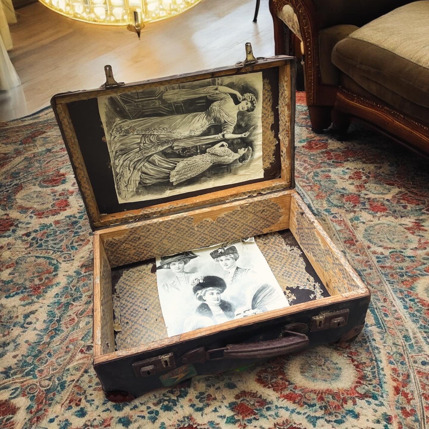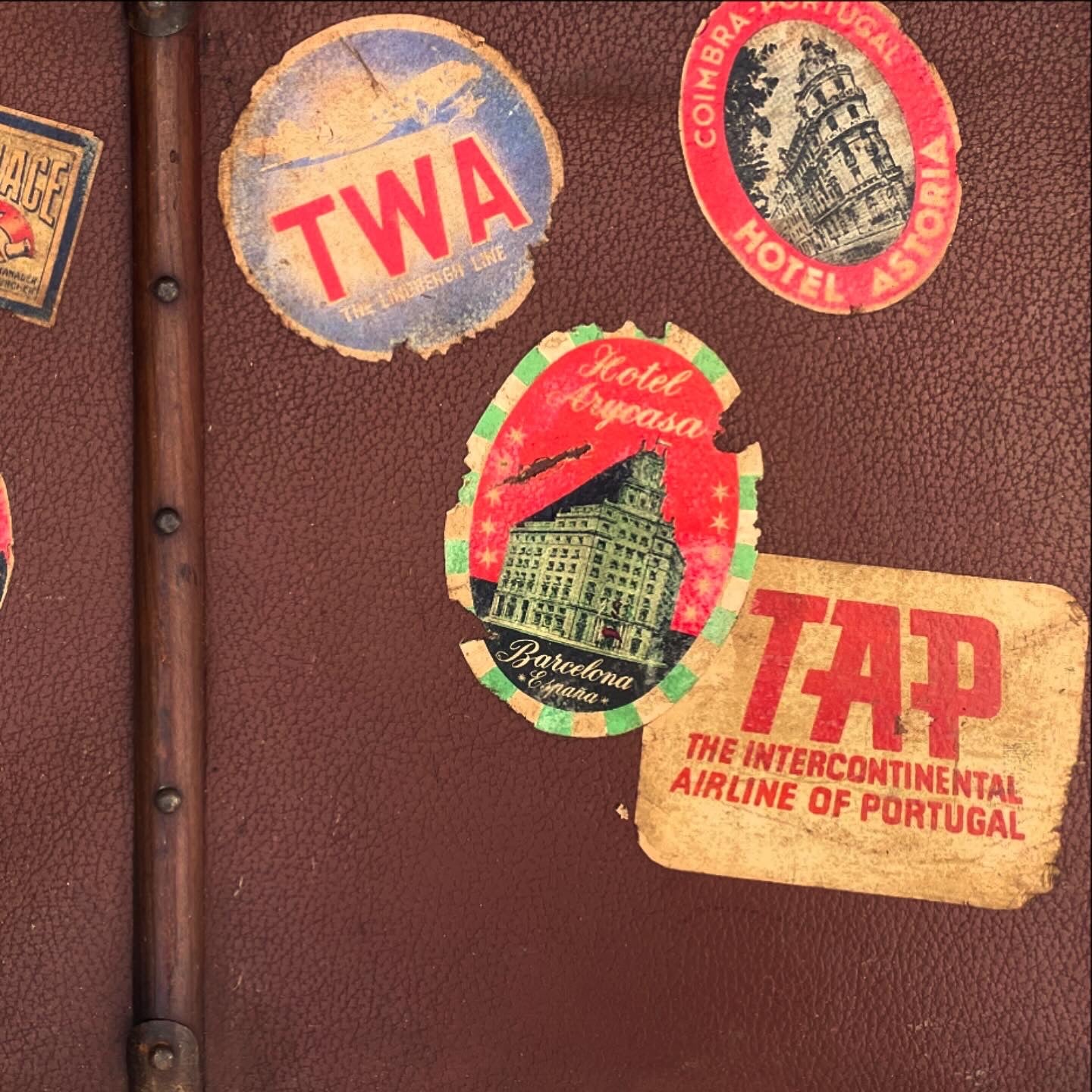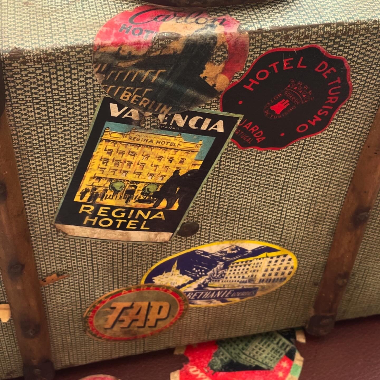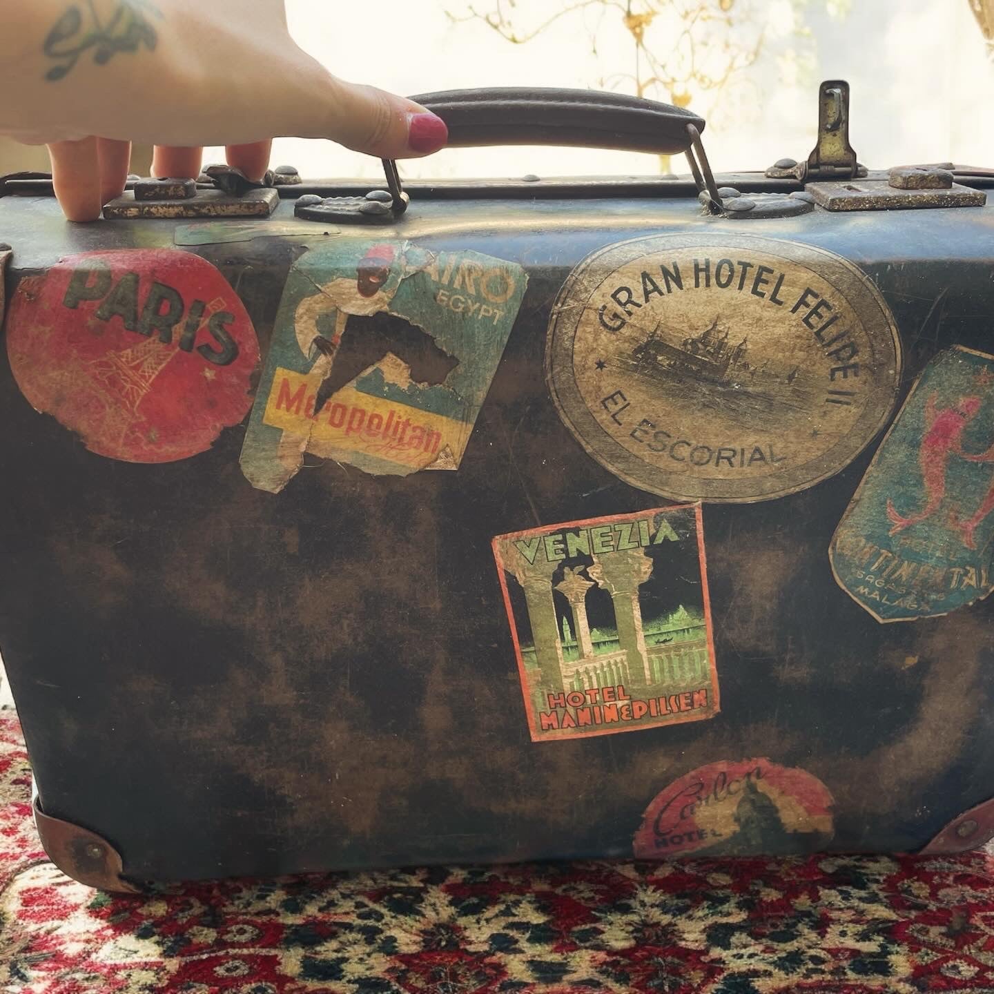 Wonderful trio of antique suitcases, much sought after to create sets like the one you see in the photo, in the form of small tables on an antique precious carpet, perhaps with a leather sofa in the background. Sought after by collectors for vintage car and motorcycle setups. These three suitcases belonged to the same owner, a very wealthy person from the Spanish bourgeoisie, who lived at the beginning of the century. Each of them is different from the other and each is literally covered with the highly sought after stickers of the most exclusive hotels in all of Europe - and Italy - in the 20s and 30s. These are not reworked pieces but absolutely original; whoever takes them home will have furnished an unforgettable living room. The dimensions are as follows: