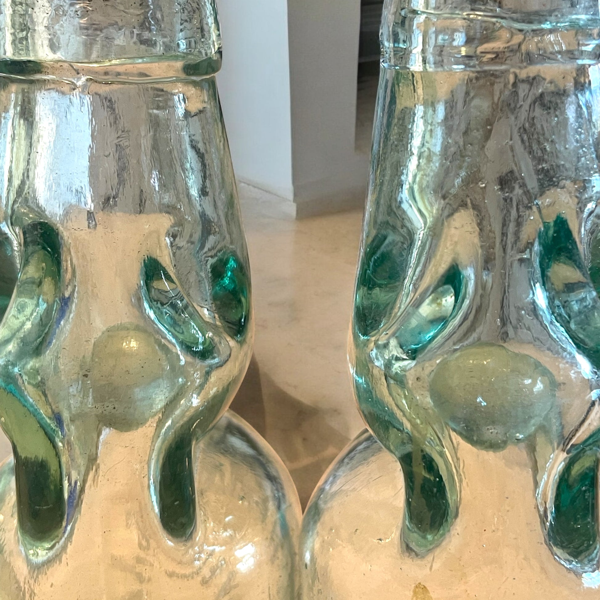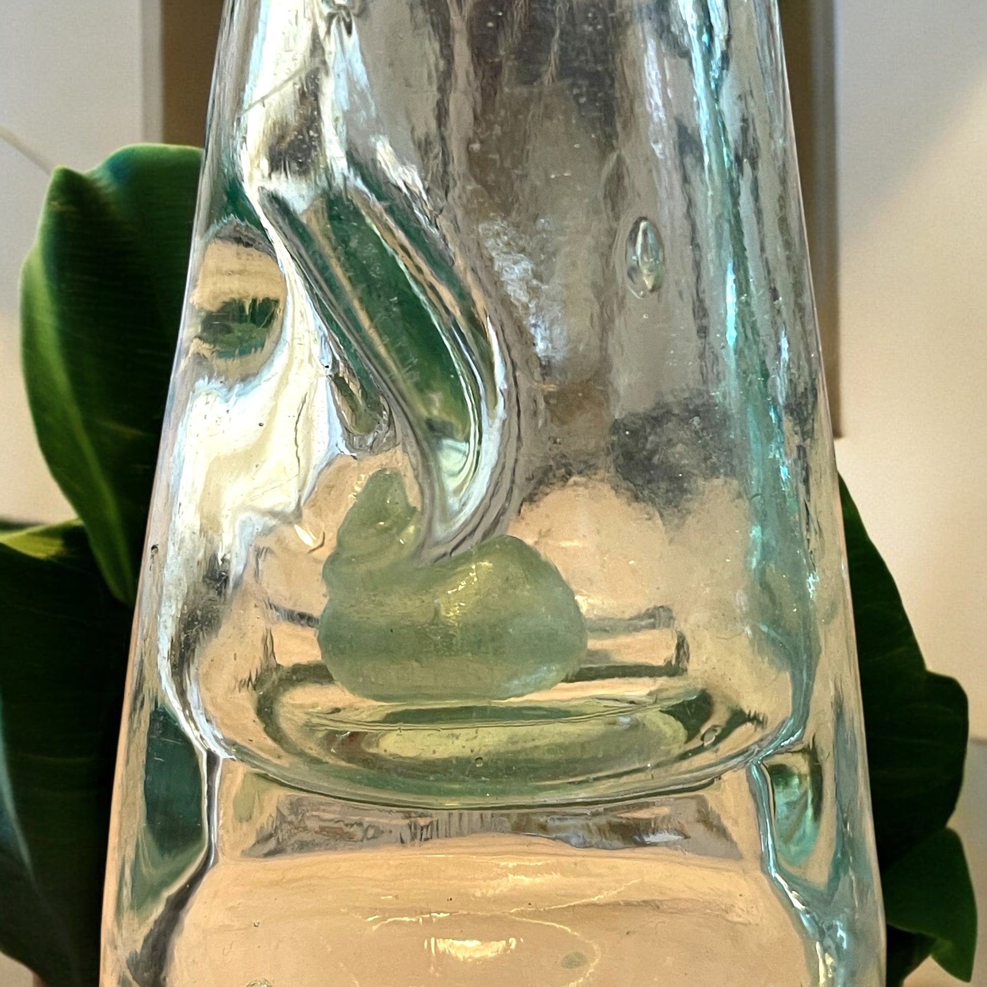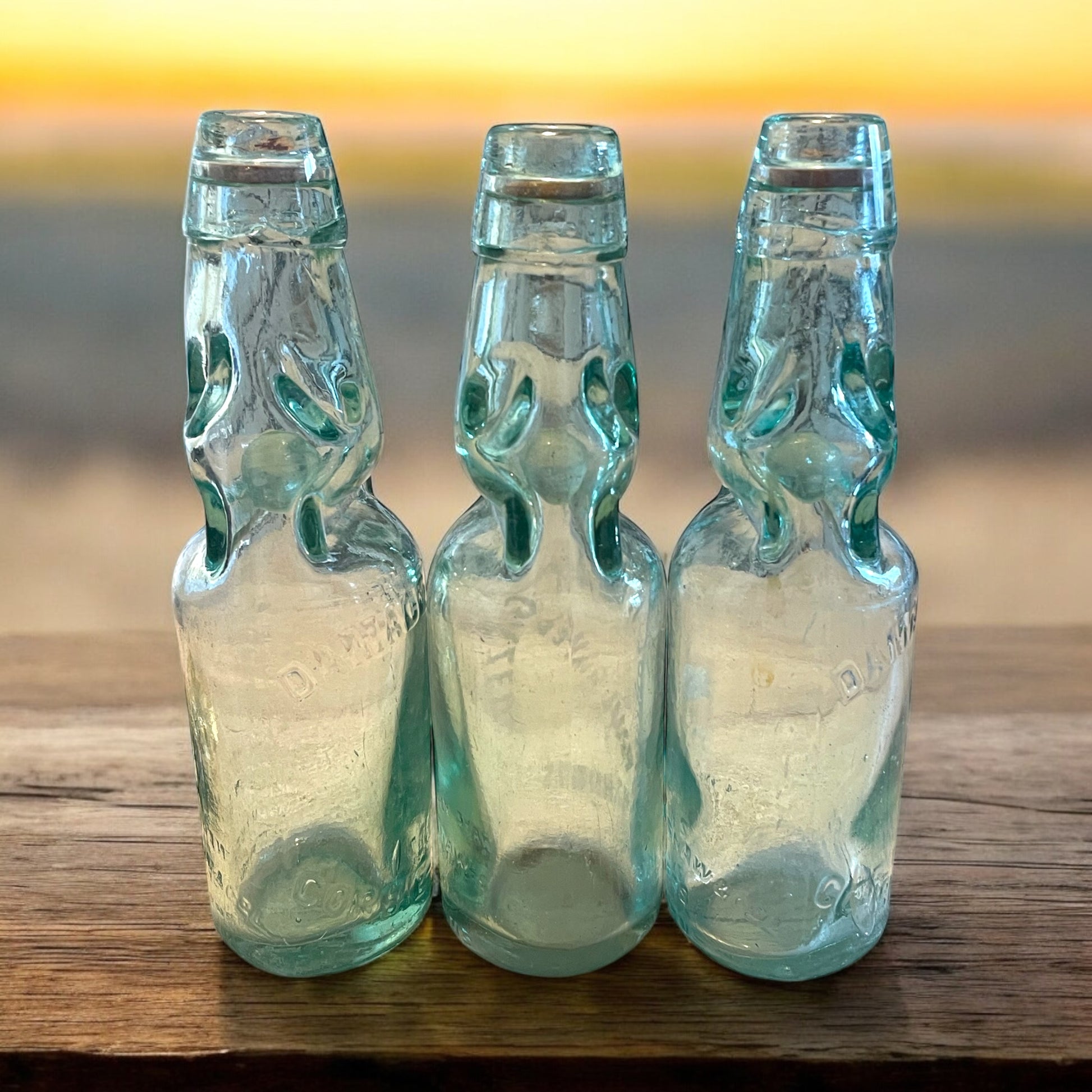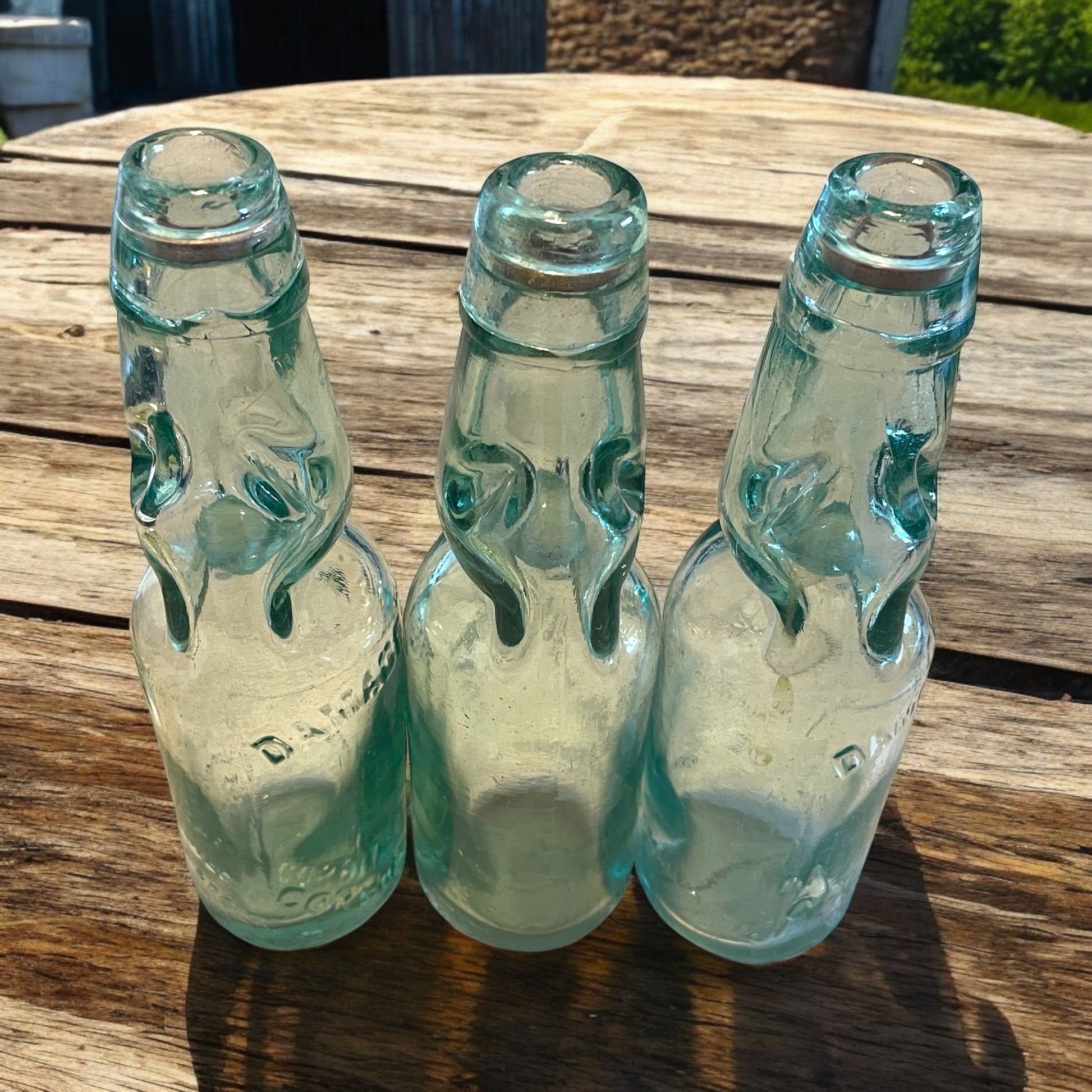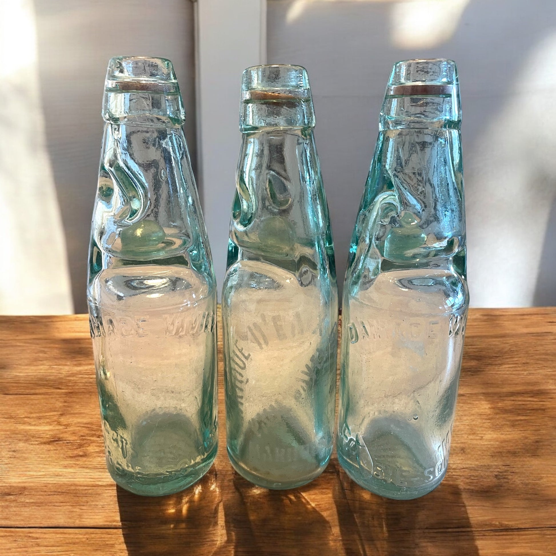 C’è un meccanismo magico che ha attraversato più di un secolo senza rompersi. Si chiama bottiglia Codd, e queste tre che vedi qui sono esemplari autentici di primo ‘900, prodotte in Inghilterra da Cannington, Shaw & Co. di St Helens e utilizzate poi in Francia da tre diversi imbottigliatori: Damade Vivier di Corbie (Somme) e Paul Gavel. Ogni bottiglia è un pezzo unico, soffiato a mano in vetro spesso dalle sfumature meravigliose, tra azzurro tenue e verde acquamarina, con la presenza di bolle d’aria irregolari che raccontano la lavorazione artigianale dell’epoca. Ma ciò che le rende davvero straordinarie è la presenza intatta della biglia interna, ancora perfettamente trasparente e lucente, accompagnata dalla guarnizione originale in ferro o piombo che serviva a sigillare la pressione. Un sistema semplice e geniale: era proprio la pressione della bevanda a far salire la biglia contro il collo, chiudendolo ermeticamente. Tutte e tre sono integre, senza sbeccature, pronte a essere ammirate, fotografate o collezionate. Oggetti ricchi di storia, di tecnica, di luce. Tre voci di vetro che non si sono mai spezzate. Tre respiri di un mondo frizzante e intelligente, che oggi puoi portare con te.