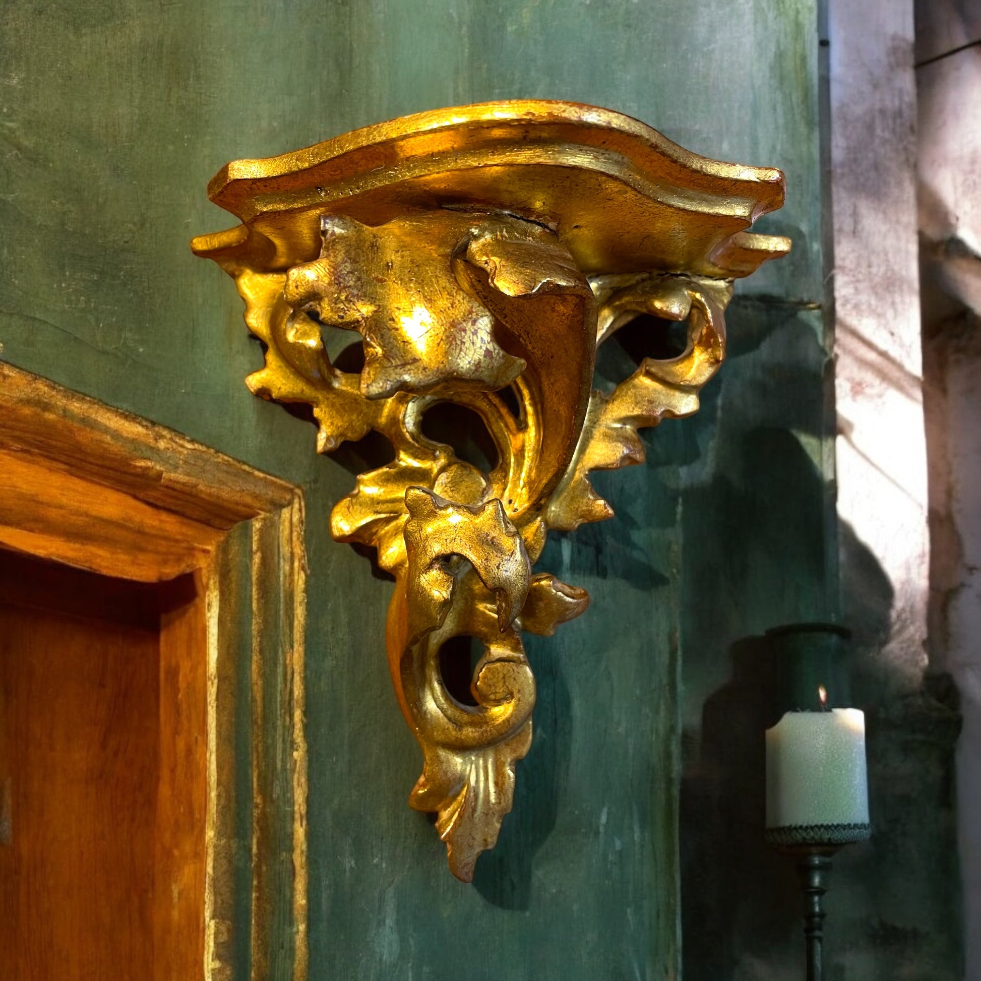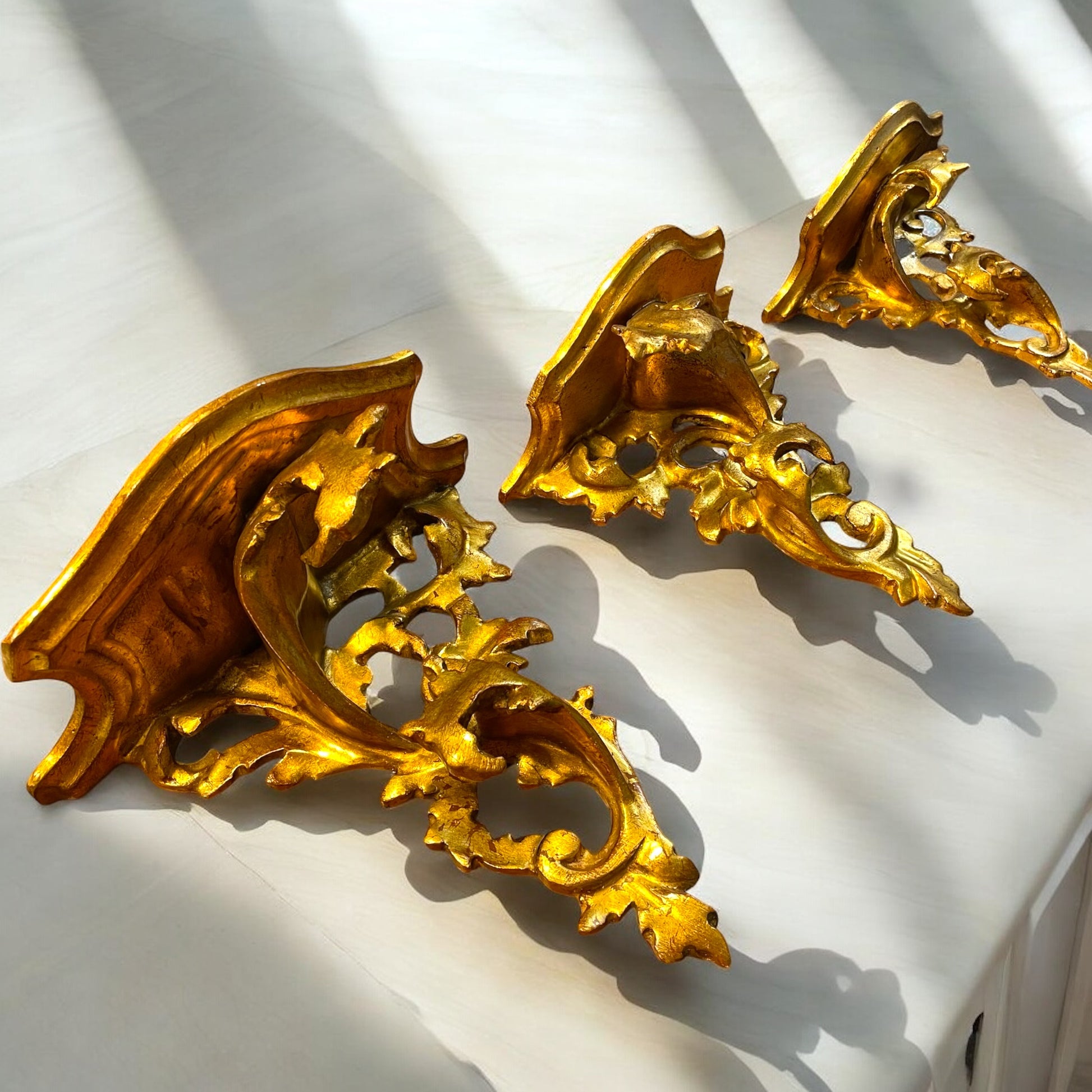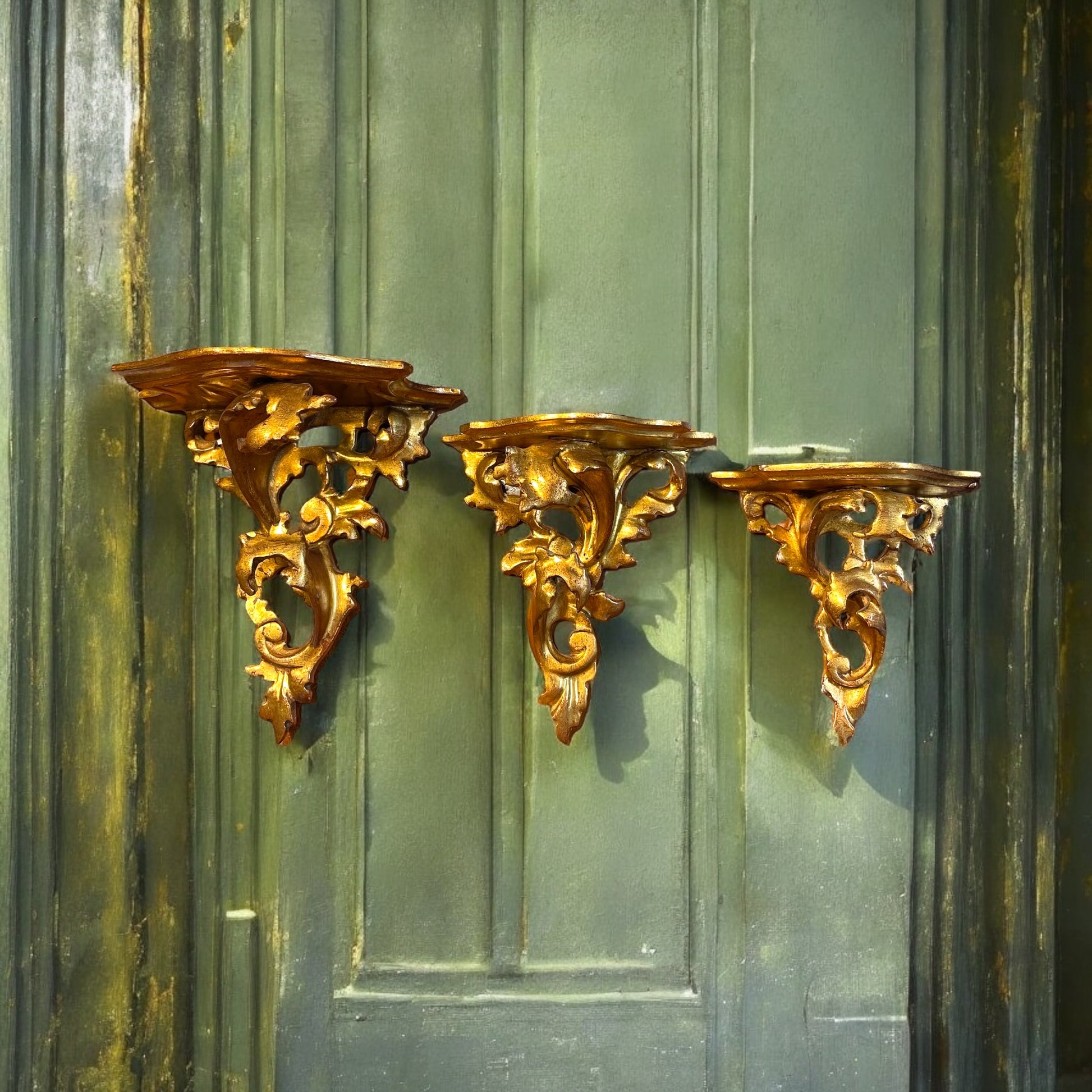 Un affascinante tris di mensoline dorate, risalenti alla prima metà del Novecento, pronte ad aggiungere un tocco di raffinatezza a qualsiasi parete. Riccamente intagliate - diverse le une tra le altre, ma con continuità di stile - rievocano l’eleganza delle epoche passate, rendendole ideali per valorizzare piccoli tesori, come statuette, vasi, o ricordi preziosi. Le dimensioni contenute e la varietà delle forme rendono queste mensole perfette per creare composizioni personalizzate, capaci di trasformare anche un angolo anonimo in un punto focale di grande impatto. Perfette per chi ama circondarsi di dettagli unici e senza tempo, queste mensoline sapranno dialogare armoniosamente con arredi classici o creare interessanti contrasti in ambienti moderni. La più grande: 21.4 x 20.5 cm - la media: 19.5 x 17.4 cm - la piccina: 16.5 x 16 cm. Ottima la conservazione.