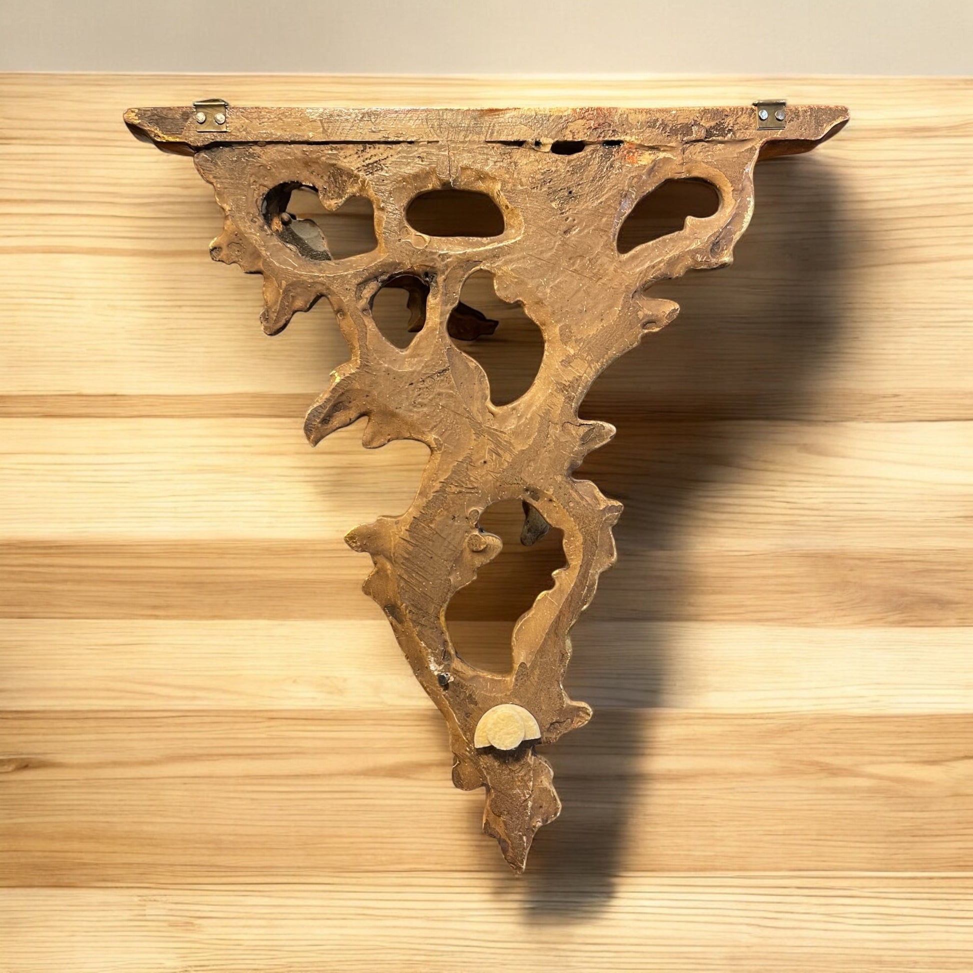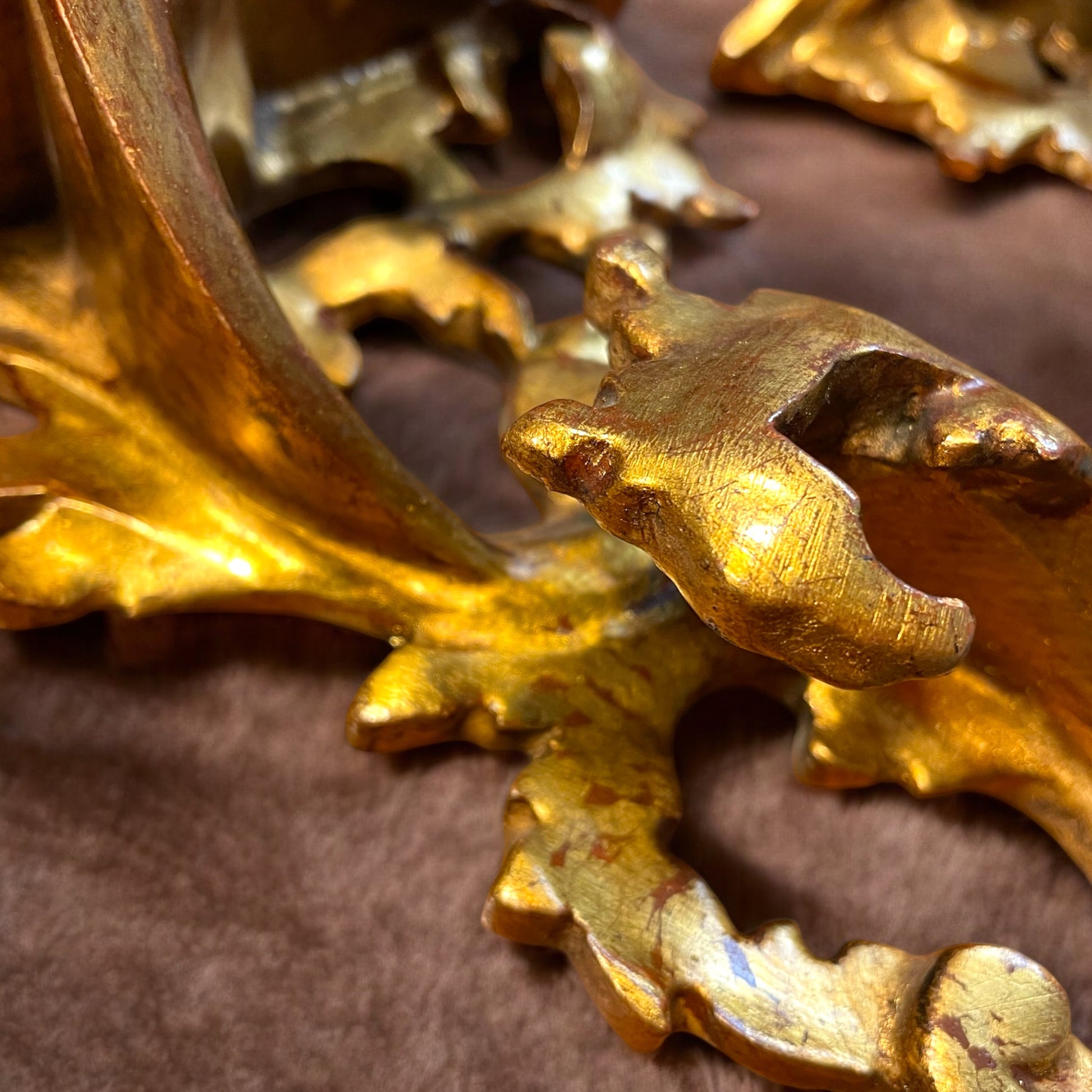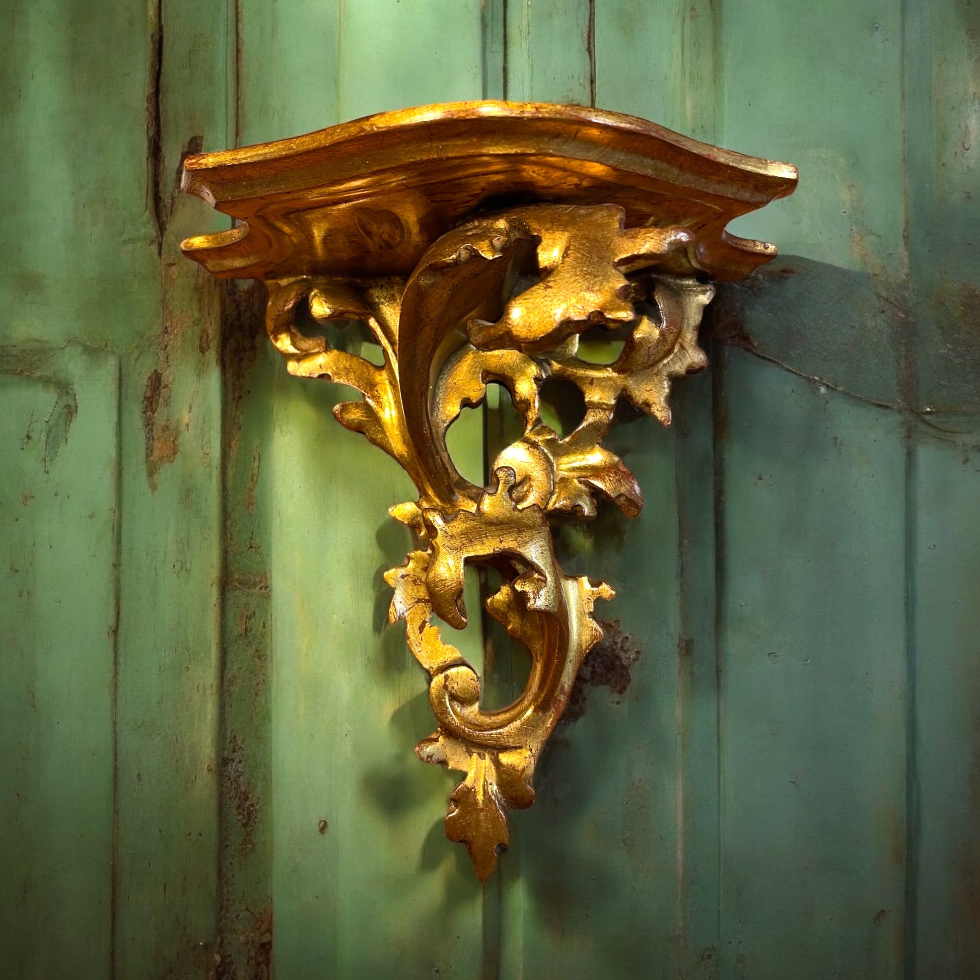 Un affascinante tris di mensoline dorate, risalenti alla prima metà del Novecento, pronte ad aggiungere un tocco di raffinatezza a qualsiasi parete. Riccamente intagliate - diverse le une tra le altre, ma con continuità di stile - rievocano l’eleganza delle epoche passate, rendendole ideali per valorizzare piccoli tesori, come statuette, vasi, o ricordi preziosi. Le dimensioni contenute e la varietà delle forme rendono queste mensole perfette per creare composizioni personalizzate, capaci di trasformare anche un angolo anonimo in un punto focale di grande impatto. Perfette per chi ama circondarsi di dettagli unici e senza tempo, queste mensoline sapranno dialogare armoniosamente con arredi classici o creare interessanti contrasti in ambienti moderni. La più grande: 21.4 x 20.5 cm - la media: 19.5 x 17.4 cm - la piccina: 16.5 x 16 cm. Ottima la conservazione.