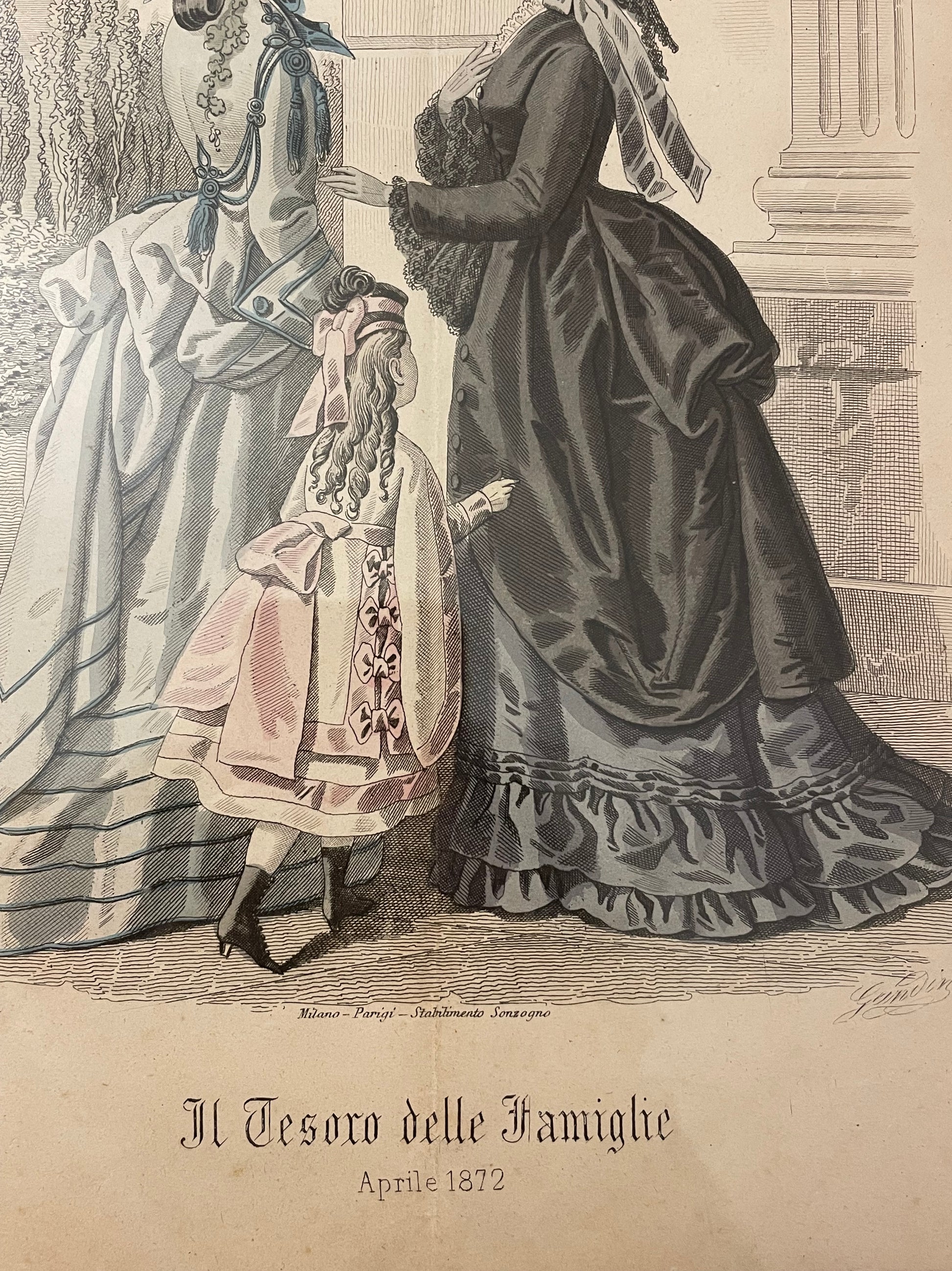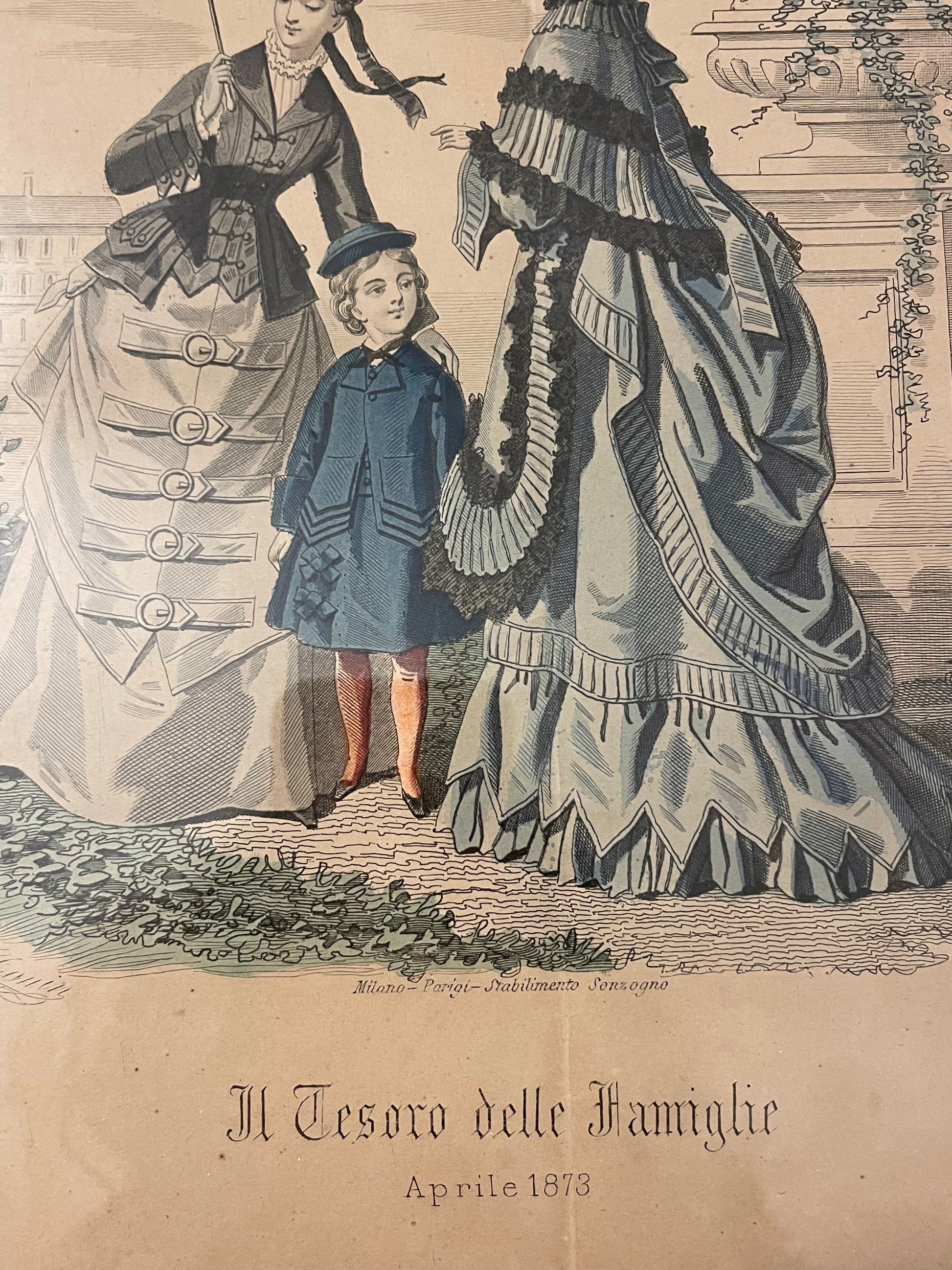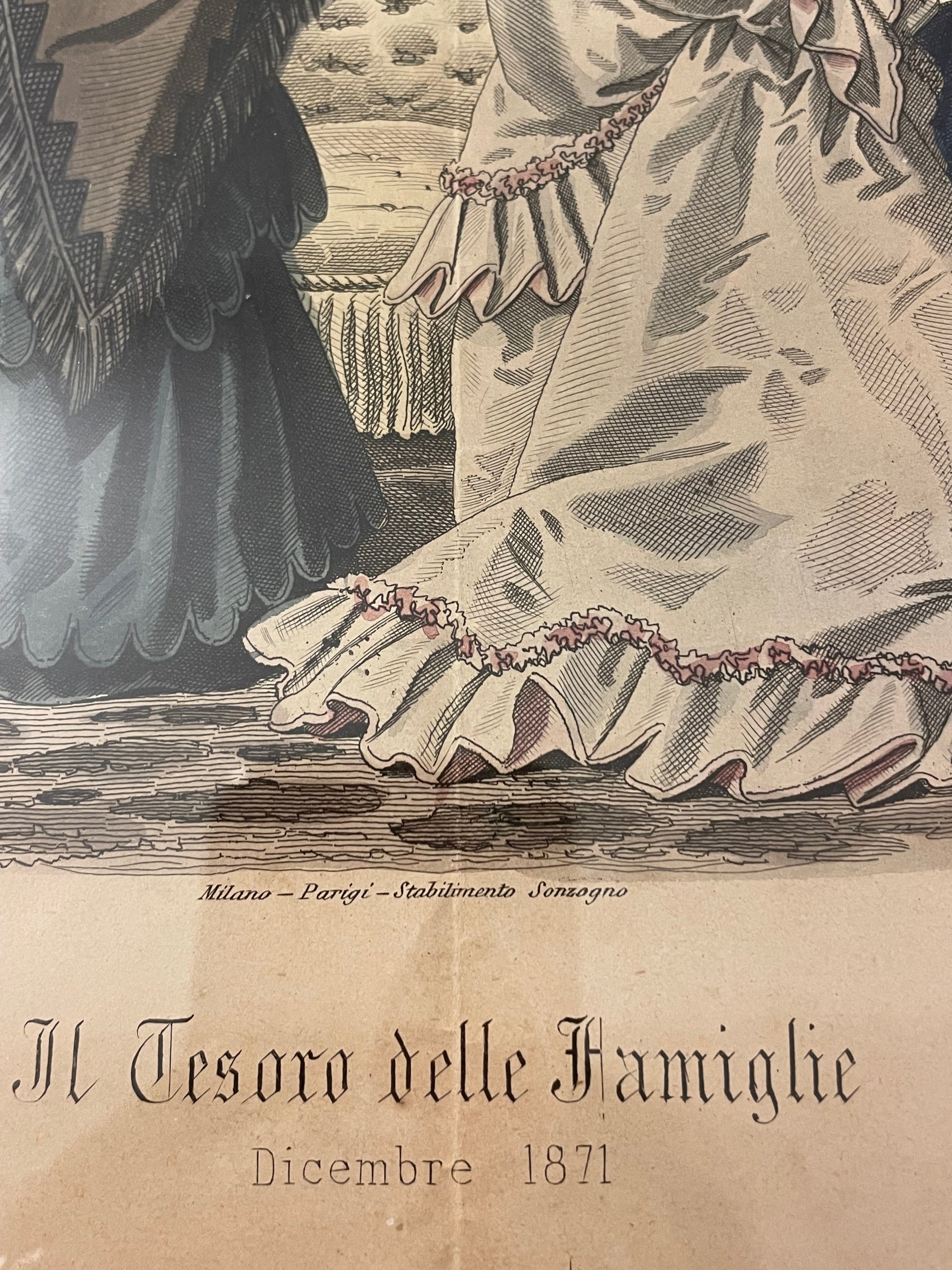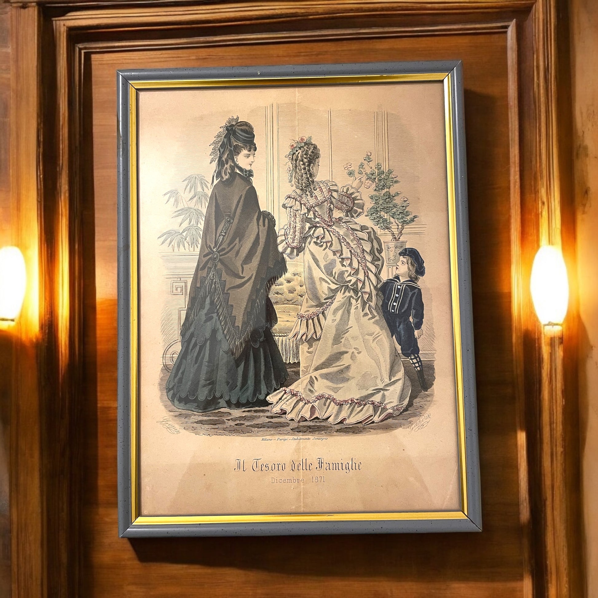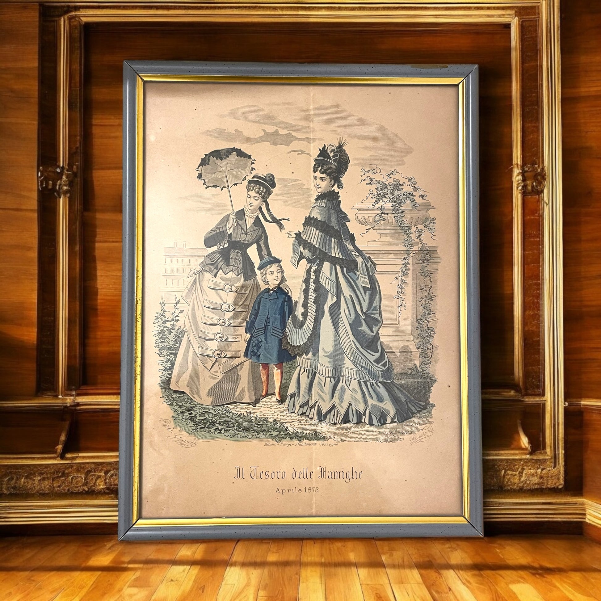 Immaginate un salotto ottocentesco, con il profumo del tè che si mescola all’aroma delle candele accese, mentre una dama in crinolina sfoglia delicatamente le pagine illustrate di una rivista. Ecco che prendono vita queste tre magnifiche stampe: autentiche testimonianze di un tempo in cui moda e raffinatezza erano specchi dell’anima. Questi tre quadri, elegantemente incorniciati poi negli anni ’70 con una finitura color carta da zucchero ed oro che ne esalta la delicatezza, racchiudono illustrazioni originali tratte da “Il Tesoro delle Famiglie” - celebre rivista ottocentesca edita dal prestigioso Stabilimento Sonzogno. Questo periodico, pubblicato a partire dal 1869, era una finestra aperta su un mondo di eleganza e istruzione, un punto di riferimento per le signore che desideravano ispirarsi alle ultime mode e alle arti domestiche. Ogni stampa racconta una storia e riporta l’anno in cui fu pubblicata: 1871, 1872, 1873 Le preziose illustrazioni, ricche di dettagli e sfumature, sono una celebrazione dell’arte del disegno e della stampa. Ogni tratto racconta di un mondo lontano, dove la moda era un linguaggio e il buon gusto una virtù. Prezzo per il tris, dimensioni: cm 30 x 23.