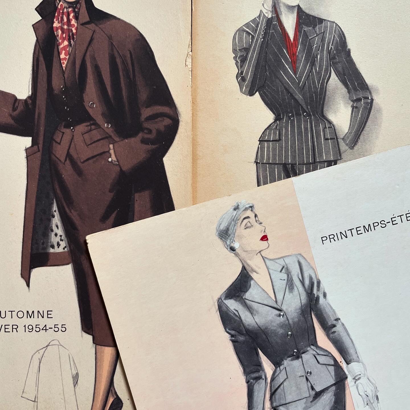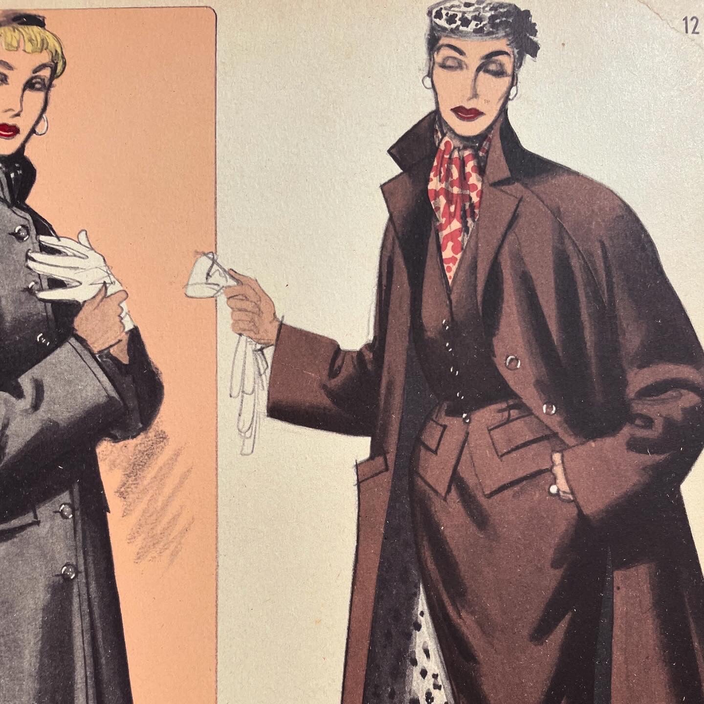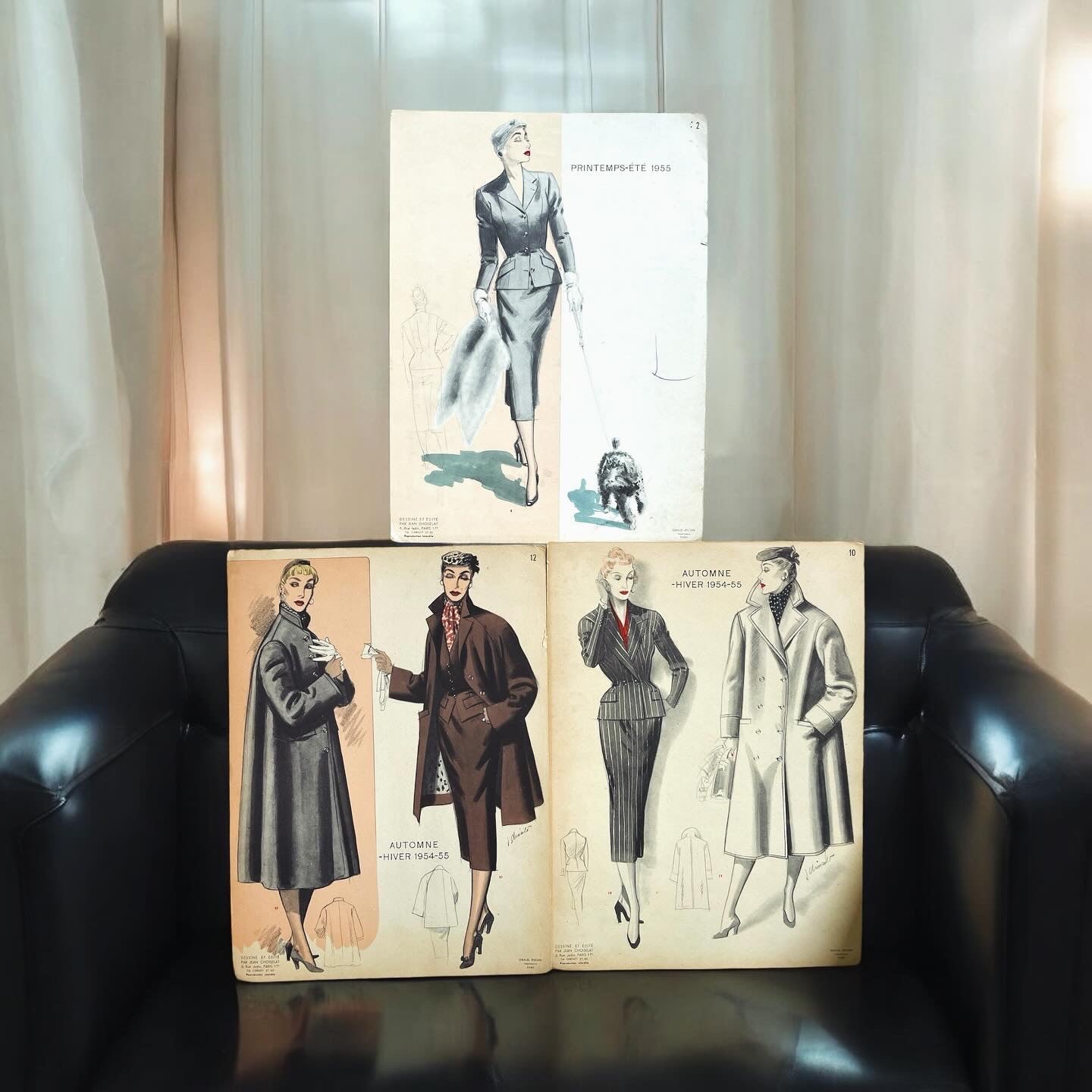 fantastic trio of fashion sketches, these are three large millinery prints made by the inimitable Jean Choiselat - these are prints that cannot be reproduced, so there are only a few copies, all numbered. They illustrate the fashion of spring summer 1955 and the autumn winter 1954-1955 season. It is useless to describe the elegance of these women because the images speak for themselves: perfect for framing, for displaying in an atelier or in any environment that wants to boast an exclusive piece of fashion history, coming directly from Paris. Dimensions: 36 x 26 cm each. On number two there is a pen stroke.