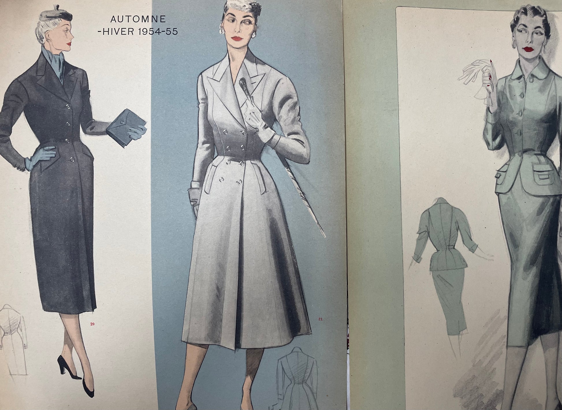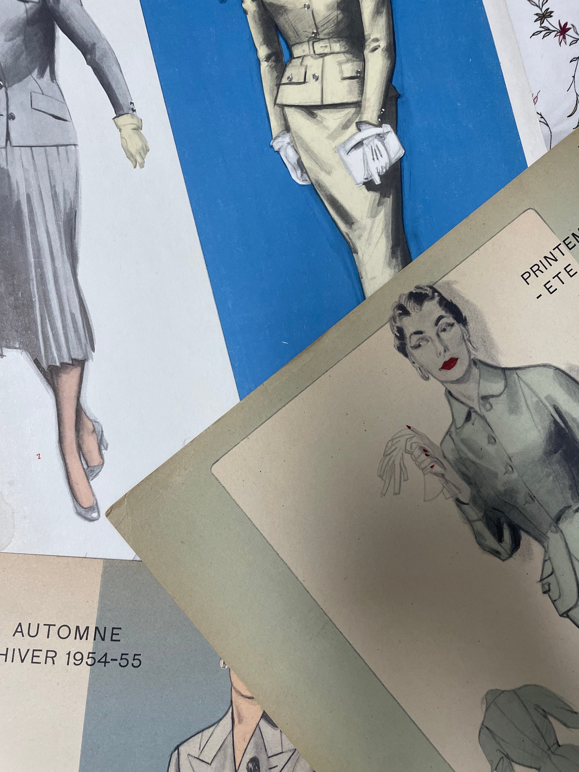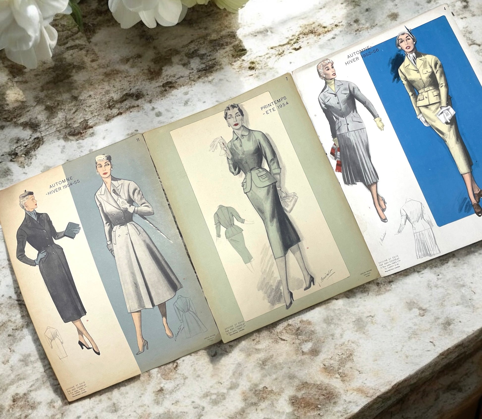 fantastico tris di bozzetti moda, si tratta di tre grandi stampe di modisteria realizzate dall’inimitabile Jean Choiselat - sono stampe di cui è vietata la riproduzione, ne esistono quindi pochi esemplari, tutti numerati. ci illustrano la moda della primavera estate del 1955 e della stagione autunno inverno 1954-1955. Inutile descrivere l’eleganza di queste donne perché le immagini parlano da sé: perfette da incorniciare, da esporre in un atelier o in un qualsiasi ambiente voglia vantare un pezzo esclusivo della storia della moda, proveniente direttamente da Parigi. Le dimensioni: 36 x 26 cm ciascuna. Sulla numero due presente un tratto di penna.
