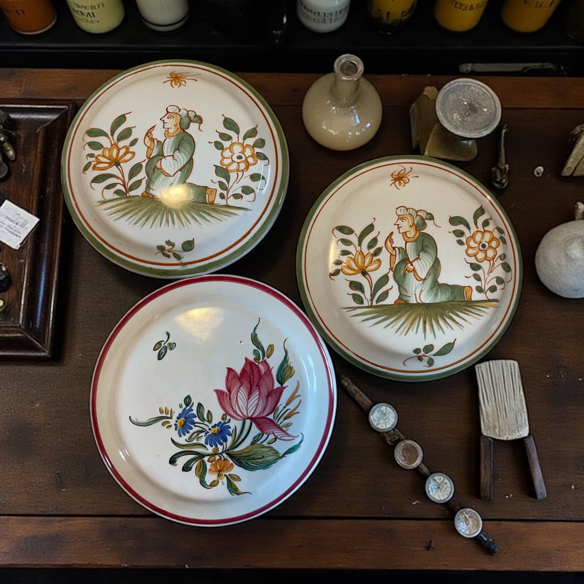 Set di 3 vasi da farmacia in ceramica vintage italiana. Decorazioni dipinte a mano, con motivi floreali e figure. Coperchi a battuta. Ottime condizioni complessive.