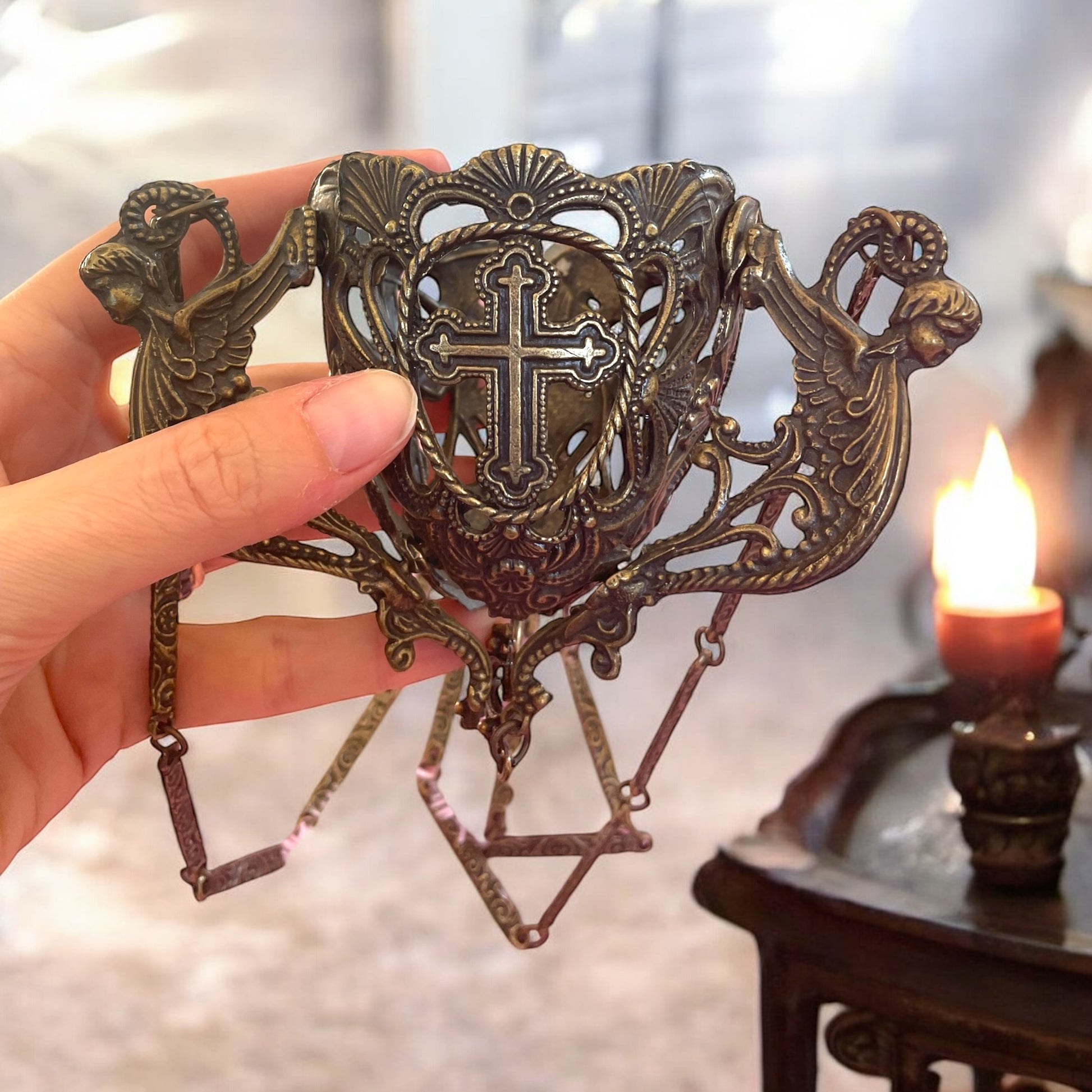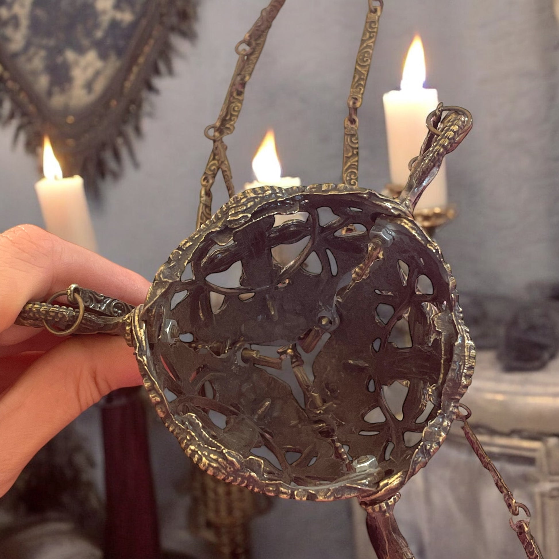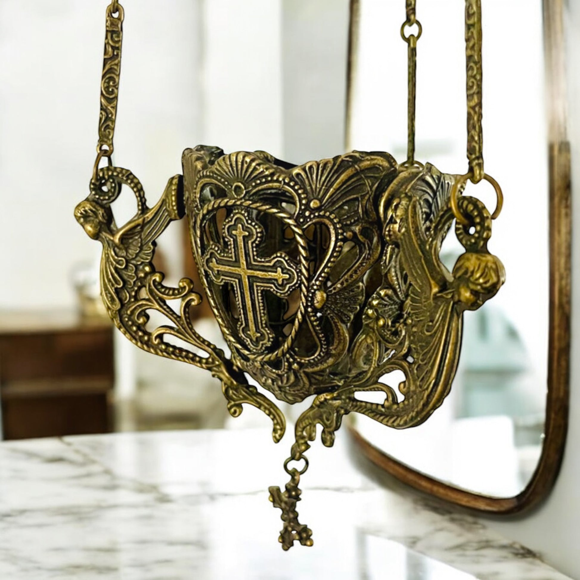 Le croci traforate e le catene lavorate lo rendono un oggetto scenografico, perfetto per impreziosire un ambiente domestico o per chi cerca un elemento unico dal fascino spirituale e decorativo. Ideale come pezzo decorativo in salotti raffinati, studi o altari personali, questo turibolo può essere utilizzato anche come lampada votiva. Un oggetto versatile e suggestivo, capace di creare un’atmosfera di raccoglimento e bellezza. Appeso è lungo circa cm 60.