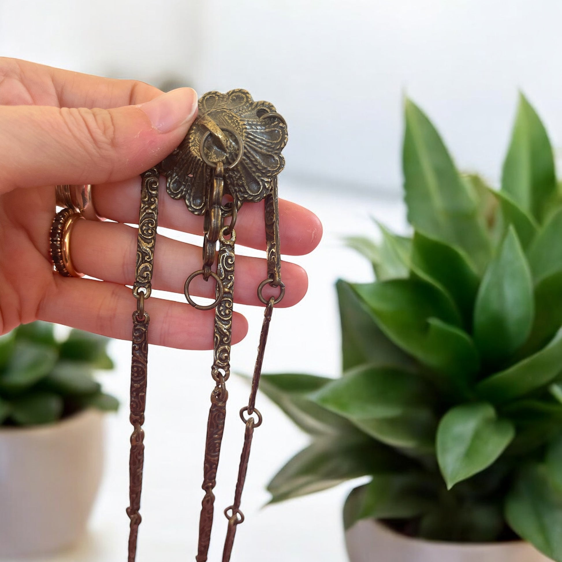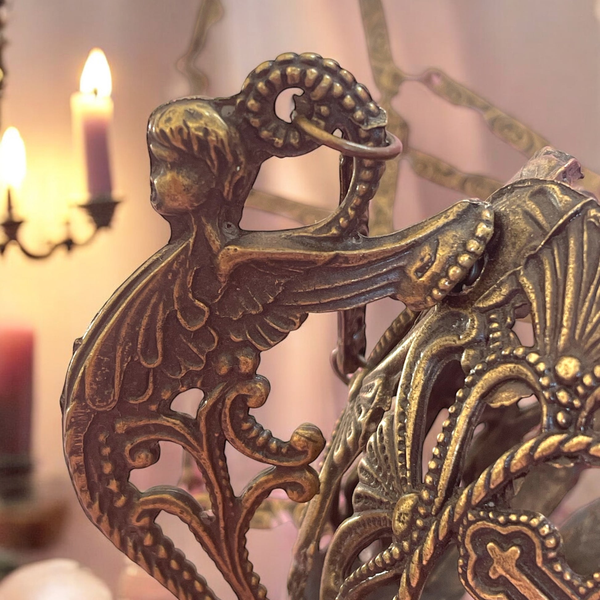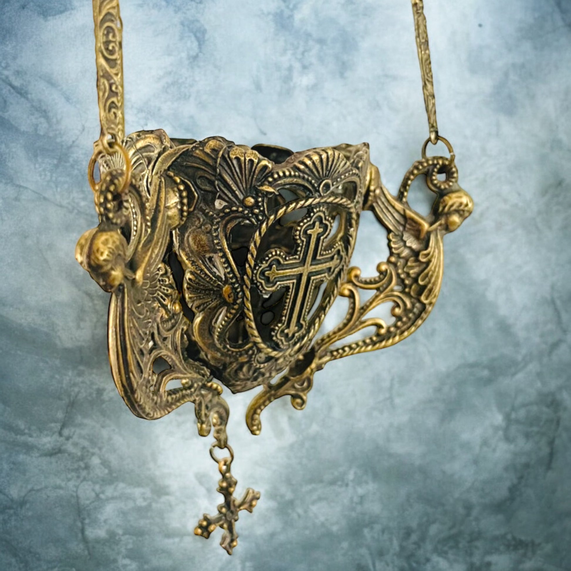 Le croci traforate e le catene lavorate lo rendono un oggetto scenografico, perfetto per impreziosire un ambiente domestico o per chi cerca un elemento unico dal fascino spirituale e decorativo. Ideale come pezzo decorativo in salotti raffinati, studi o altari personali, questo turibolo può essere utilizzato anche come lampada votiva. Un oggetto versatile e suggestivo, capace di creare un’atmosfera di raccoglimento e bellezza. Appeso è lungo circa cm 60.