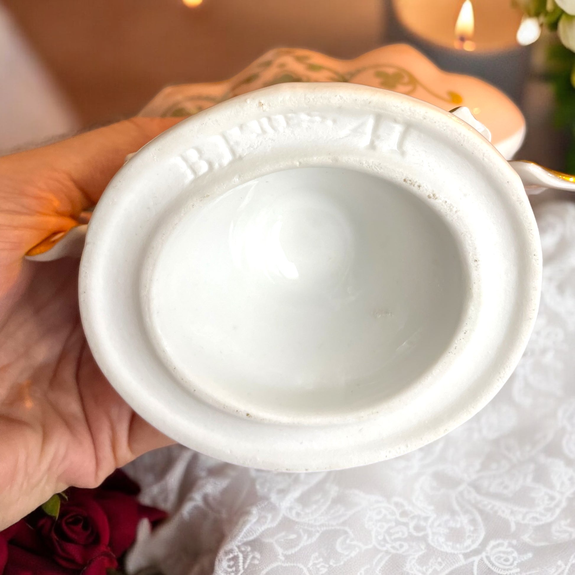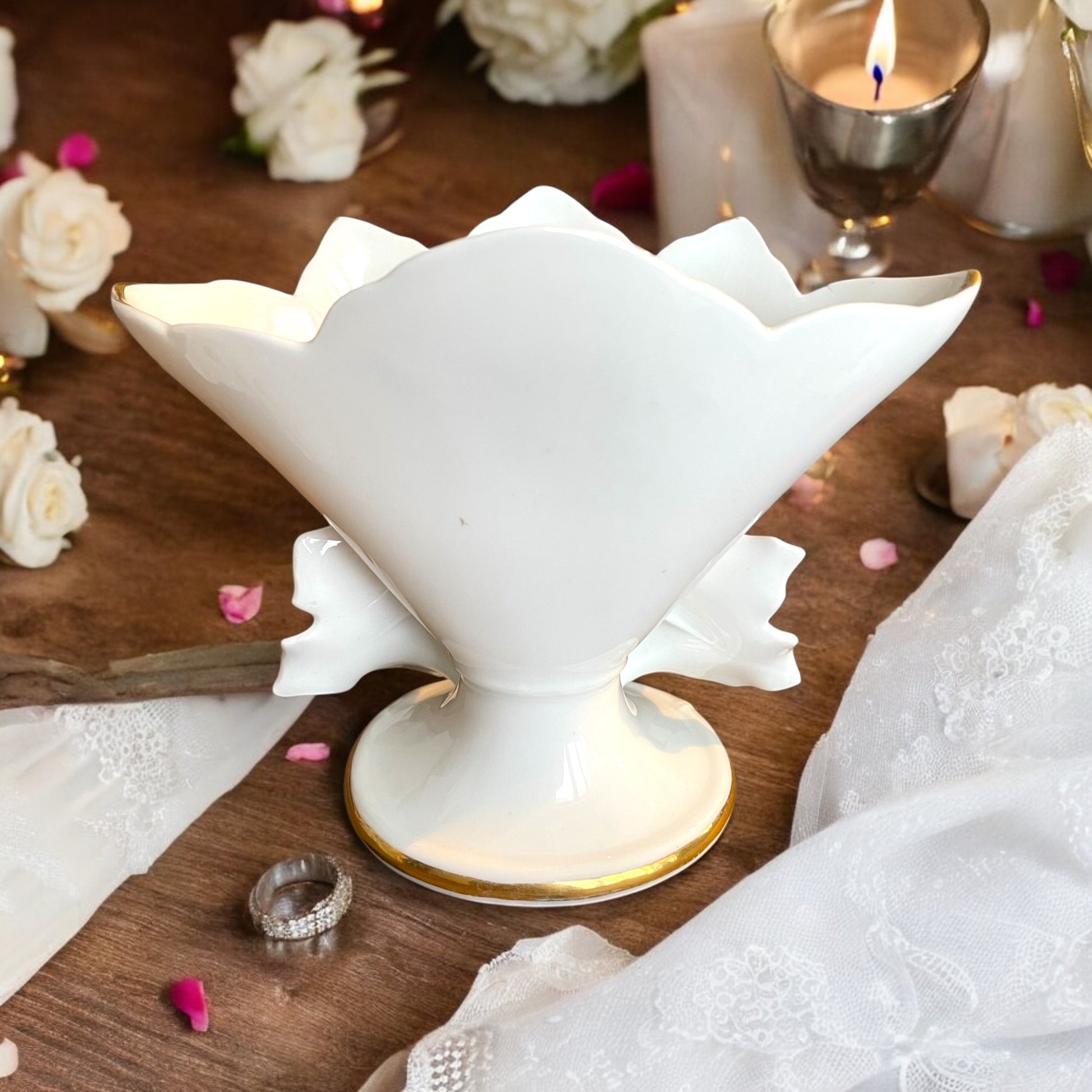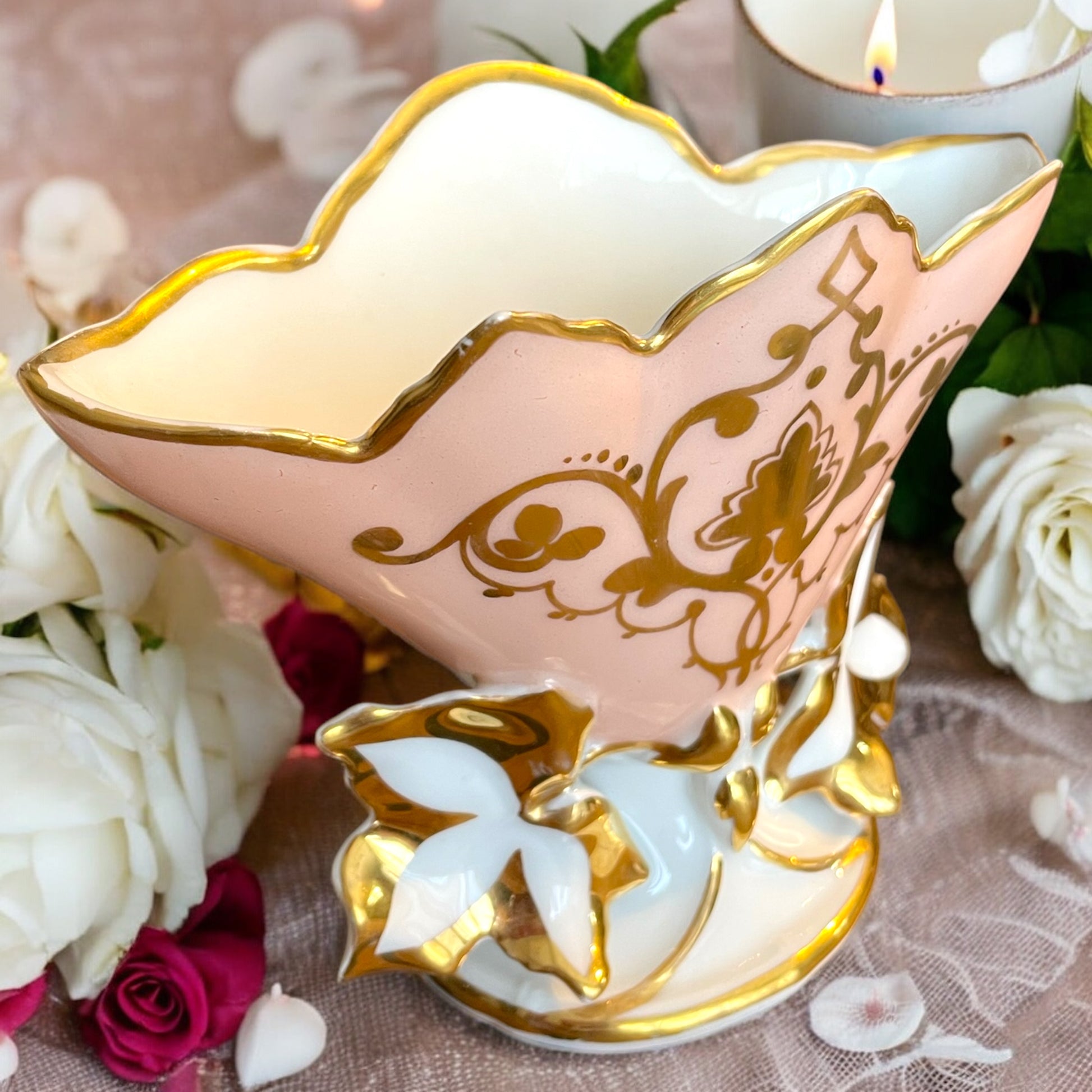Realizzato dalla manifattura Bourgoin Frères, attiva in Francia tra la fine dell’Ottocento e i primi anni del Novecento, questo pezzo si distingue per il suo stile elegante e le finiture ricercate. Con la sua delicata tonalità rosa cipria, impreziosita da decorazioni in oro zecchino e raffinati motivi floreali in rilievo, il vaso fa parte della tradizione dei cosiddetti vase de mariée, un tempo donati come simbolo di prosperità e felicità coniugale. Questi vasi venivano spesso esposti nelle case borghesi come centrotavola ornamentali o come preziosi porta-gioielli e ricordi matrimoniali. La firma “B. Frères 41” impressa sul fondo conferma l’origine del pezzo, attribuendolo alla produzione della manifattura Bourgoin Frères, nota per le sue porcellane di alta qualità e le finiture eleganti tipiche dell’epoca Belle Époque. Lo stile decorativo, caratterizzato da linee sinuose e dorature raffinate, richiama fortemente l’influenza dell’Art Nouveau, con la sua predilezione per le forme morbide e i motivi floreali. Il vaso si presenta in ottime condizioni, privo di crepe, scheggiature o segni evidenti di usura, con le dorature ancora luminose e ben conservate. Immaginalo m posato su un’antica credenza in legno scuro, illuminato dalla luce soffusa di una candela: i riflessi dorati si accendono delicatamente sulle decorazioni floreali, evocando il fascino discreto delle case d’altri tempi, e celebrando continuamente il potere dell’amore. Dimensioni: 17.5 x 14 cm.