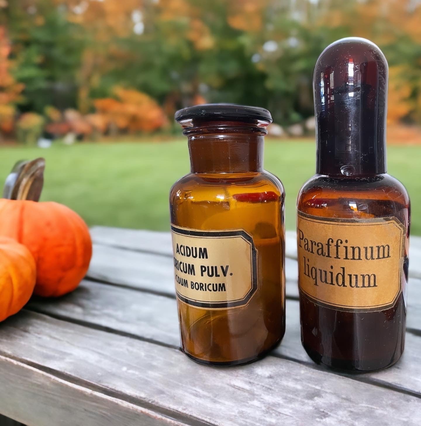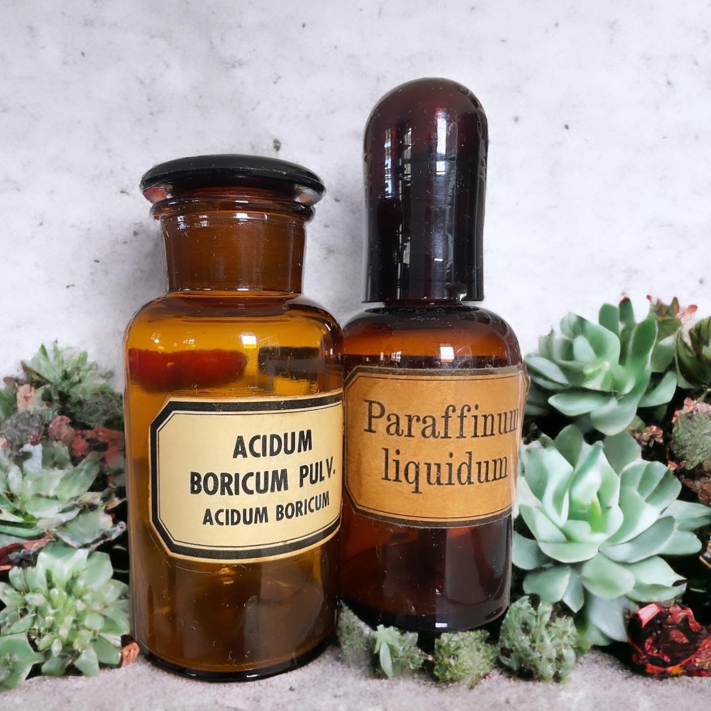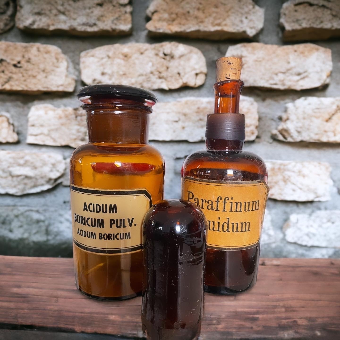 Pair of #antique #amberglass #pharmacy #jars #40s - #50s with labels - respectively #boric acid and #liquid paraffin; beautiful shapes and glass stoppers (one is double: glass stopper/measuring cup with minimal chipping + cork stopper. Heights: 24 and 20 cm. Thick glass, excellent presence, wonderful for display.