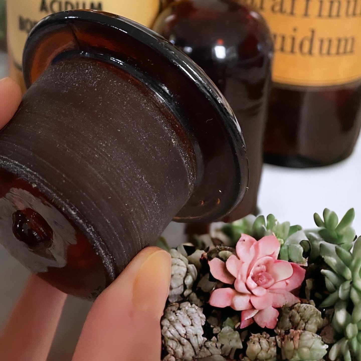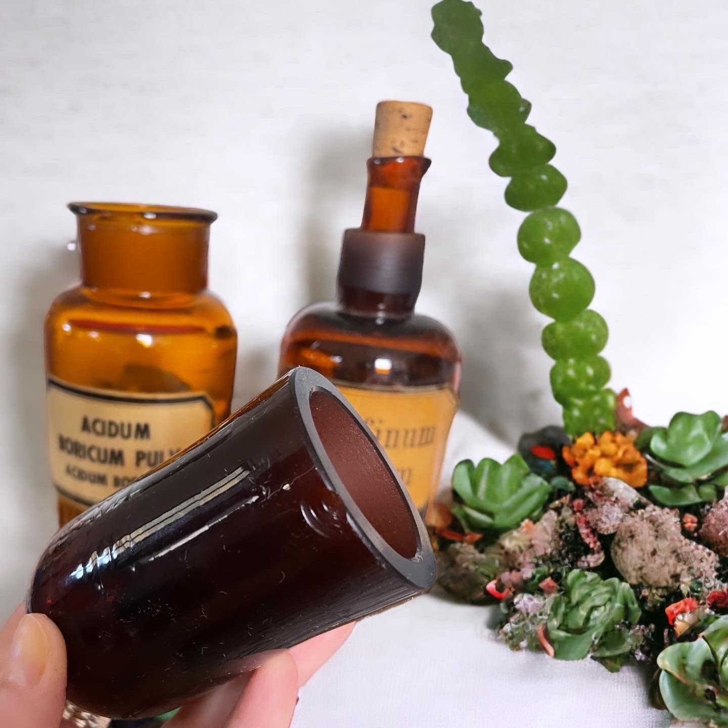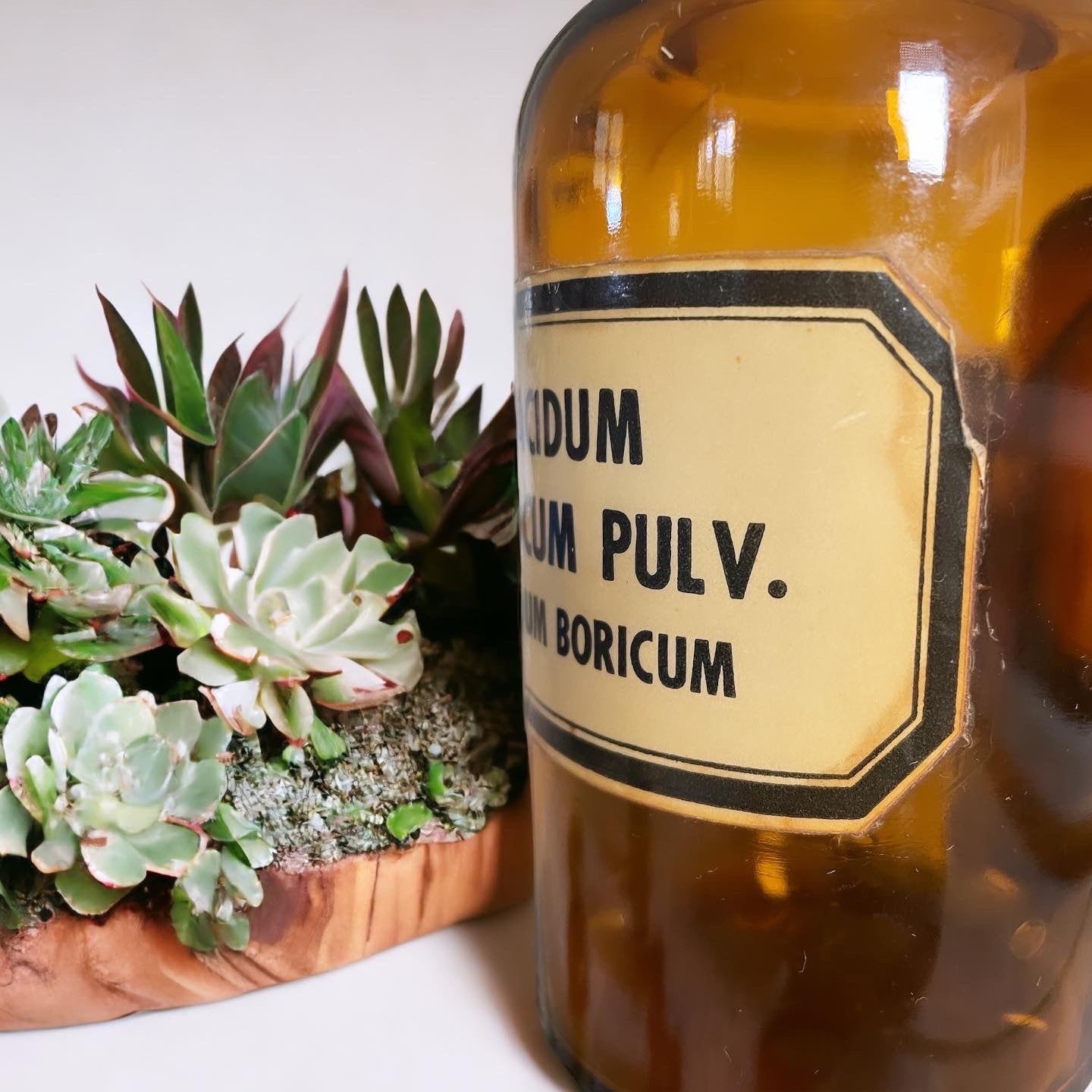 Pair of #antique #amberglass #pharmacy #jars #40s - #50s with labels - respectively #boric acid and #liquid paraffin; beautiful shapes and glass stoppers (one is double: glass stopper/measuring cup with minimal chipping + cork stopper. Heights: 24 and 20 cm. Thick glass, excellent presence, wonderful for display.