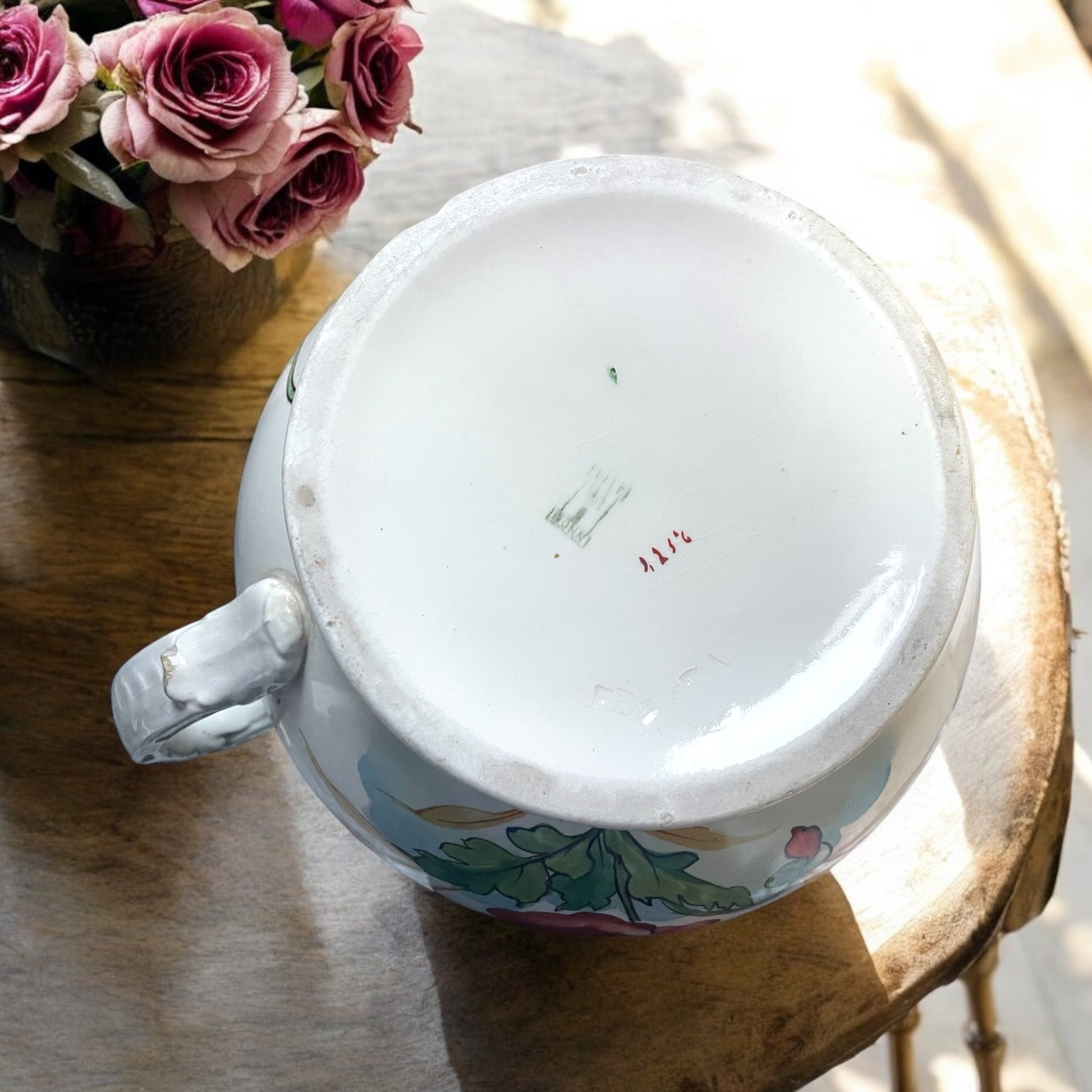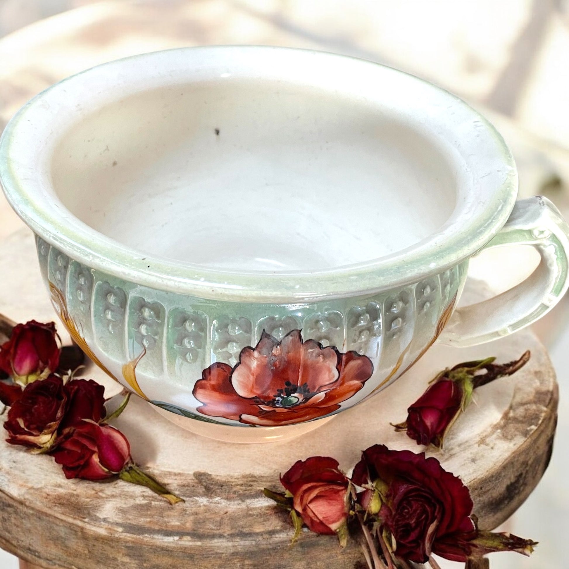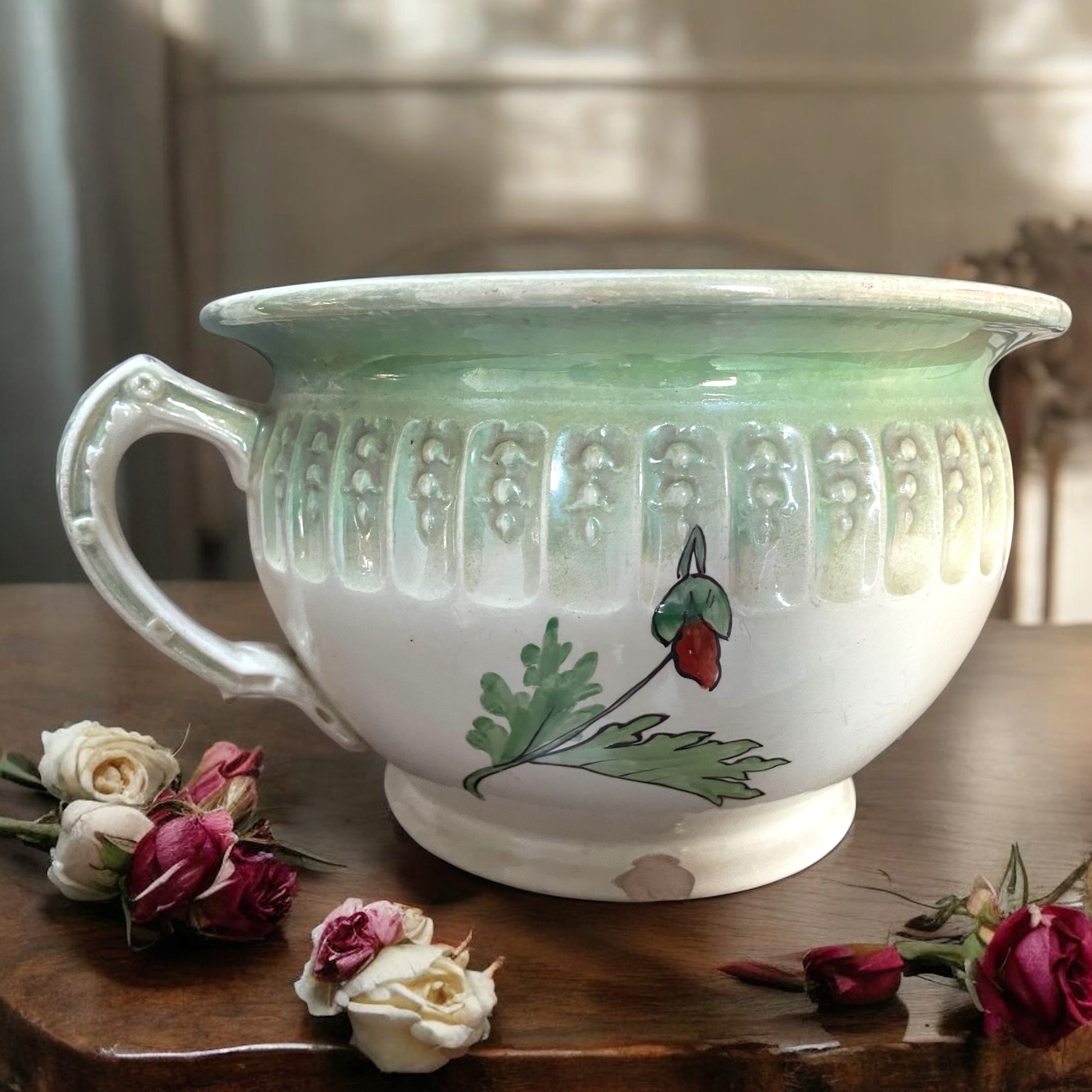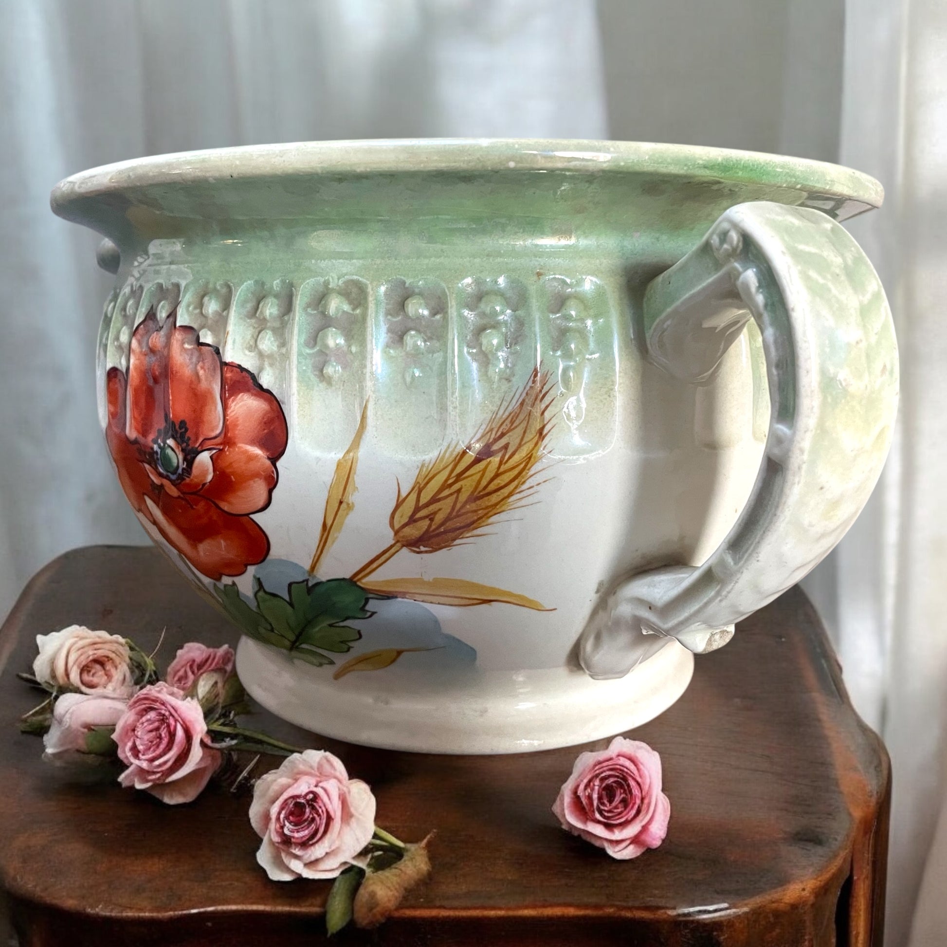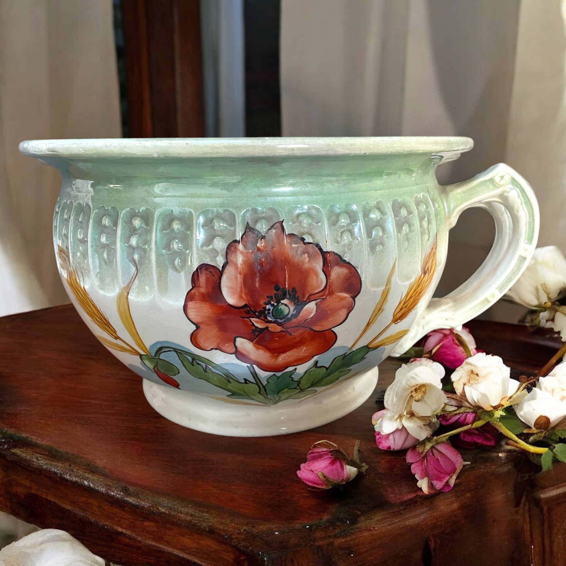 In un’epoca in cui ogni oggetto della vita quotidiana rifletteva il gusto e lo status del proprietario, questo vaso da notte realizzato dalla prestigiosa manifattura Royal Bonn rappresenta un esempio straordinario di arte funzionale. Firmato da Franz Mehlem e numerato, si distingue per la sua decorazione unica e raffinata: un papavero rosso brillante, simbolo di bellezza effimera, si unisce a dorate spighe di grano, evocando prosperità e abbondanza. Molto bella l’idea di richiamare nella decorazione posteriore il papavero ma in bocciolo, quasi a creare una narrazione temporale circolare del ciclo della vita. Fu pensato per una clientela esigente e raffinata dell’alta borghesia di fine Ottocento e inizio Novecento. Le sfumature verde pastello, tipiche dell’Art Nouveau, impreziosiscono il contesto visivo; creando un’armonia cromatica che cattura lo sguardo. Segnaliamo con trasparenza due piccole mancanze: una scheggiatura al bordo inferiore posteriore (vedere foto) e un’altra sotto il manico che rimane nascosta; entrambe non disturbano l’estetica. Le dimensioni: diametro 24.5 cm altezza 16 cm.