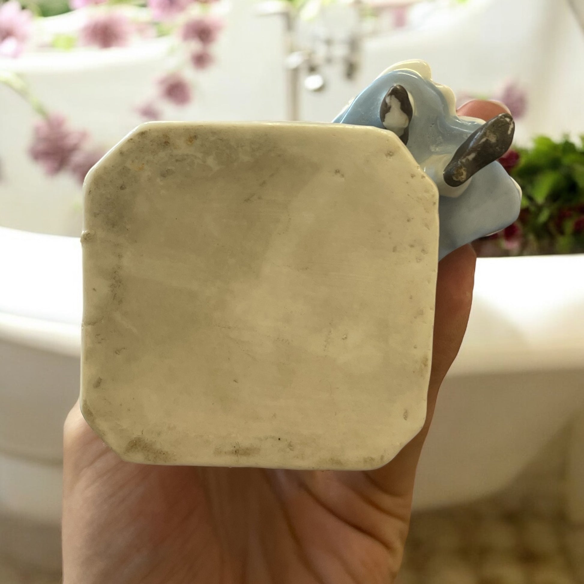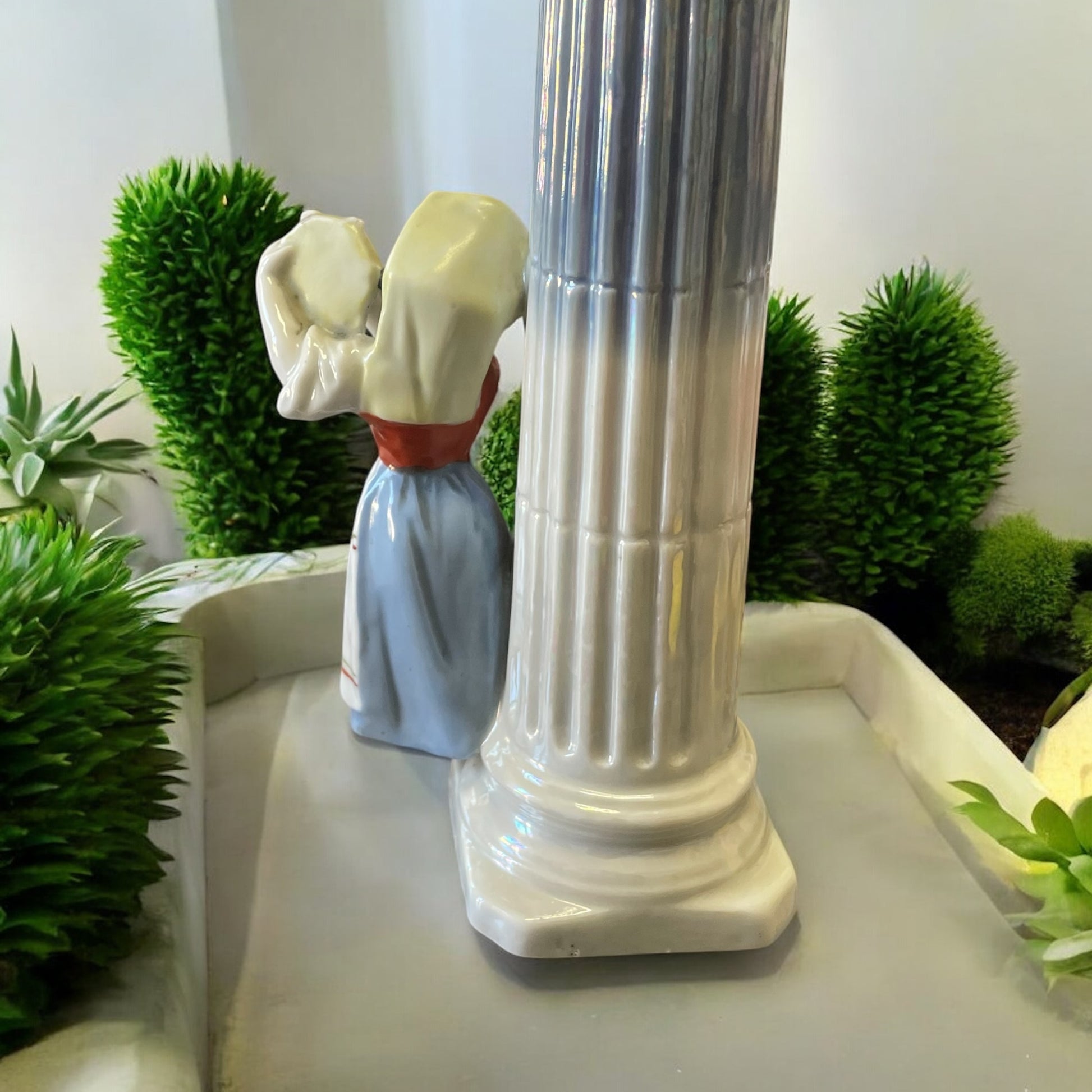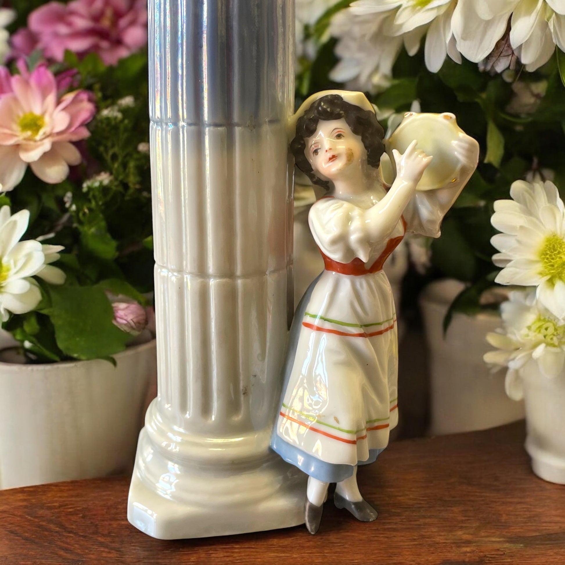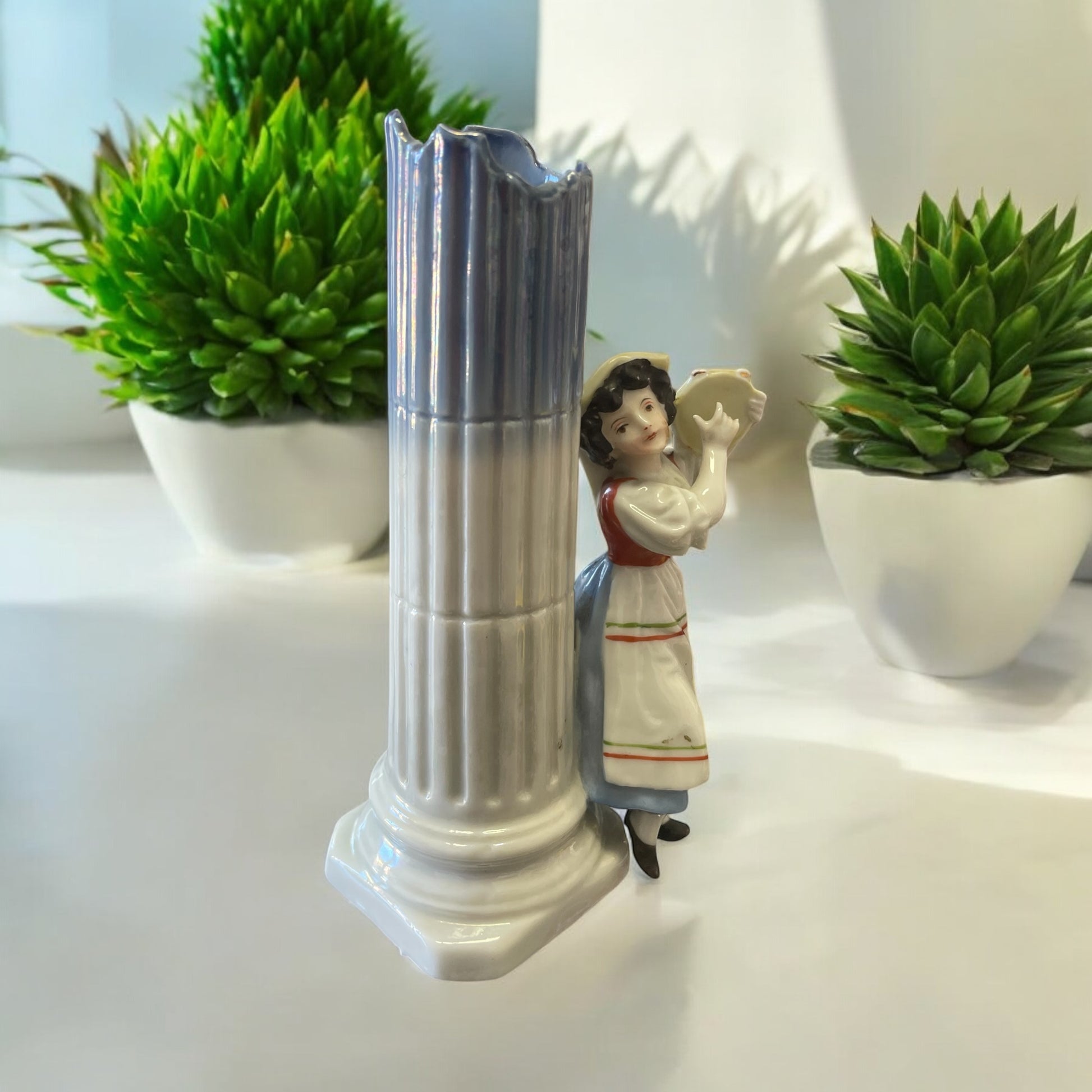 Una colonna, un tamburello, un sorriso: tre parole per questo vaso soliflore in porcellana. Sembra uscito da un sogno di metà Novecento, con la sua giovane danzatrice dai capelli neri che, con grazia leggera, si appoggia a una colonna antica quasi a cercarne sostegno tra un passo di danza e l’altro; mentre con le dita sottili tiene il tamburello. Il vestito, semplice ma curato, racconta una femminilità senza tempo: le fasce colorate sul grembiule richiamano le giornate di festa nei paesi di campagna dell’Europa Mediterranea, le domeniche d’estate con i fiori ai balconi e le finestre aperte sulle voci. Il copricapo giallo, inclinato con un tocco di civetteria, aggiunge una nota solare che bilancia l’eleganza quieta delle sue scarpe scure. Realizzata probabilmente in Germania, è uno di quegli oggetti che abitano i ricordi delle nonne, delle credenze di famiglia, dei salotti buoni dove “mi raccomando non toccare niente!”. Una piccola scena immobile che continua a danzare nel tempo. Altezza cm 15.