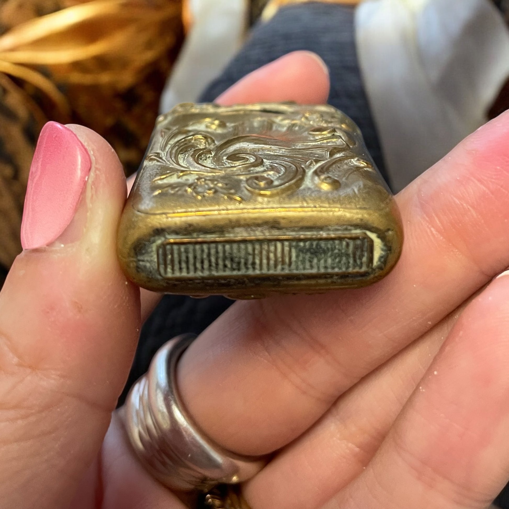 “Vesta case” in metallo con finitura ottonata, art Nouveau primissimo ‘900, dimensioni 50 x 32 mm, lievi tracce di ossidazione.
