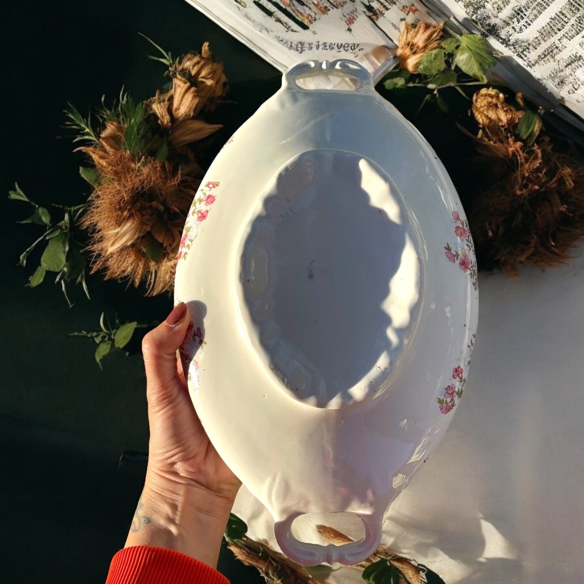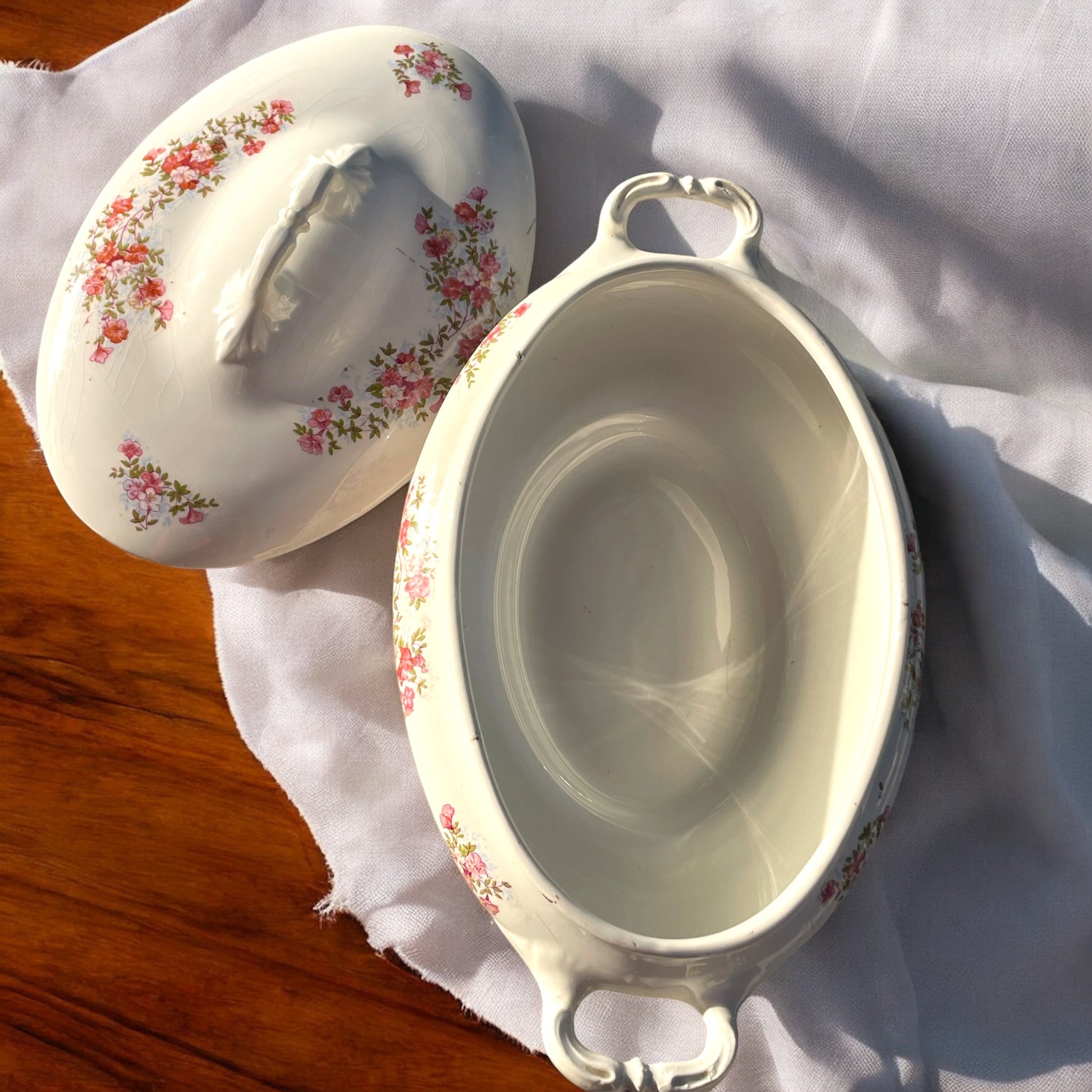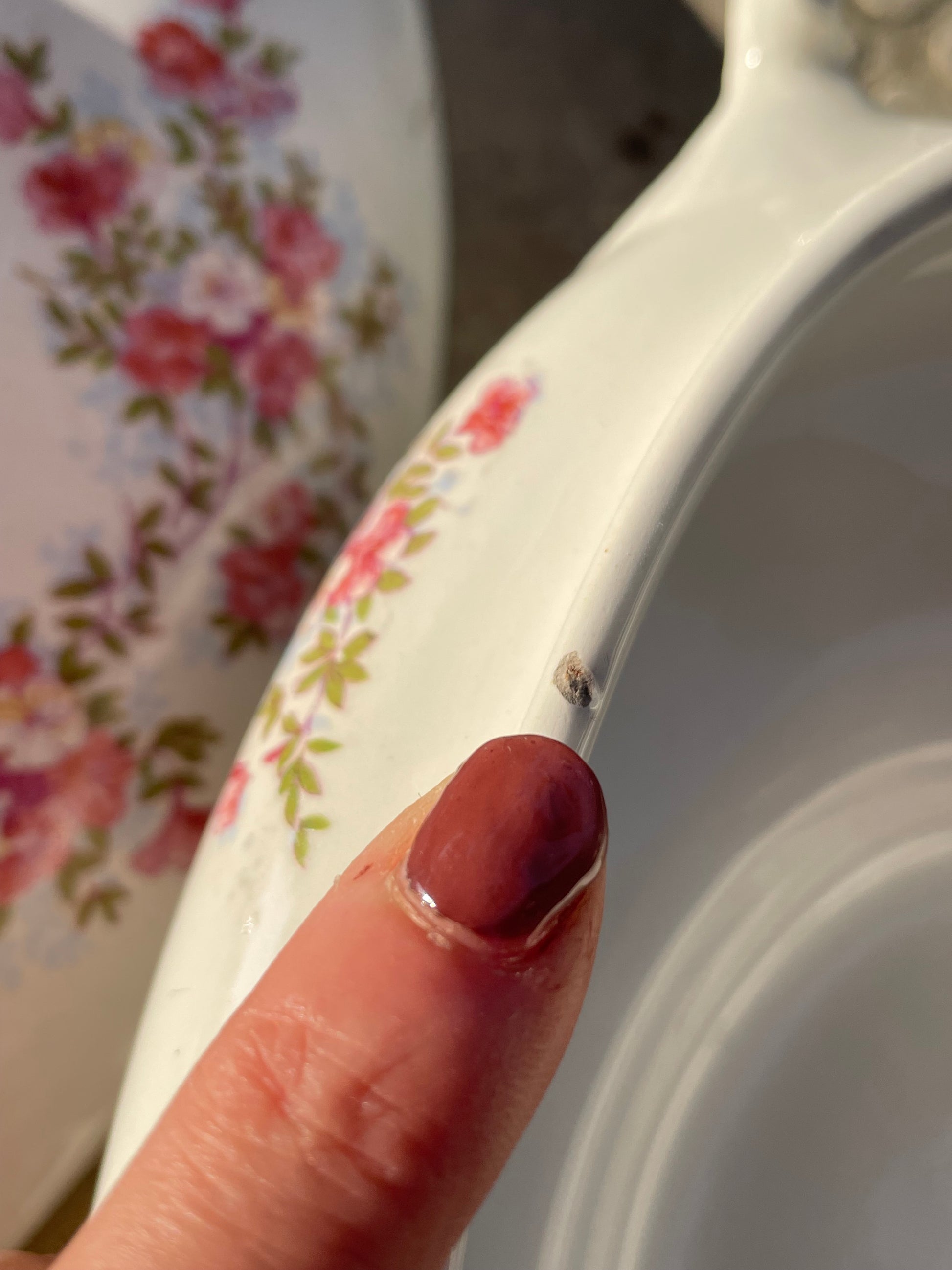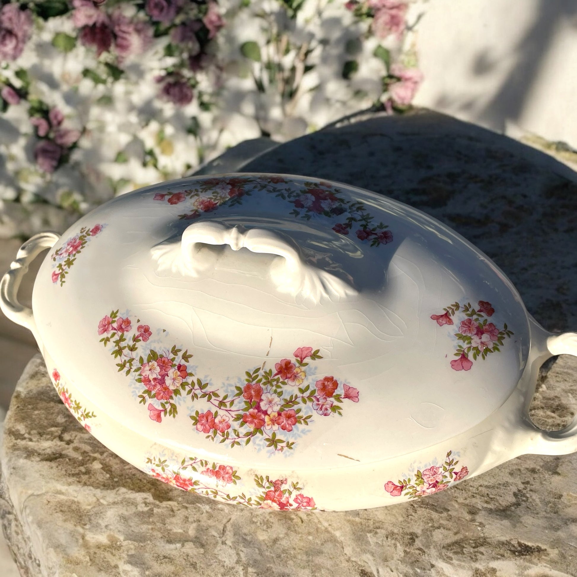 Adoro i decori delicati, essenziali, eleganti. Trovo questa zuppiera molto femminile e molto sobria, resa ancora più elegante dalla linea veramente slanciata. I piccoli fiorellini rosa che la adornano sono come delicati gioielli che indossa con parsimonia. Da manico a manico cm 33, piccolo segno del tempo ultima foto.