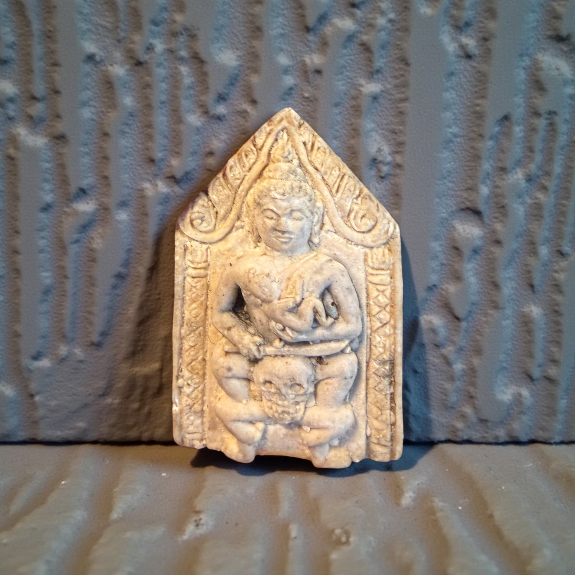Amuleto thailandese. Materiale: pasta sacra pressata (polvere di tempio, gesso, erbe rituali) Tecnica: stampo unico, produzione artigianale. Iconografia: figura spirituale (Phra Ngang/Kuman Thong ibrido) con teschio e bambino. Epoca: ca anni 1990