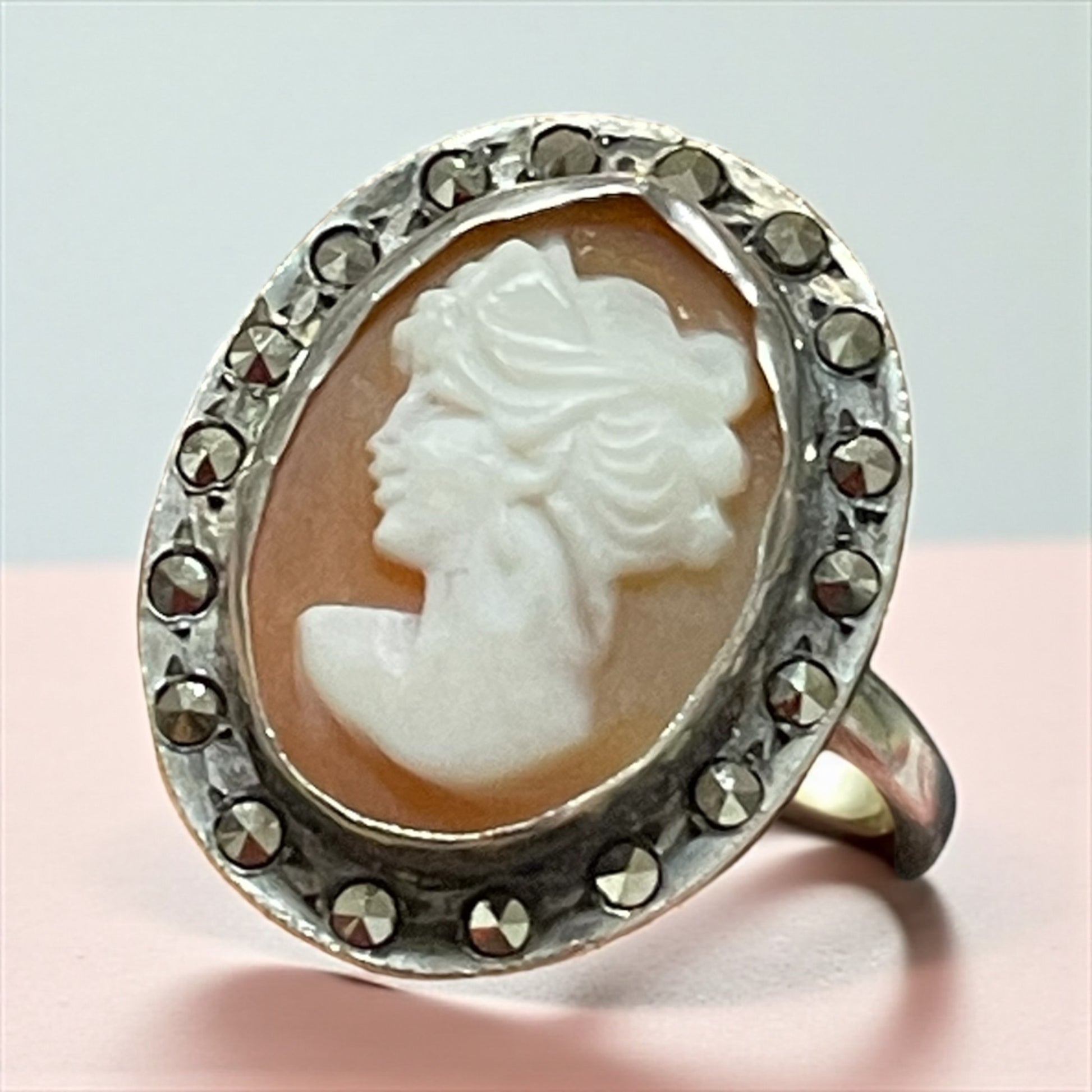 ⚒️ Materiali: Argento 800 punzonato, cammeo in conchiglia, marcasiti incastonate
