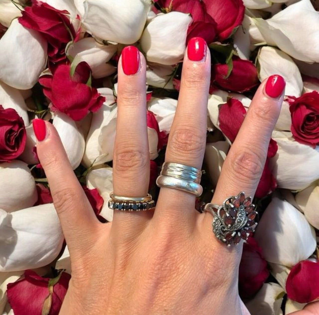 C’è un momento, quando il sole cala, in cui il rosso diventa quasi liquido. È la stessa luce che sembra vibrare in questo anello in argento, dove i granati almandini — tagliati a goccia e a navette — si accendono di riflessi rubino e rame. Intorno, le marcasiti disegnano arabeschi scintillanti, come piccole gocce di luce intrappolate nel metallo. Un gioiello dal fascino retrò, importante ma raffinato, capace di catturare lo sguardo e raccontare una femminilità intensa e senza tempo.