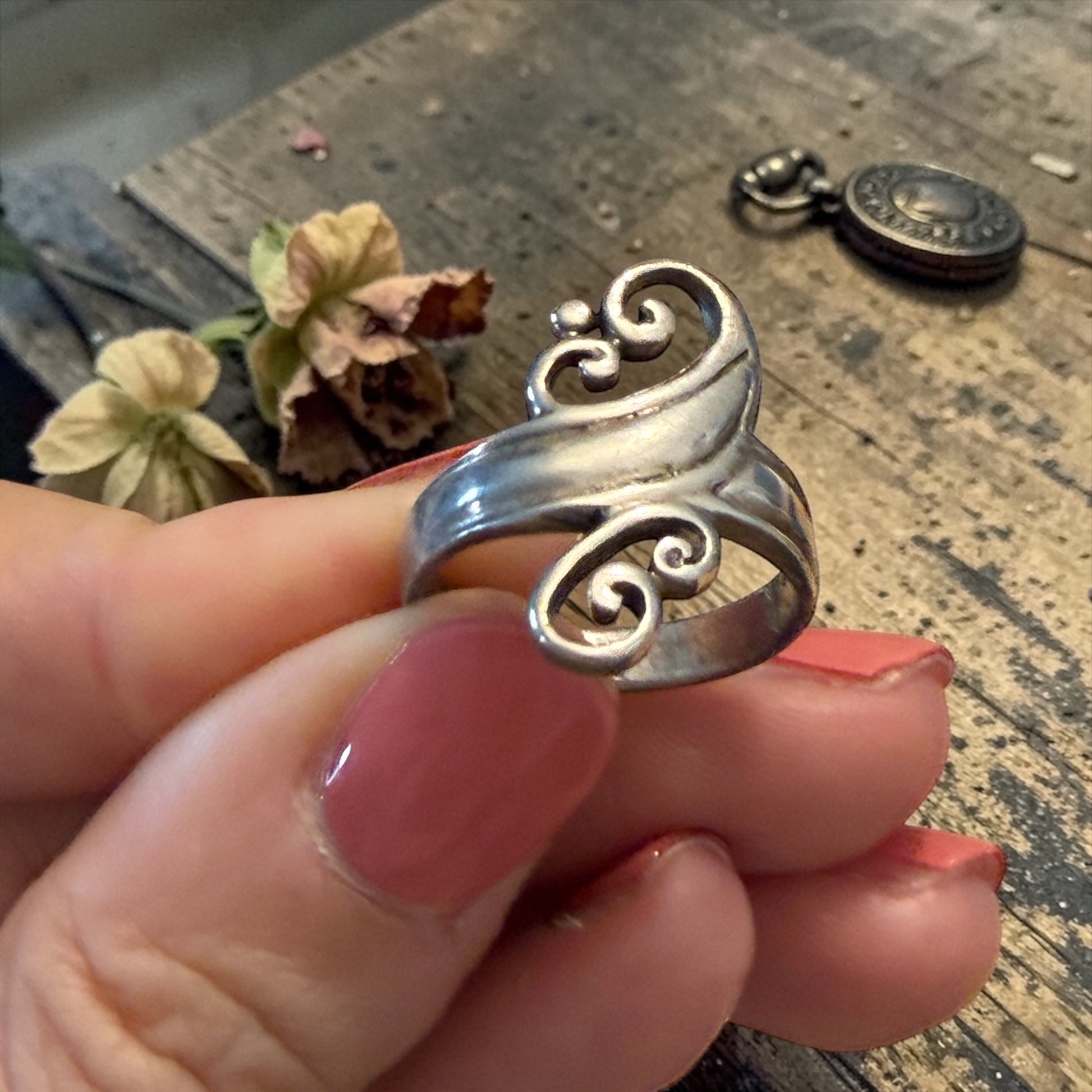 Questo anello in argento 925 si avvolge attorno al dito con linee morbide, quasi vegetali, come un piccolo tralcio che cresce senza fretta. Le volute non sono perfettamente simmetriche, e proprio per questo sanno giocare con lo sguardo e attirare l’attenzione.
