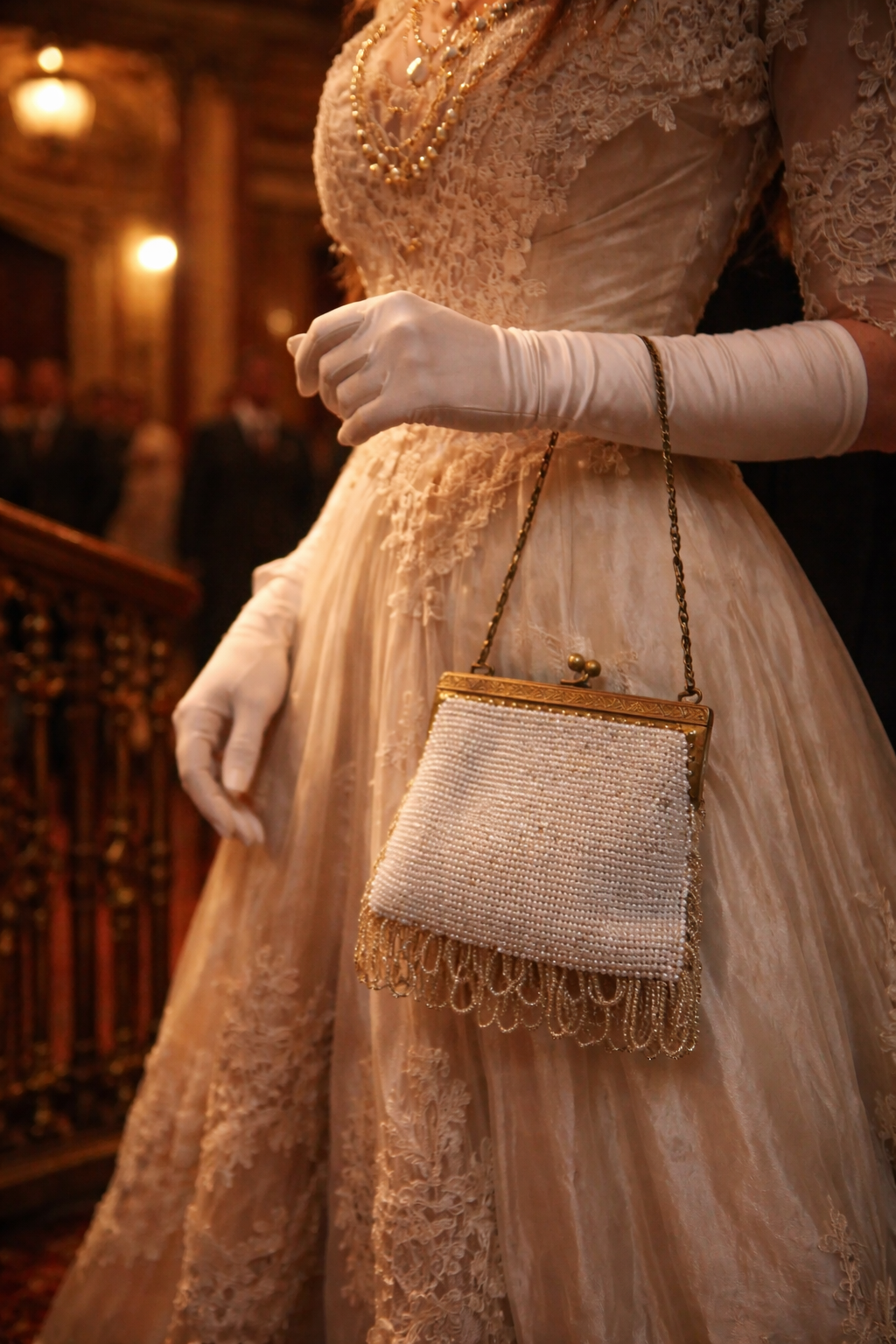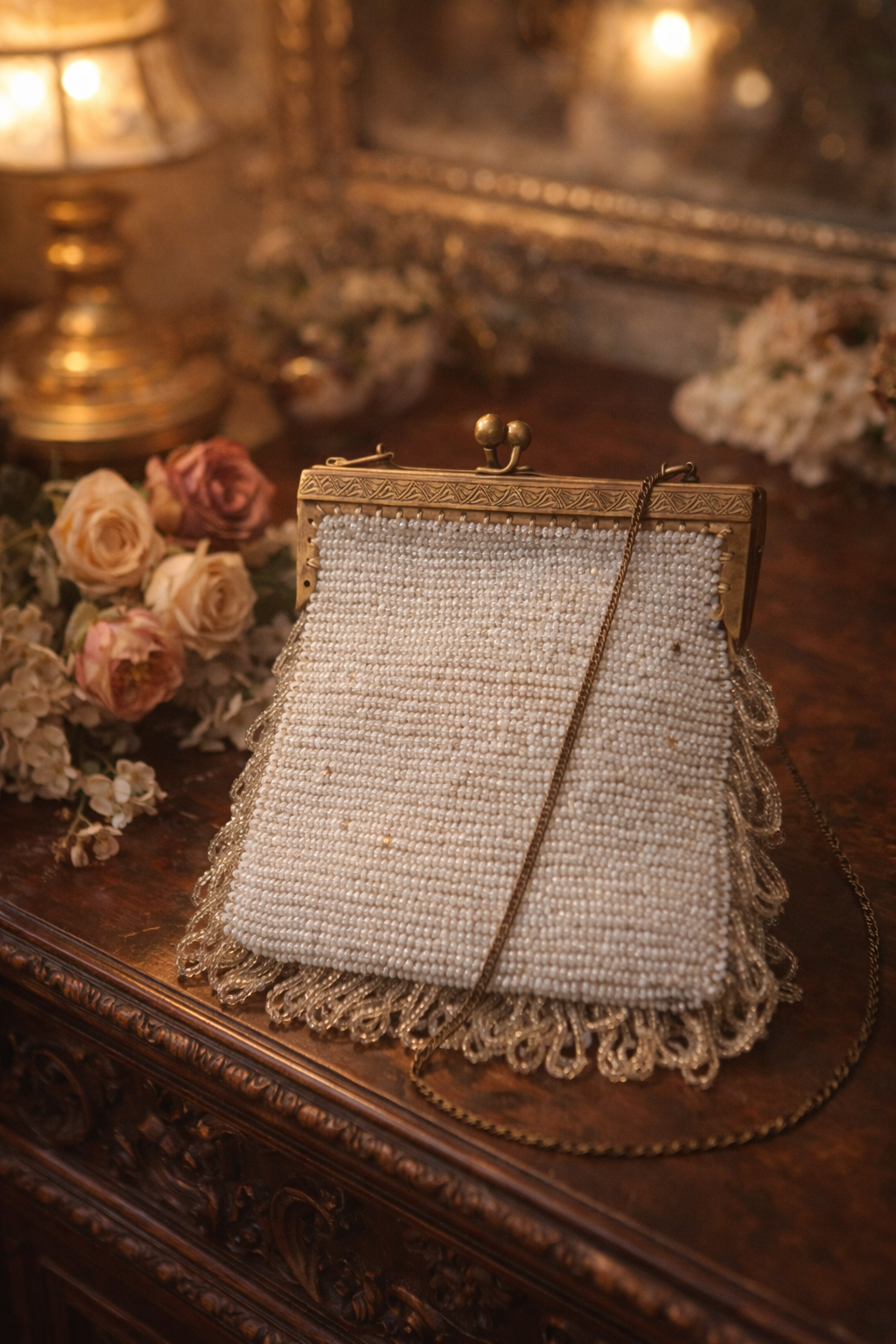 La appoggiò sul comò mentre la stanza si riempiva del fruscio dell’abito appena indossato. Era il 1908, e quella sera il teatro l’aspettava. Non uno di quegli appuntamenti mondani obbligati, ma una di quelle rare occasioni scelte con cura, in cui ogni dettaglio aveva un peso: l’ora, il profumo, il gesto lento delle mani. Prese la borsetta quasi senza guardarla, come si fa con le cose fidate. Le microperline chiare catturarono subito la luce della lampada, restituendola morbida, discreta. Le frange si mossero appena, come se riconoscessero il momento. La chiusura scattò con un suono secco, sicuro — nulla di fragile, nulla di incerto. Dentro, poche cose essenziali: un fazzoletto ricamato, una spilla, una lettera piegata con attenzione. Nulla di superfluo. Nulla di urgente. La catena scivolò sul polso mentre attraversava l’ingresso, e per un istante si fermò davanti allo specchio. Non per controllarsi davvero, ma per concedersi il lusso di sentirsi pronta. La borsetta completava il gesto, non l’abito. Era il segno silenzioso di una presenza composta, di un’eleganza che non aveva bisogno di essere notata. A teatro, tra il velluto delle poltrone e il brusio sommesso della sala, la tenne accanto a sé. Integra. Ordinata. Discreta. Come se sapesse esattamente quale fosse il suo posto. Oggi, più di un secolo dopo, quella stessa borsetta arriva fino a noi in condizioni sorprendentemente ottime. Le perline sono ancora compatte, le frange leggere, la struttura solida. Non porta i segni della fretta, ma quelli di chi è stato scelto con rispetto.