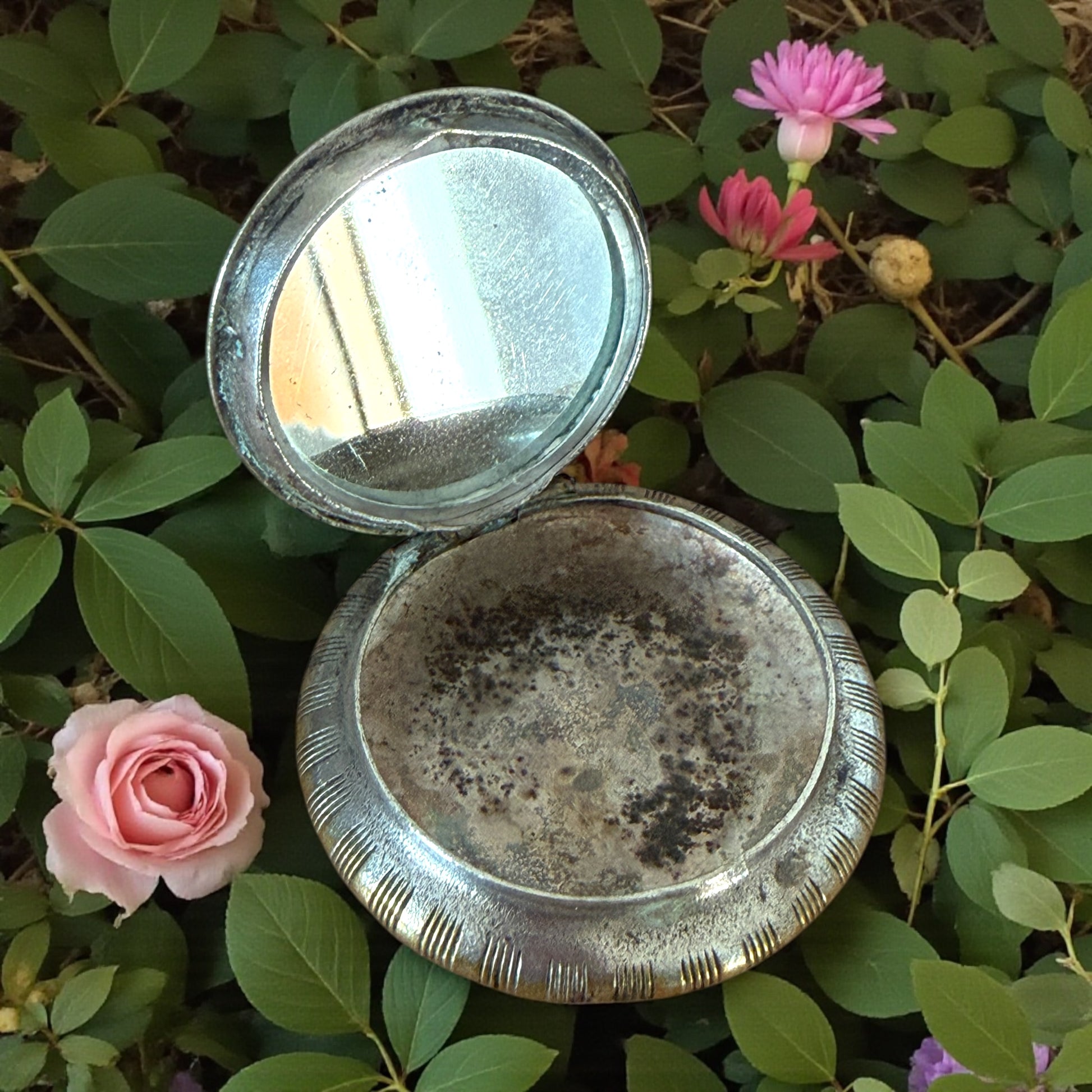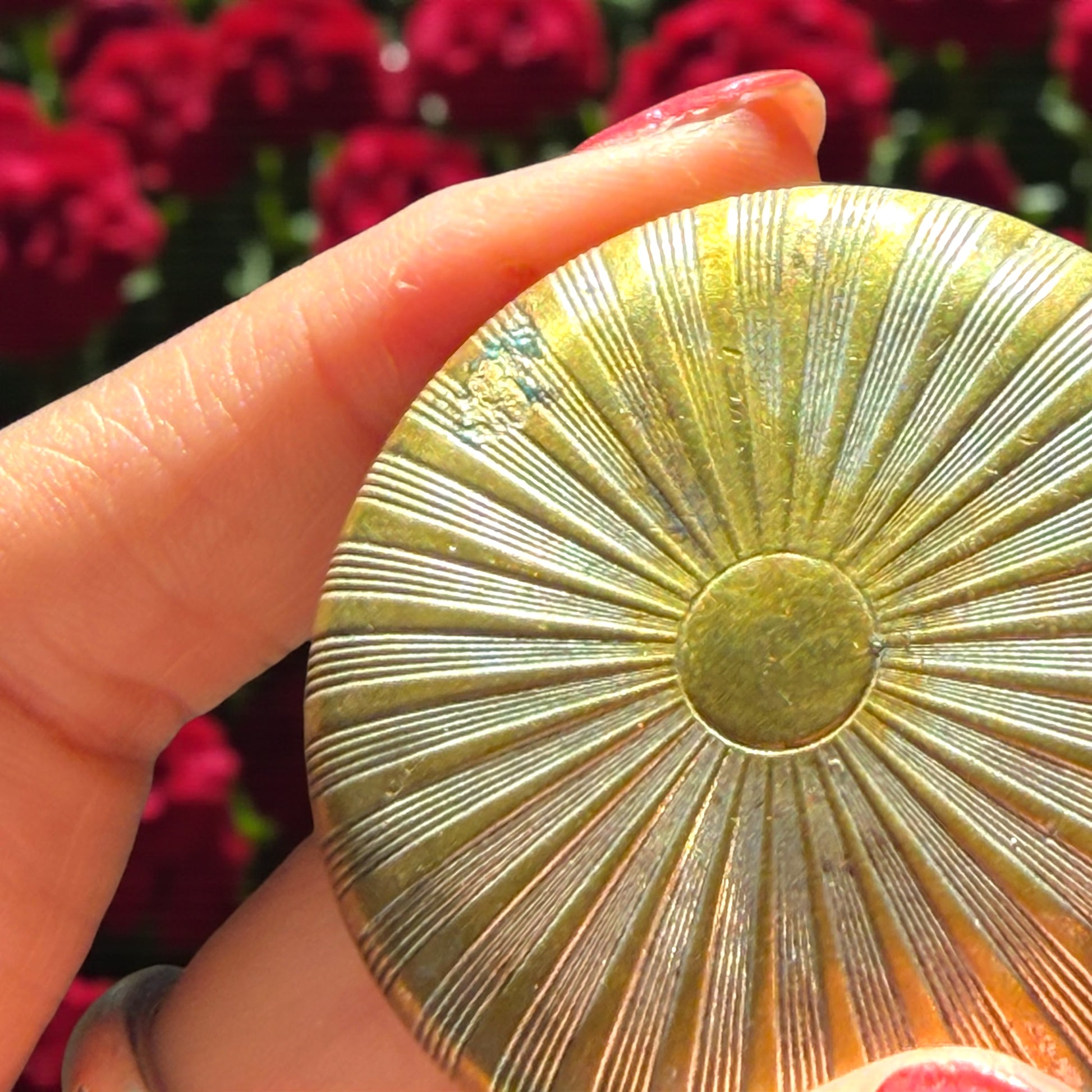 C’è una grazia silenziosa in ciò che ha attraversato il tempo… e non è forse per questo che facciamo questo lavoro con passione? Affinché la memoria torni a splendere. Questa piccola cipriera in argento massiccio risale agli anni ’30, quando ogni gesto femminile sembrava un rituale di eleganza. La sua superficie incisa a raggiera conserva ancora riflessi dorati, tracce della sua antica doratura ormai svanita, come un sole che non ha smesso di brillare del tutto. Il punzone (lo vedete sulla parte a raggi), ormai illeggibile, è ciò che resta di un’origine nobile. L’abbiamo testata con reagente: è in argento pieno. Non è stata lucidata: la sua patina racconta il tempo che è passato, e verrà mantenuta così — a meno che chi la scelga non desideri ridarle lucentezza, nel qual caso provvederemo ad esaudire il suo desiderio.